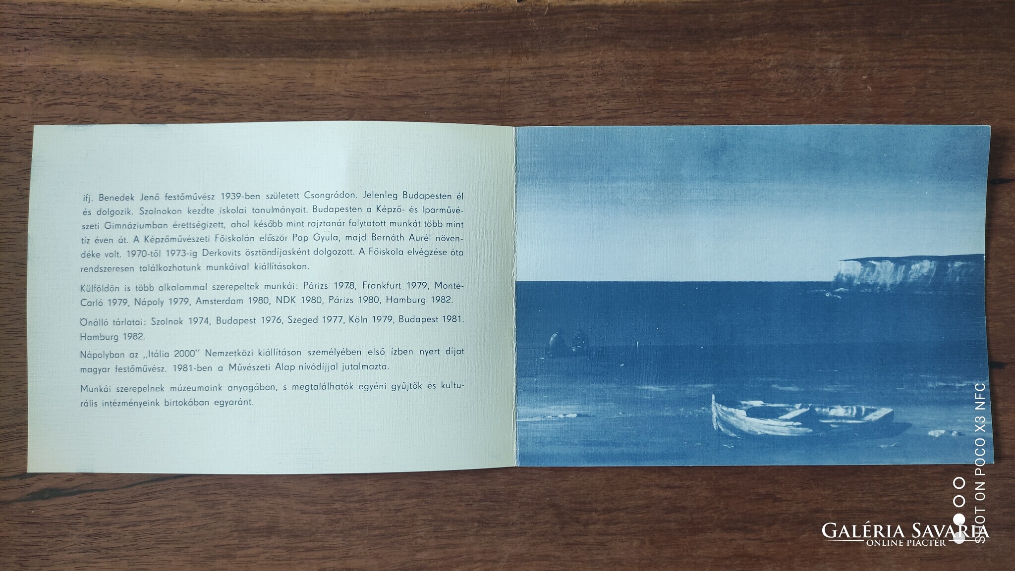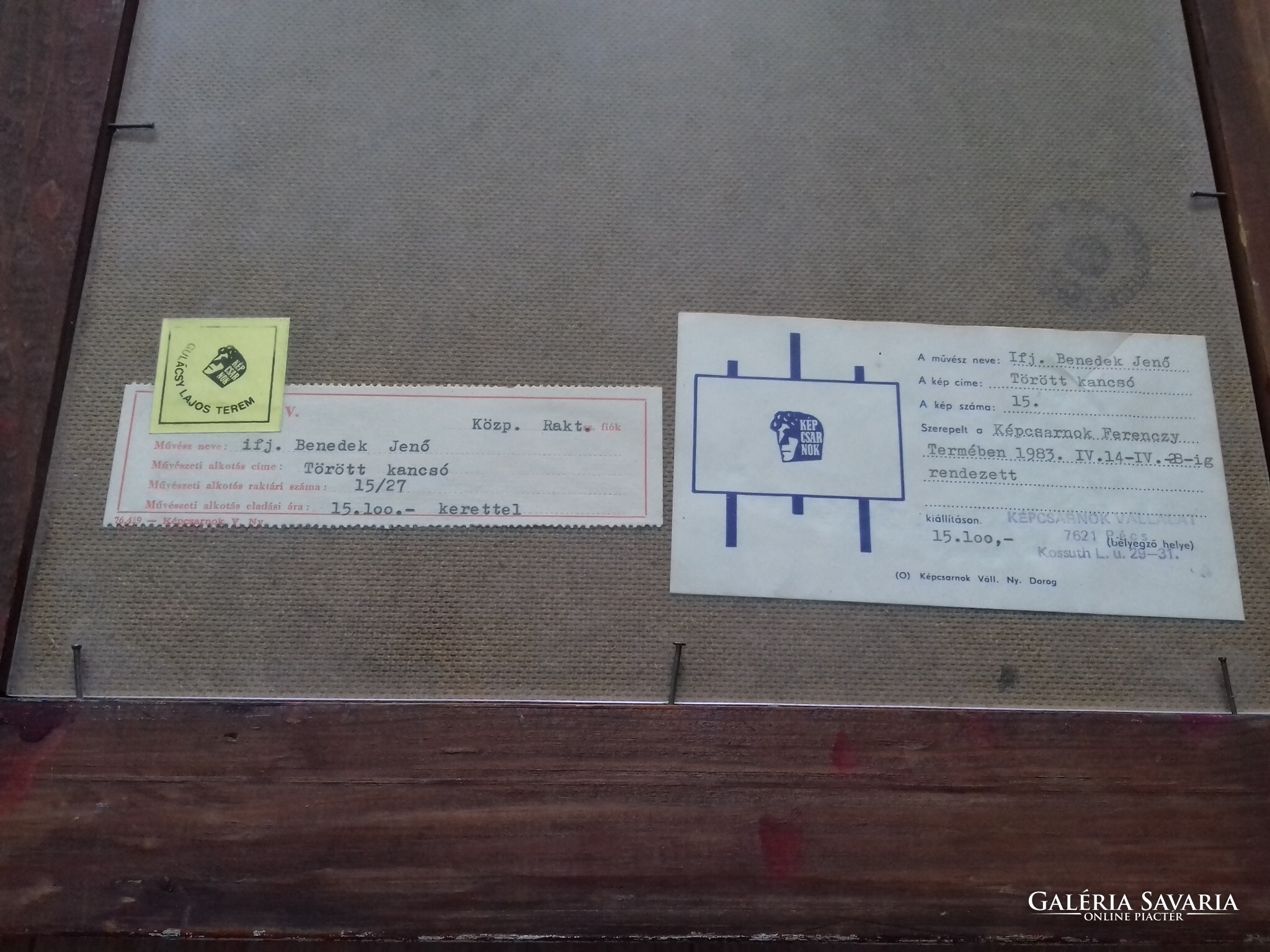 A festményhez jár a hátsó oldalán jelölt Képcsarnok vállalat pécsi Ferenczy Termében - 1983. április 14 - 28. - megrendezett képcsarnokos kiállítás eredeti Meghívó + a festőről egy színes képekkel, adatokkal teli életrajzi leírás.
