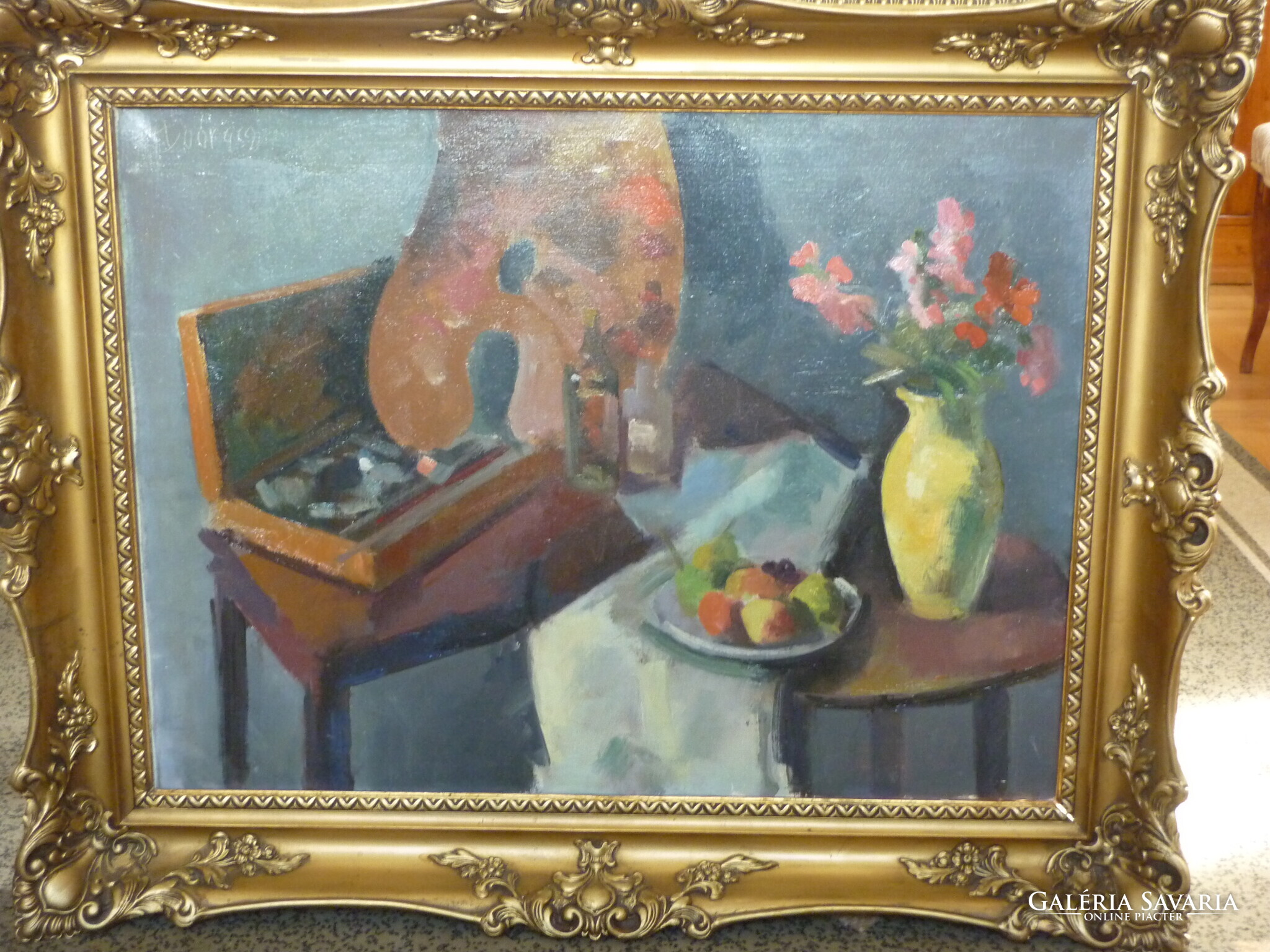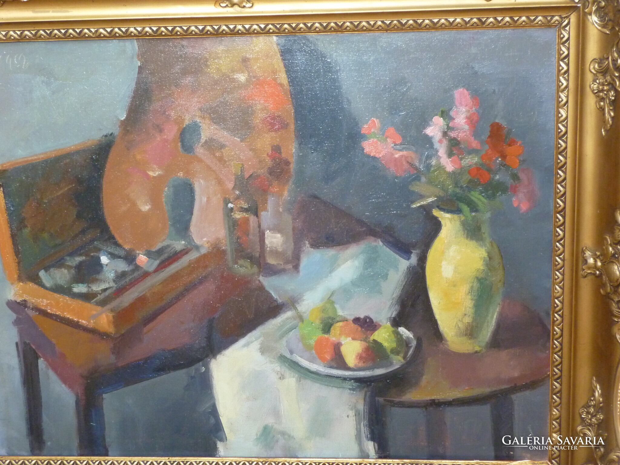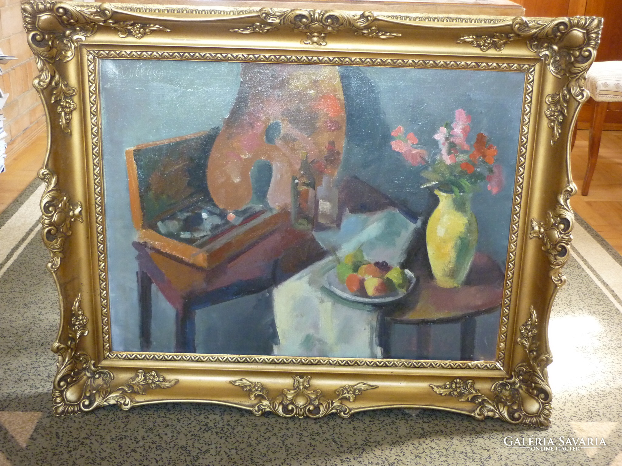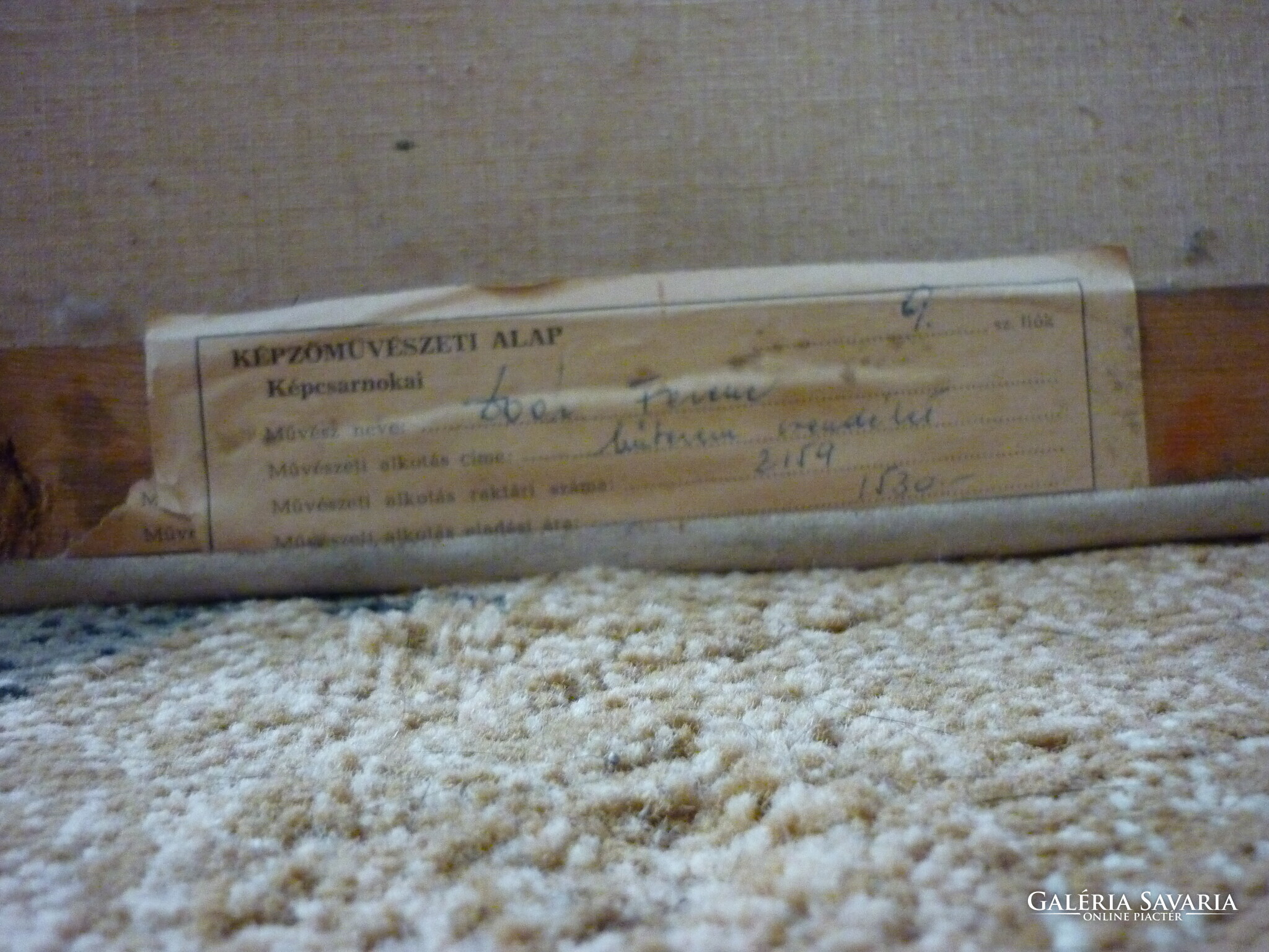 Eladó Doór Ferenc / Virágcsendélet című olajvászon festménye. Mérete 80*60 cm, szignózott jelzés: balra fent. Hátoldalán Képcsarnokos vignettával. 1959-ben készült. Azonnal falra akasztható, szobai állapotú darab. A fotón a blondel keret csak illusztráció, nem része az eladásnak.
