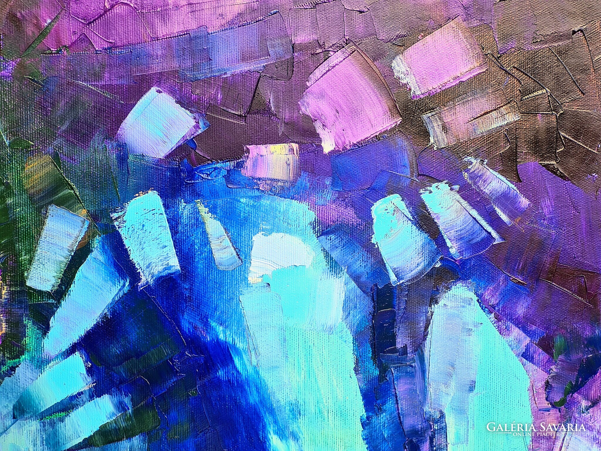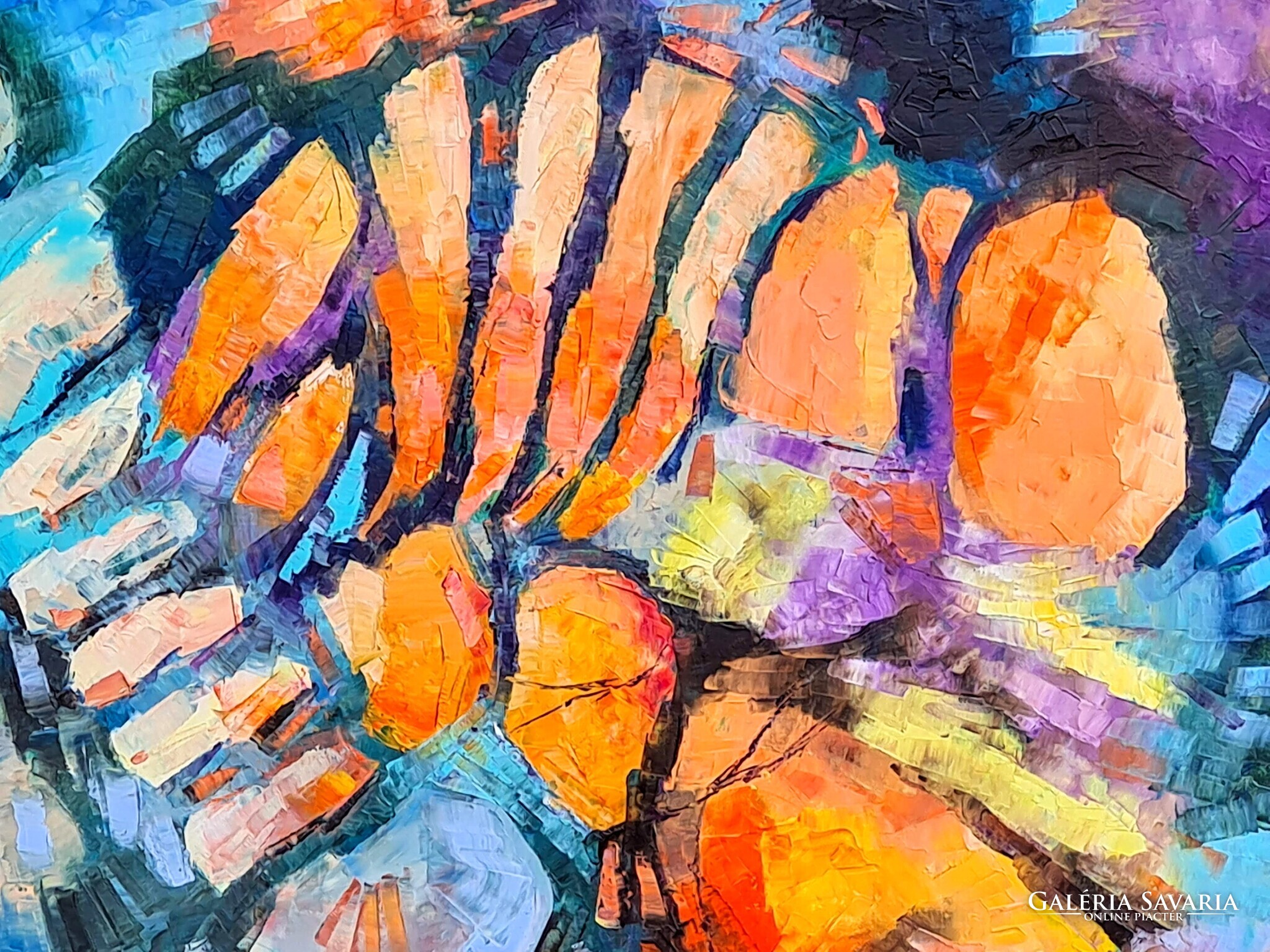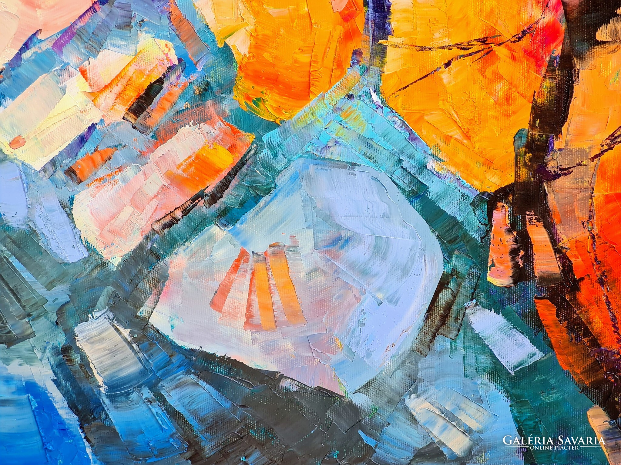 A kép 120x120cm méretű olajfestmény, klasszikus és modern belsők dísze és éke. Eőteljesen strukturált, nagy gesztusok és finom részletek jellemzik.