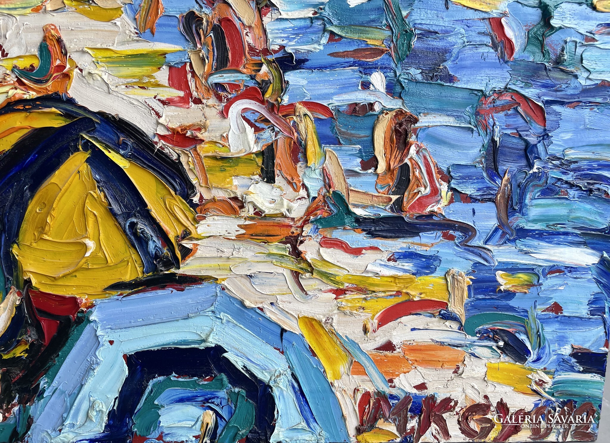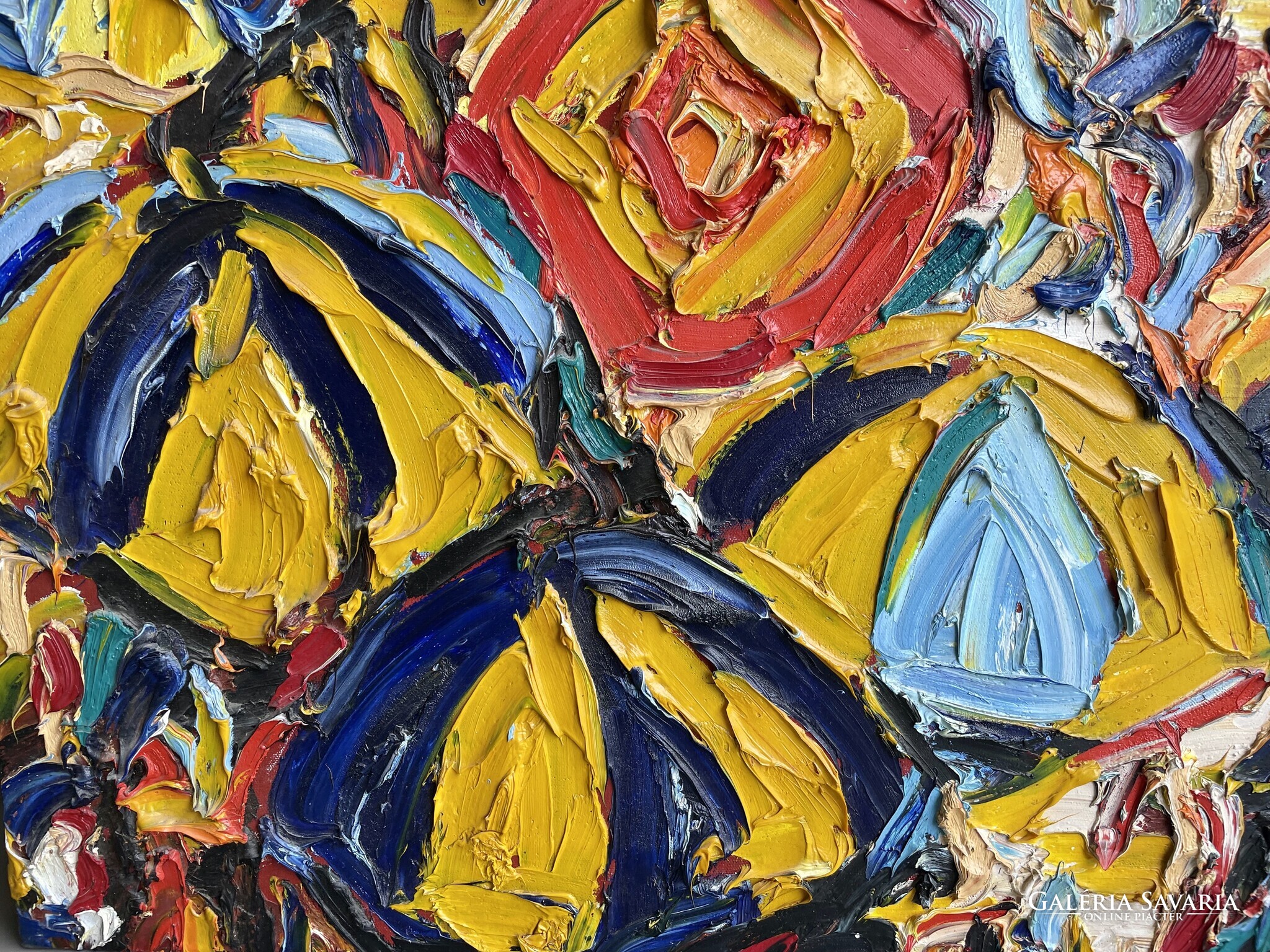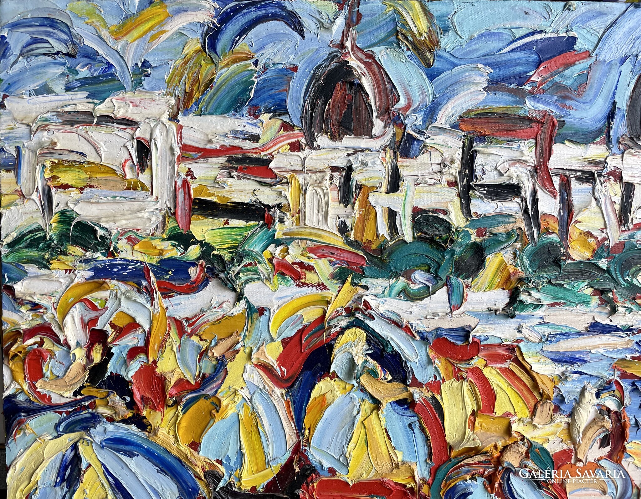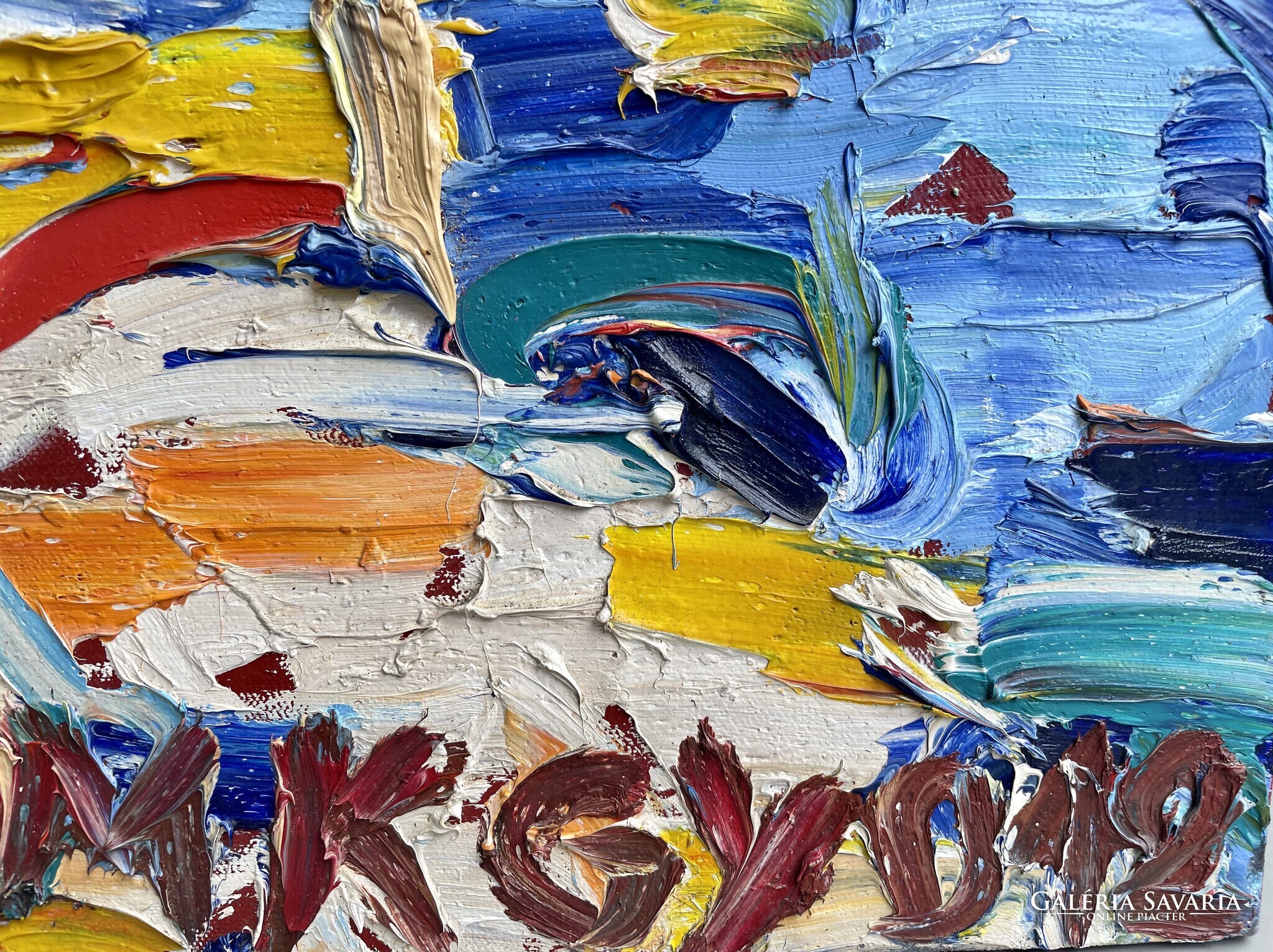 Nagy méretű remek kvalitású alkotás, a zseniális művész barátjának a gyűjteményéből. Pompás színekkel megfestett expresszív alkotás, amelynek tér kell, hogy kellő módon lehessen szemlélni. Nappaliba de akár egy iroda, szalon falán is vonza a tekintetet. Mérete 100x130cm!