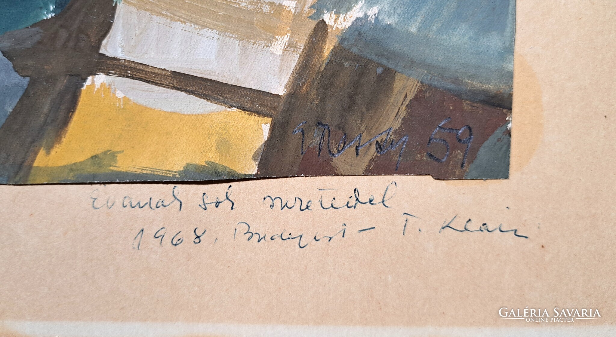 Eigelne Tassy Klára (1922-2001, Eigel Istvánné) eredeti alkotása. Jelzett jobbra lent: E. Tassy. A paszpartun a művész által sajátkezűleg írt ajándékozási szöveg olvasható: "Évának sok szeretettel 1968, Budapest - T. Klári"