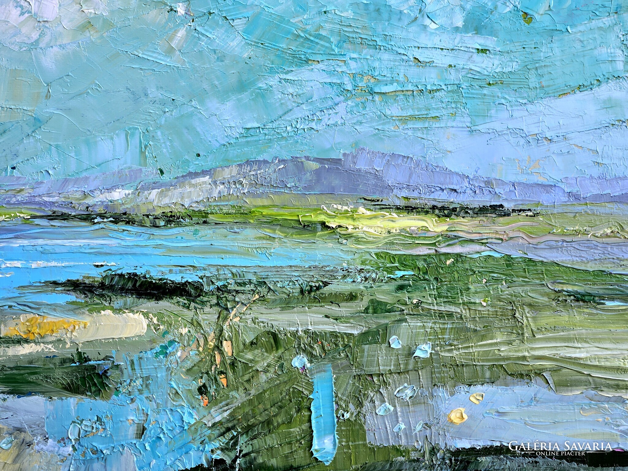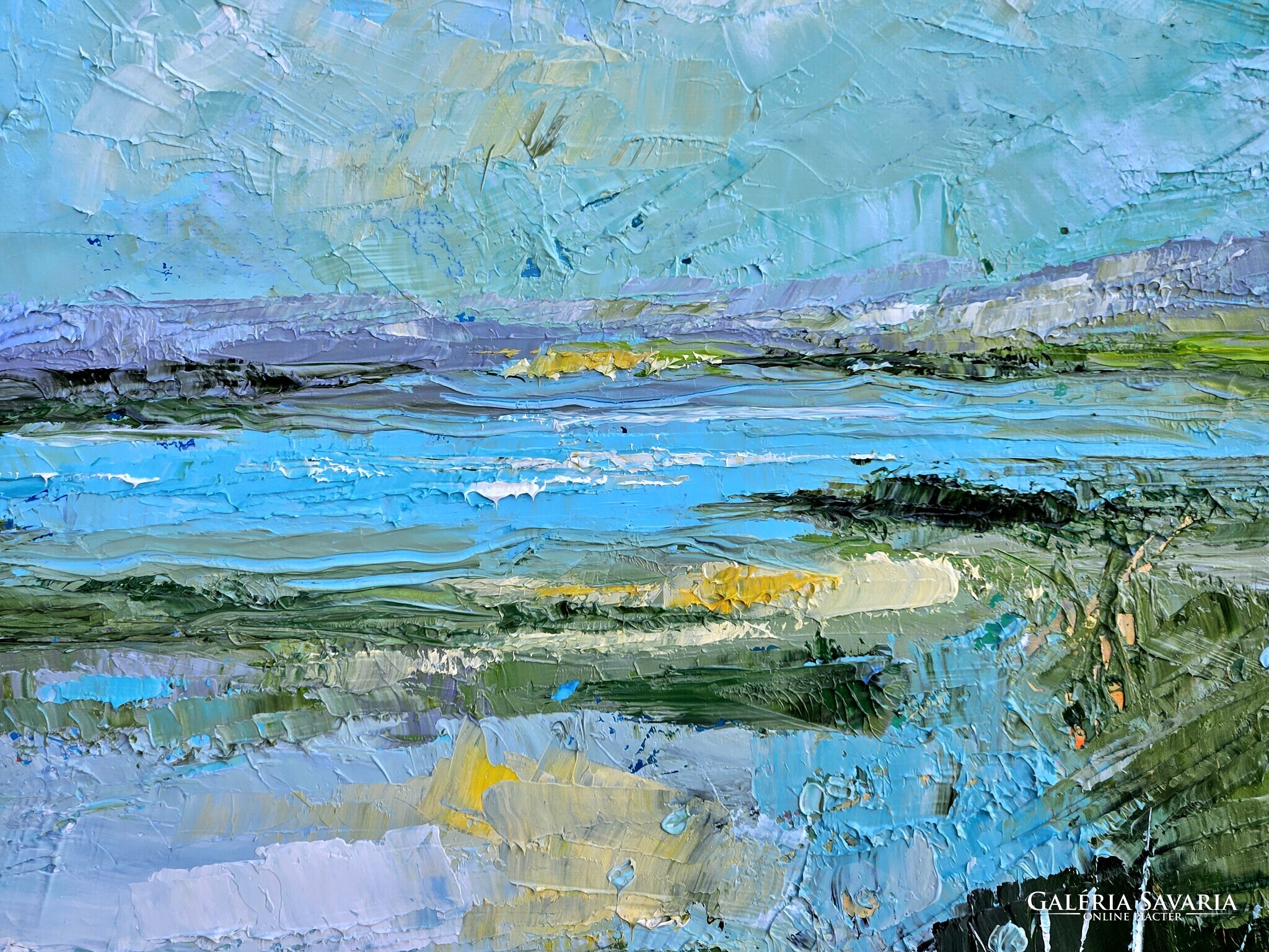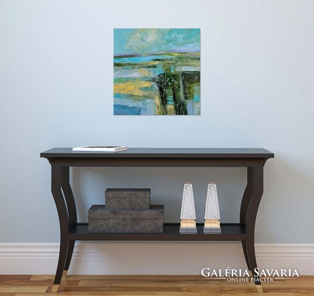 Erősen strukturált kép a kékek és zöldek játékával. Klasszikus és modern otthonok ékessége, azonnal falra akasztható.