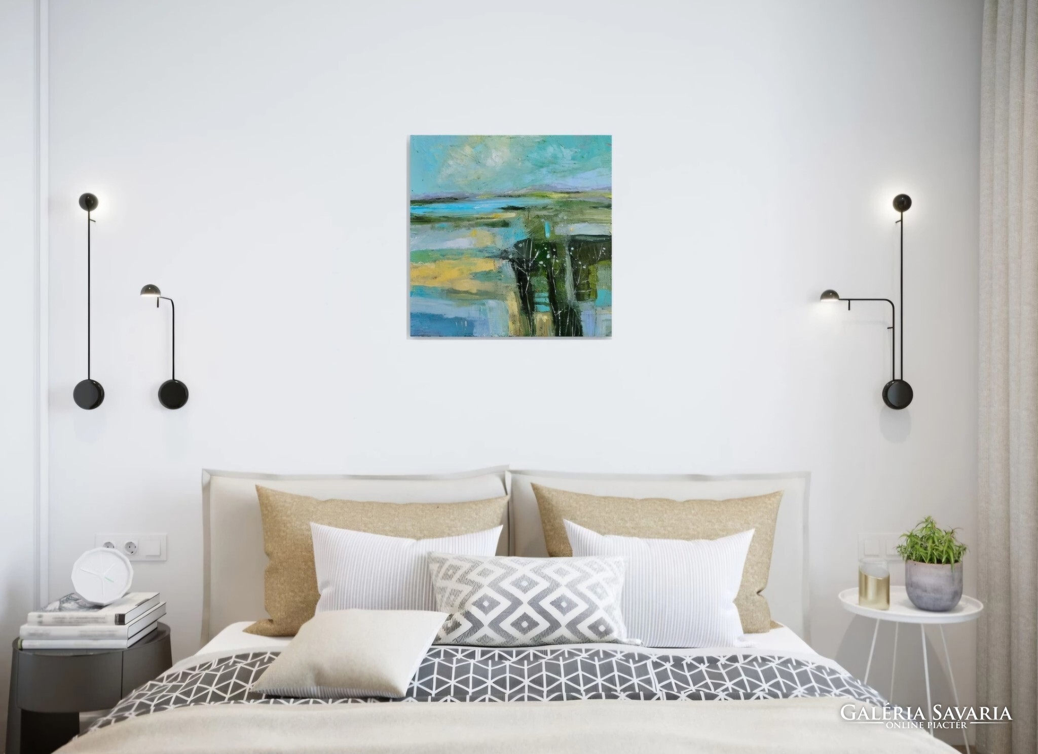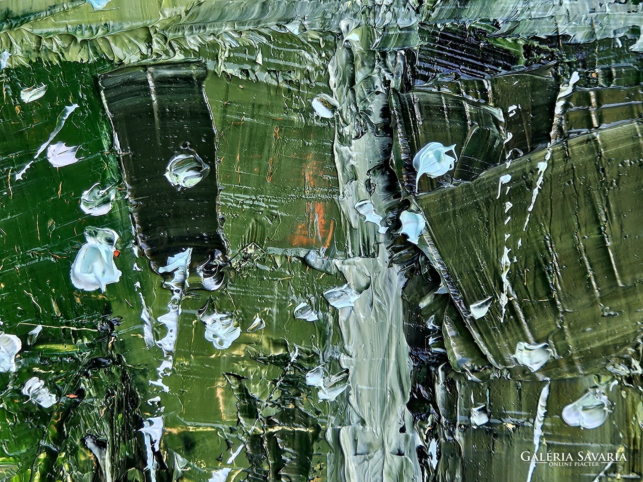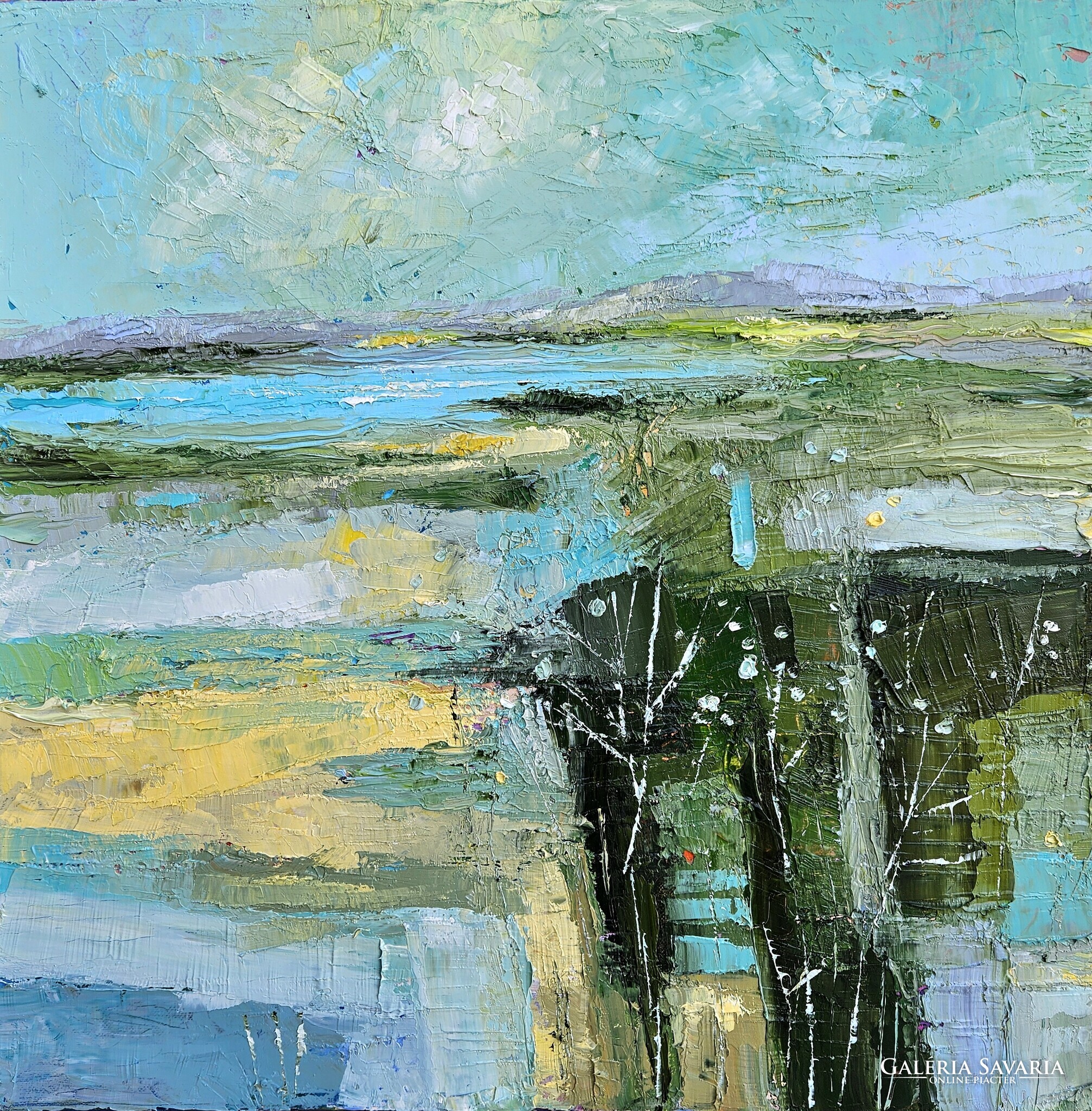 Erősen strukturált kép a kékek és zöldek játékával. Klasszikus és modern otthonok ékessége, azonnal falra akasztható.