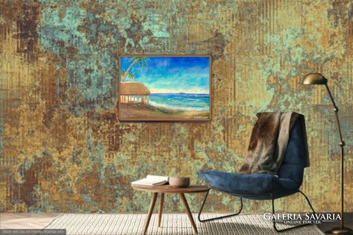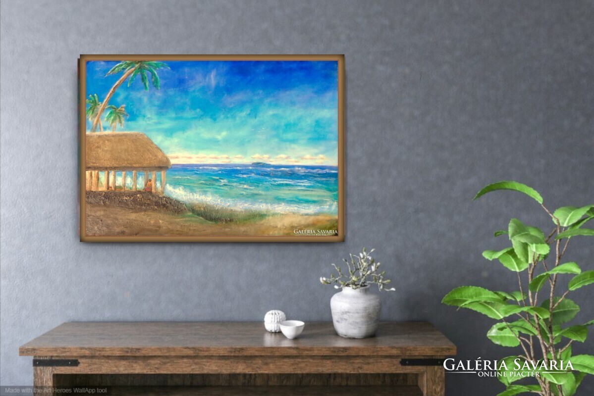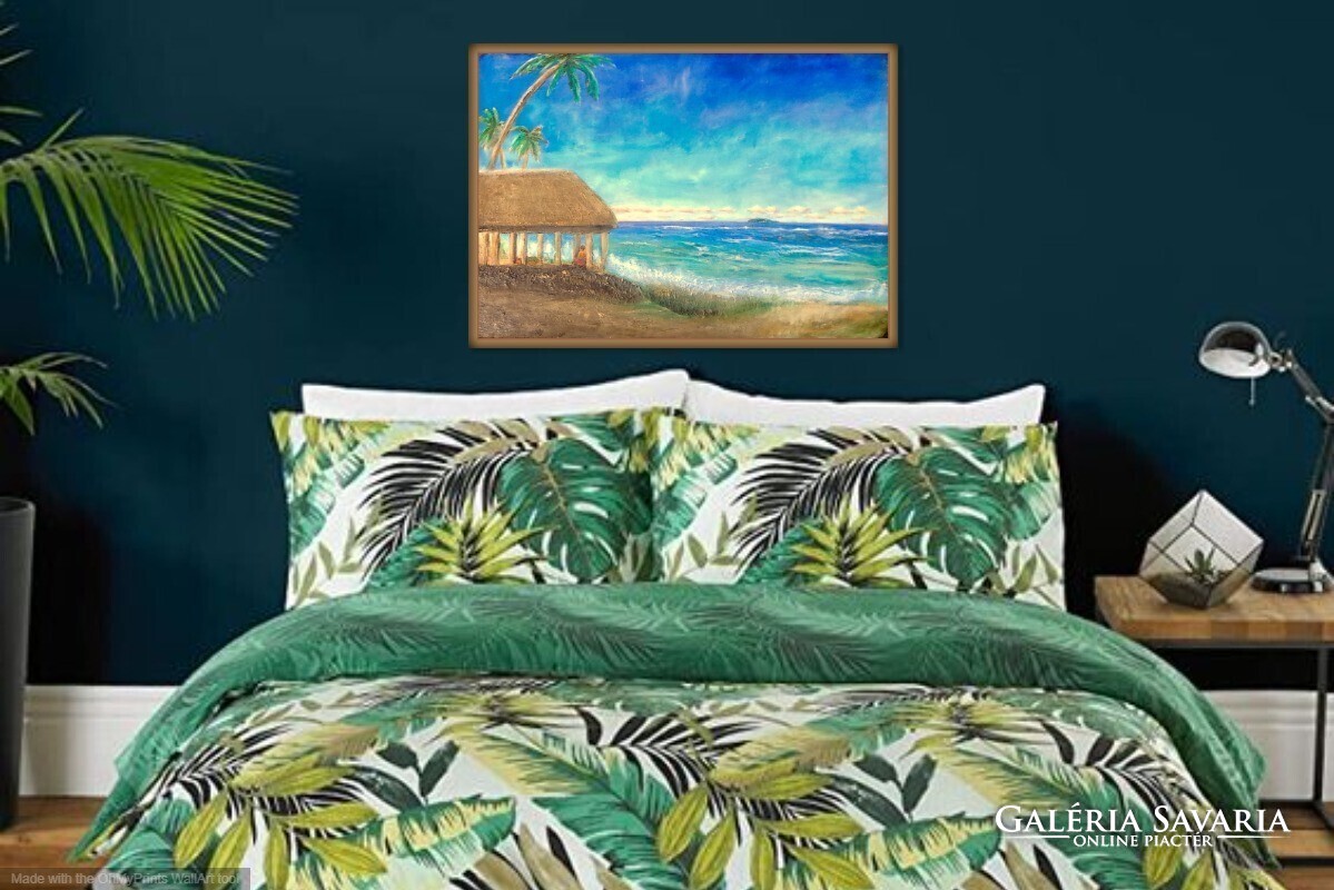 A pálmák és a part menti kunyhó egy elveszett világ hangulatát idézik, ahol az ember még együtt létezett a természettel.