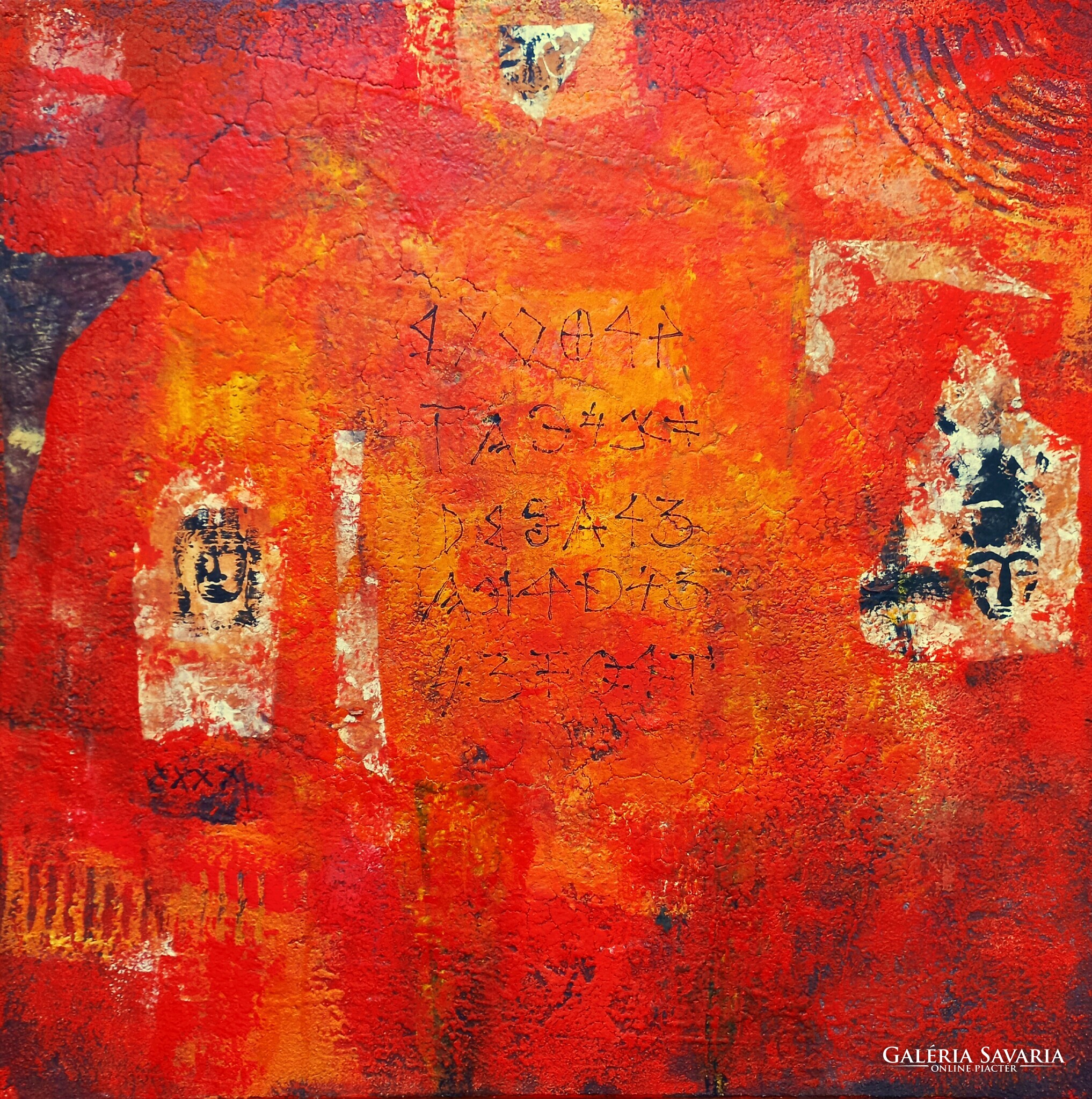 Gedeon Irén kortárs festő, Parampara apáról fiúra szálló tanítás, Vászon, akril, vegyes technika 58 x 58 cm, hátoldalán jelzett.