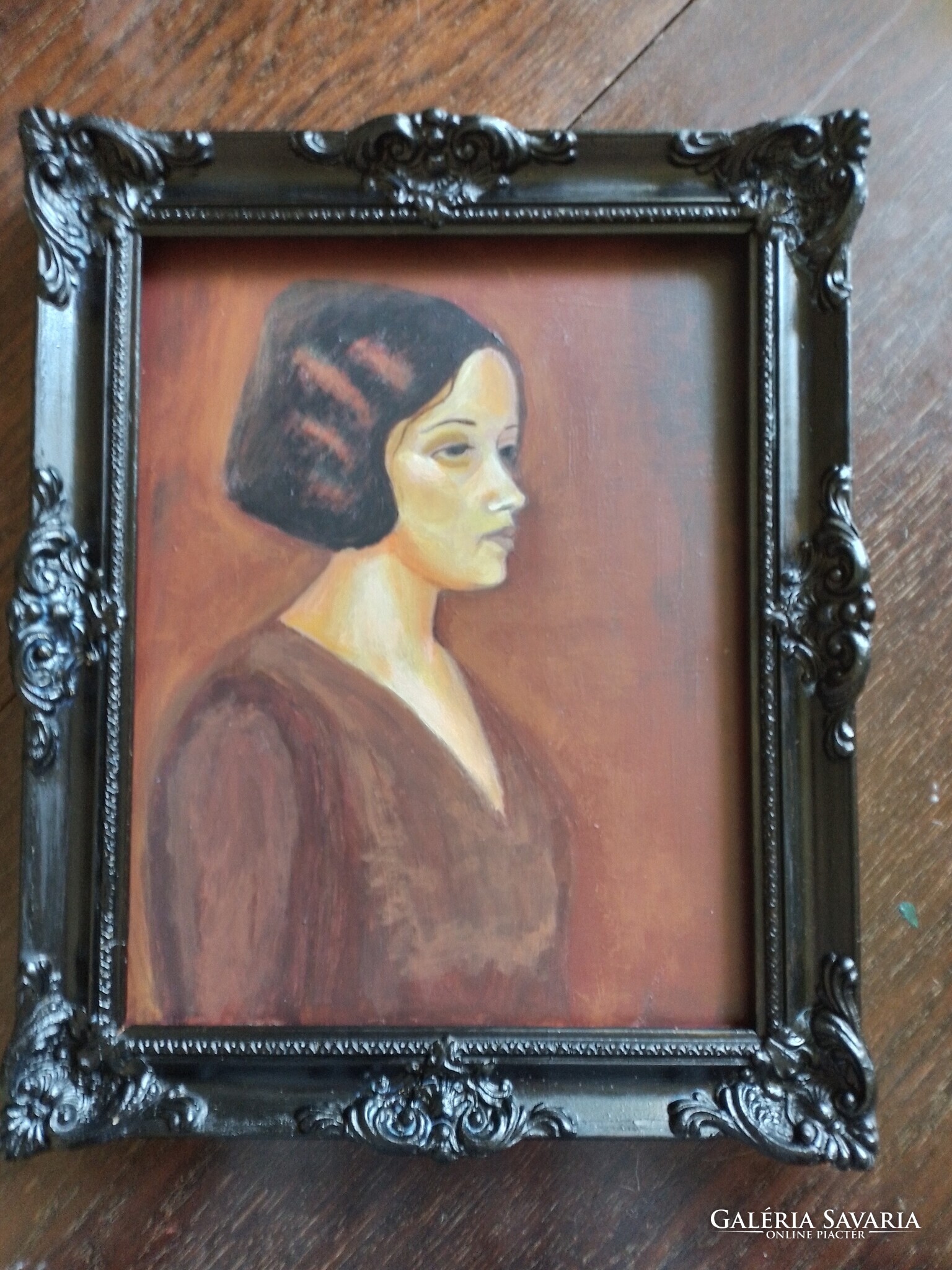 A kép egy meleg háttér előtt álló szép nőt ábrázol félprofilból. A ruhája szinte beleolvad a háttérbe. A modell kinéz a képből. Van benne valamiféle rezignáció, melankólia. Nincs rajta semmi dísz, semmi ékszer. Hajnának hullámait látjuk és egy tincset, ami kiszabadult ebből a merev, fegyelmezett világból.