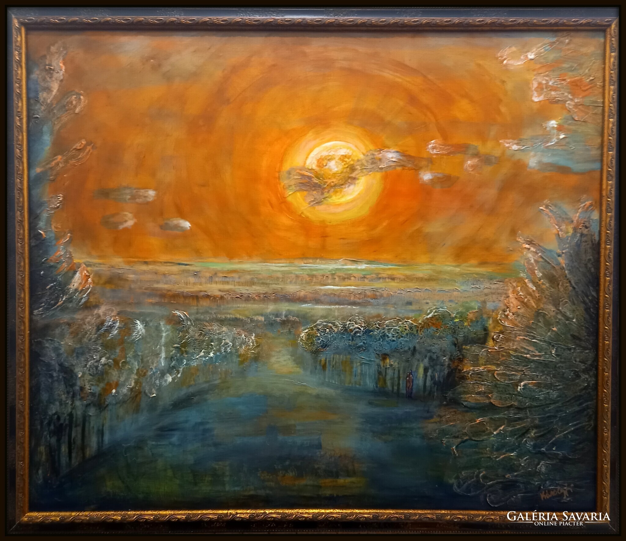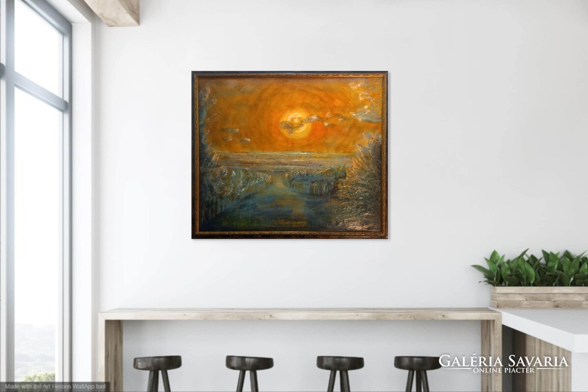 102x87 cm-es vászonkép kerettel. A kép felülete félig dombormű.