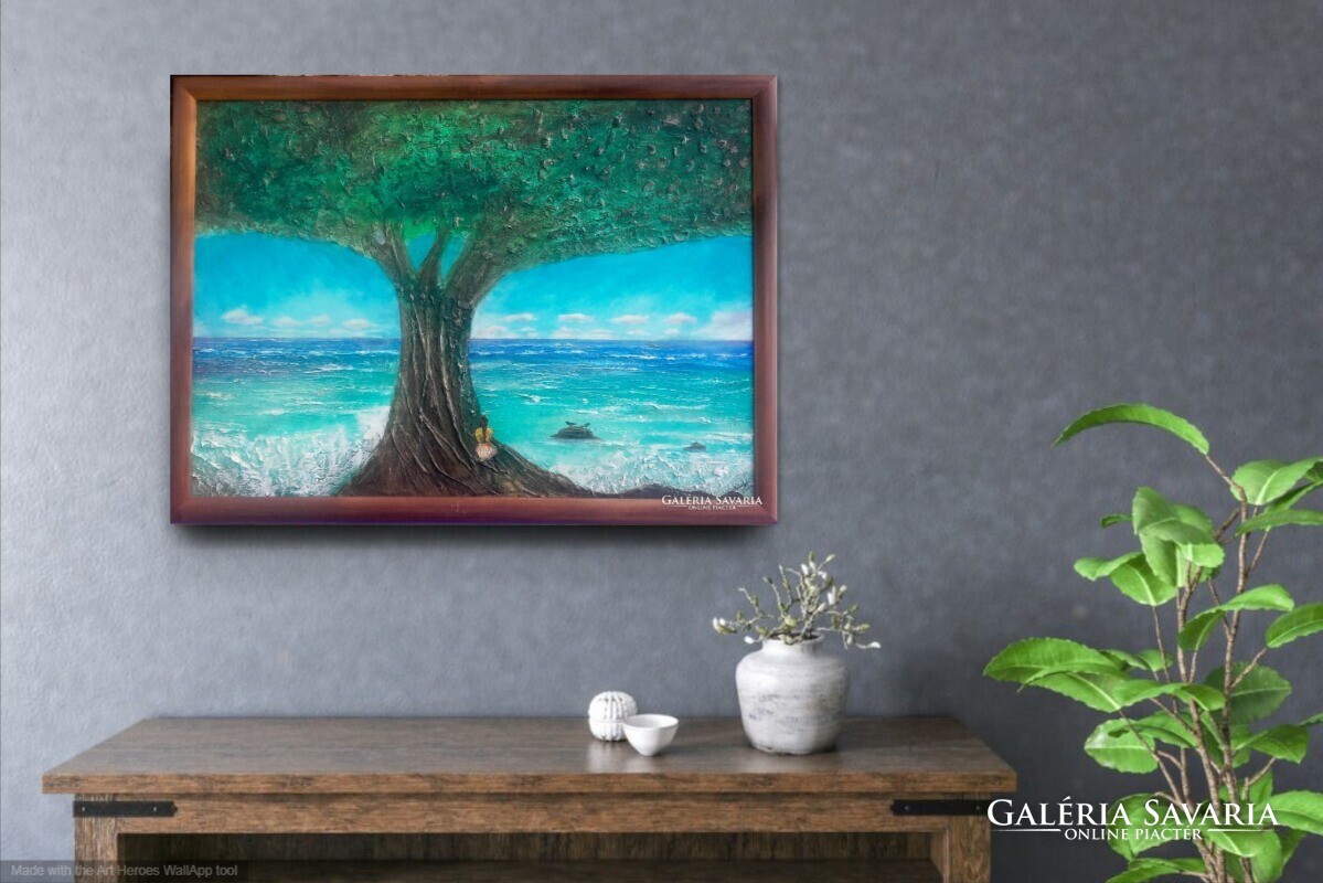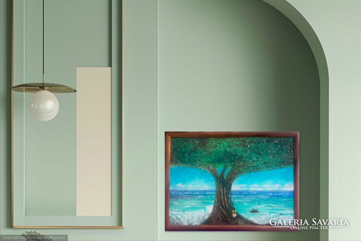 Zalaegerszegen a színház aulájában látható ez a 70x100 cm-es képem., október 12-ig. (eladó) Életem legnagyobb utazásához köt, ez a Csendes-óceánt ábrázoló kép, partján fikuszfával. Egy madárfaj az egész napos portyázása után ide tért nyugovóra, és estefelé már csicsergőfának is nevezhettük. Hihetetlen, hogy amit itthon cserépben pátyolgatunk, az eredetileg hatalmas fává tud nőni.