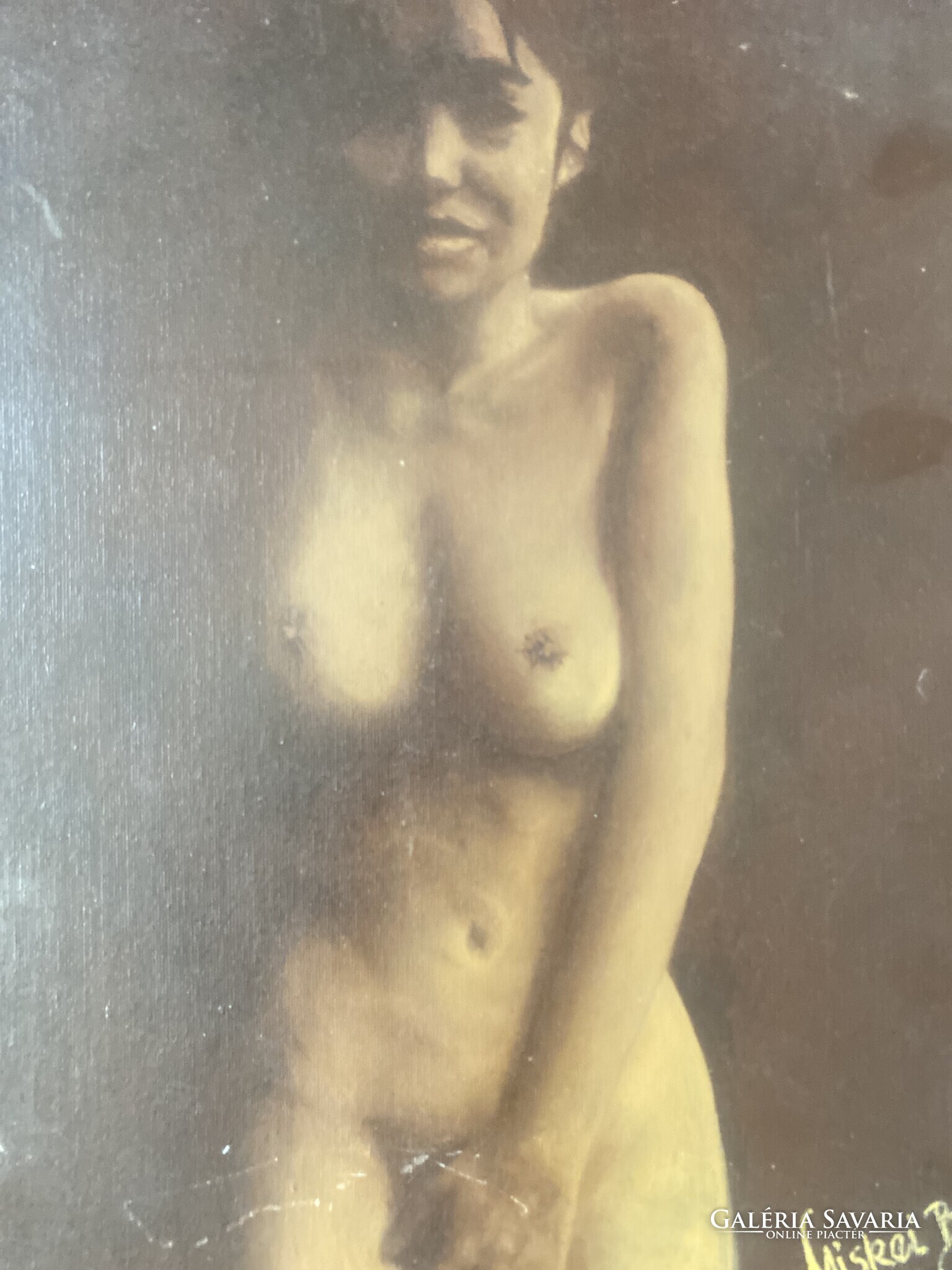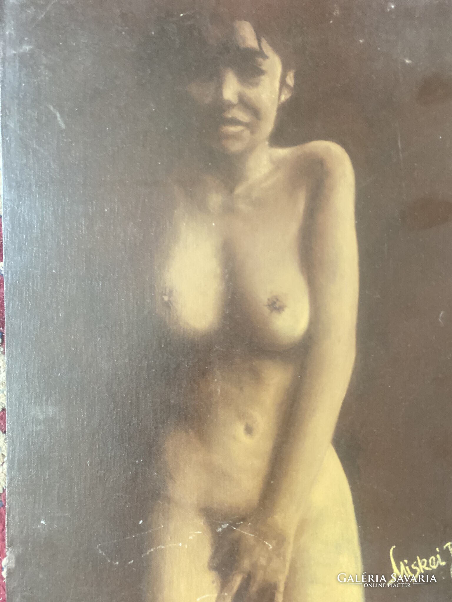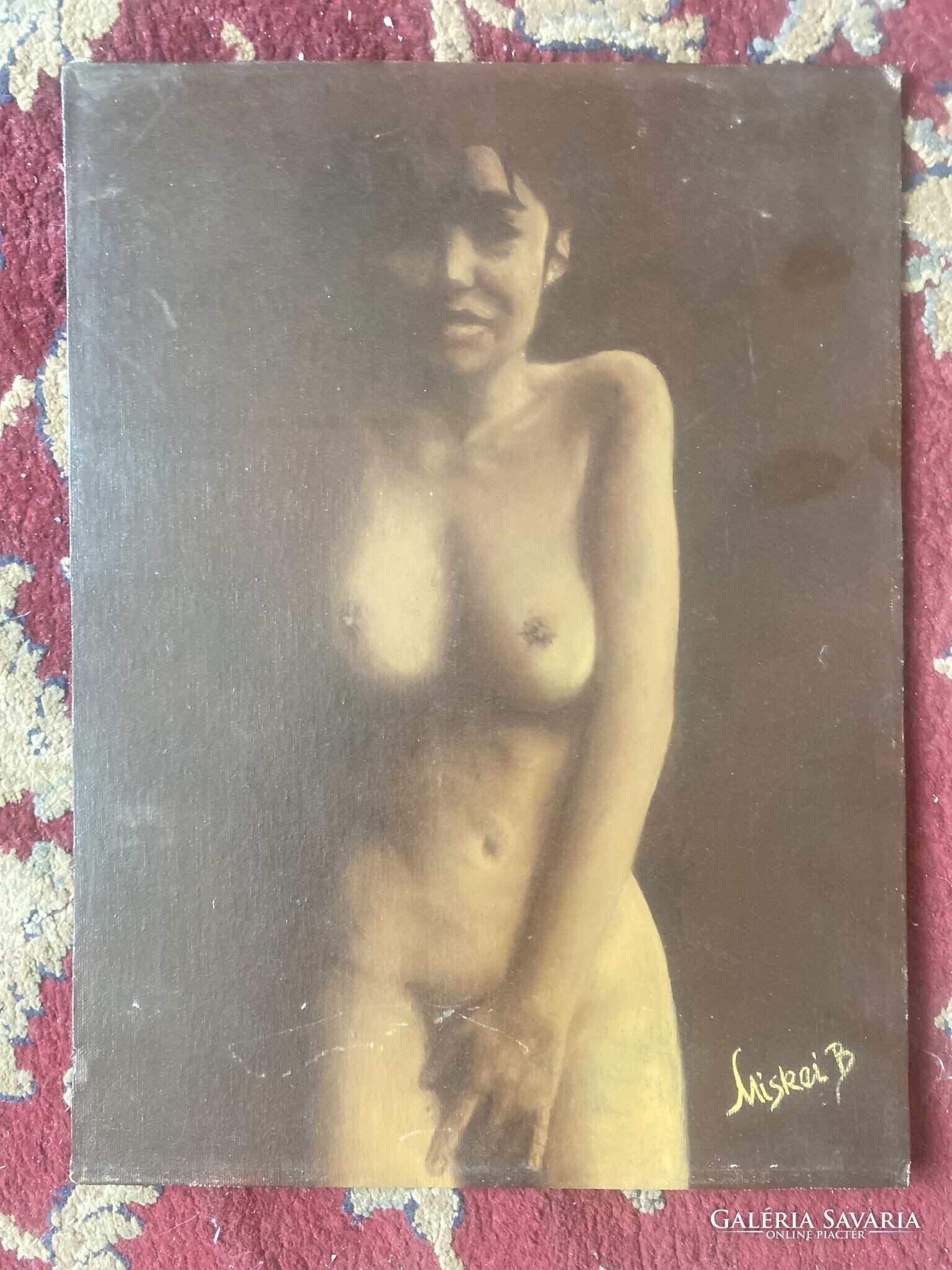 Miskei B jelzéssel ellátott, olajtechnikával fa hordozóra készült realisztikus női akt.