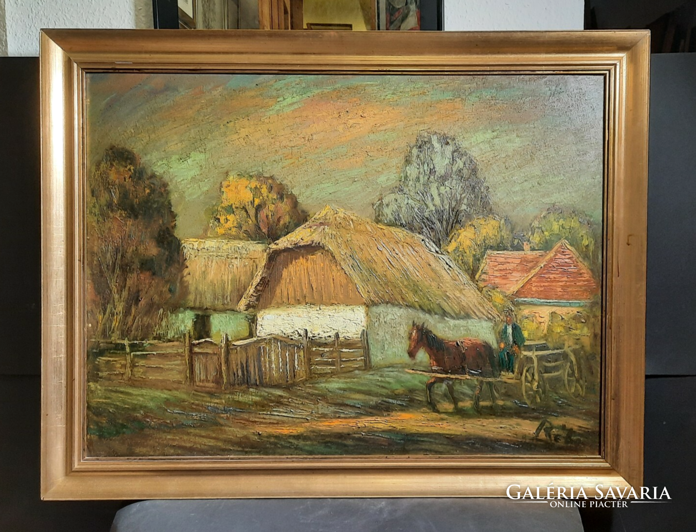 Réti Mátyás: Vidéki életkép (Teljes méret 70x90 cm) olaj, farost, hintó, ló