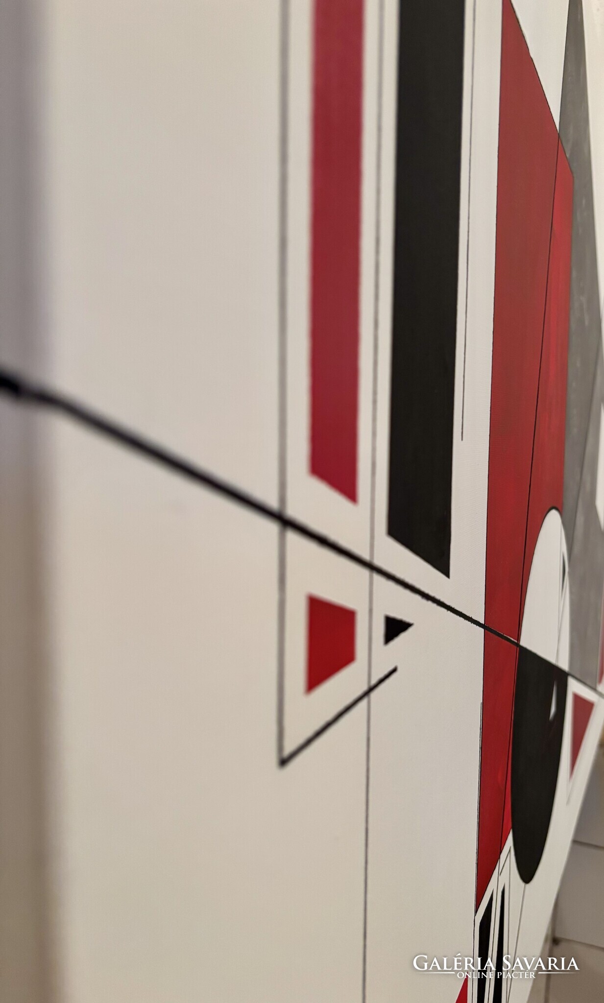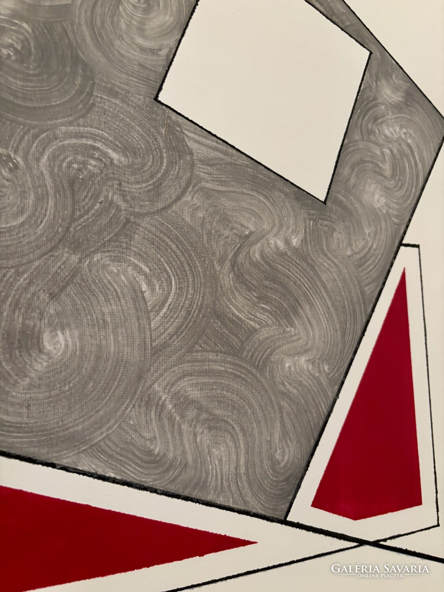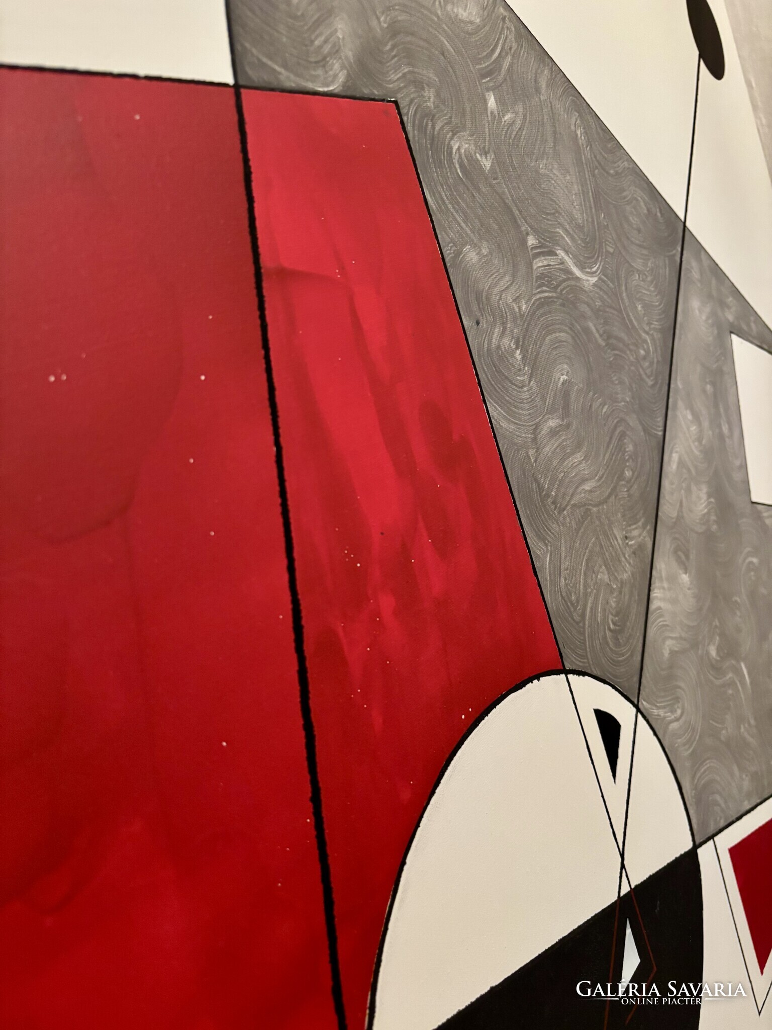 A vörös, fekete, fehér és szürke árnyalatok egyensúlya feszültséget és harmóniát egyaránt teremt, mintha az érzelmek végső összegzése jelenne meg a vásznon. A középpontban lévő kör és az átlós vonalak egyfajta lezárás érzetét keltik, mintha az eddigi darabok minden energiája ebben a műben találkozna.