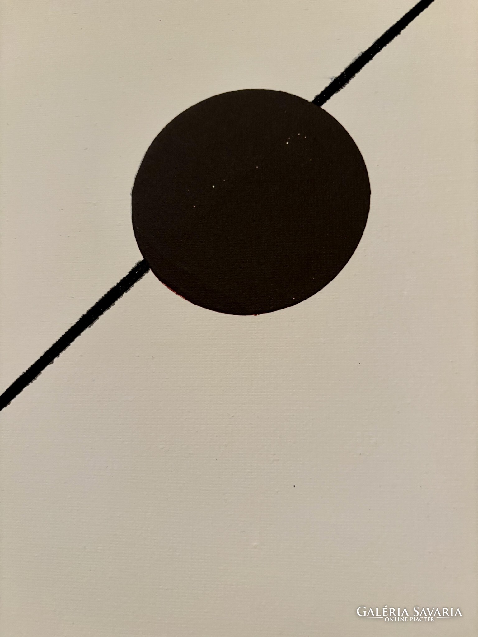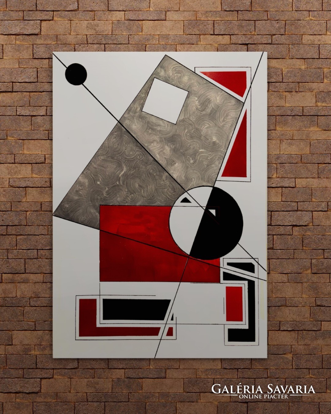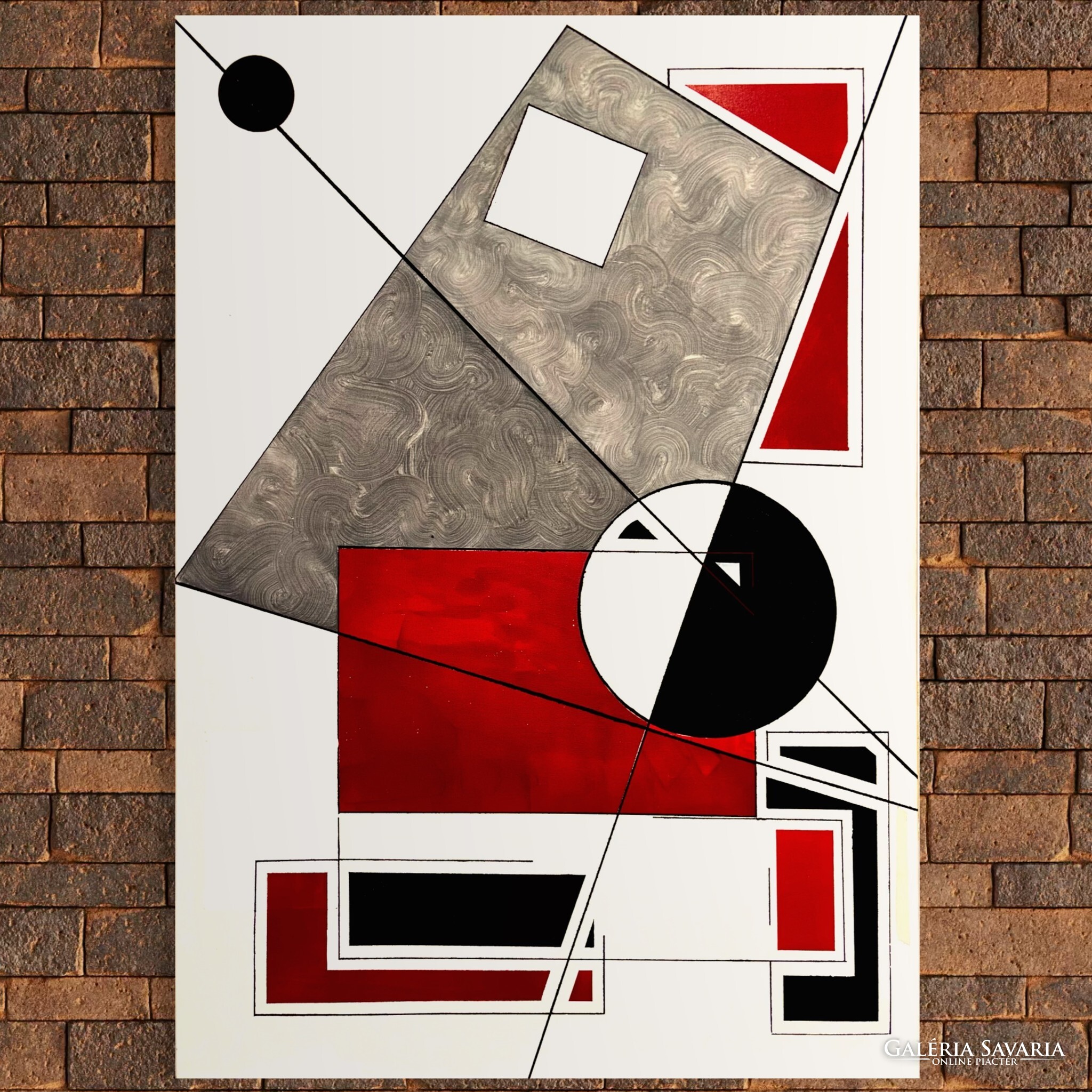 A vörös, fekete, fehér és szürke árnyalatok egyensúlya feszültséget és harmóniát egyaránt teremt, mintha az érzelmek végső összegzése jelenne meg a vásznon. A középpontban lévő kör és az átlós vonalak egyfajta lezárás érzetét keltik, mintha az eddigi darabok minden energiája ebben a műben találkozna.
