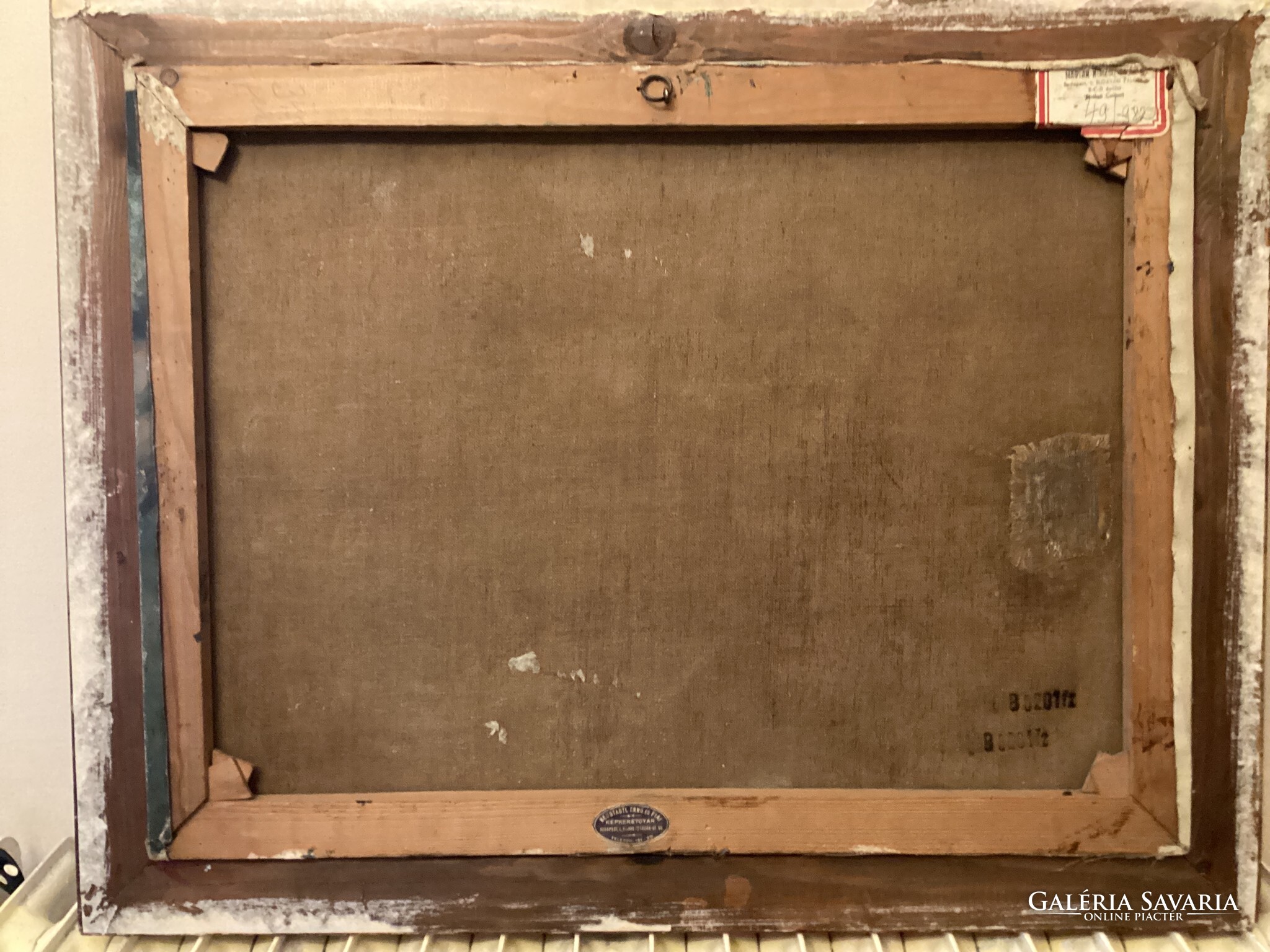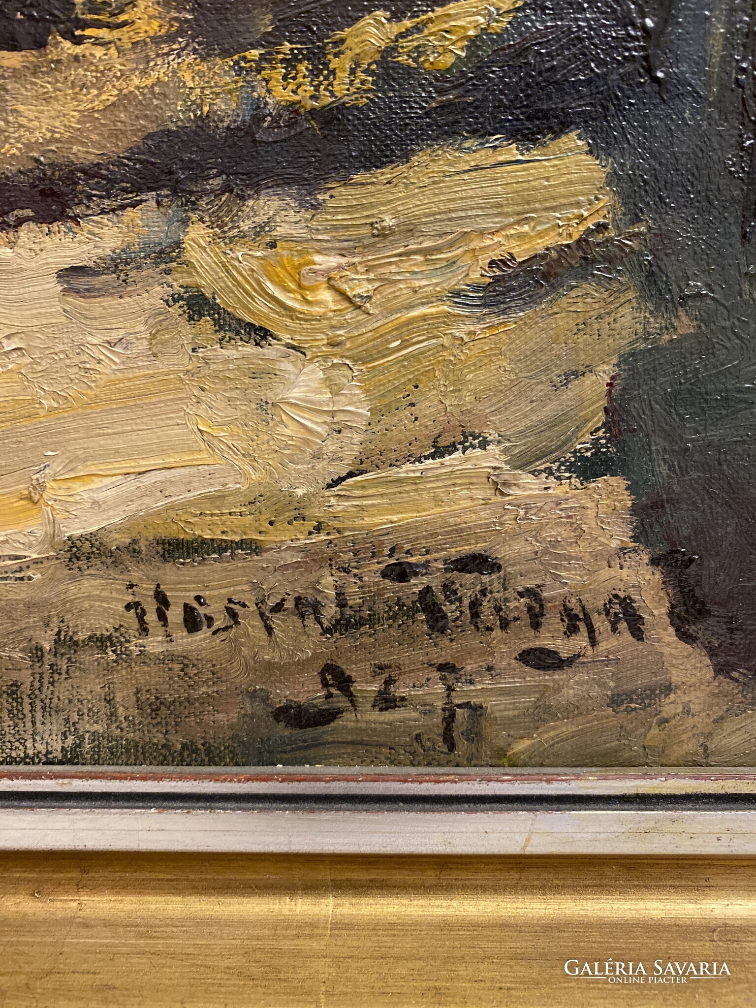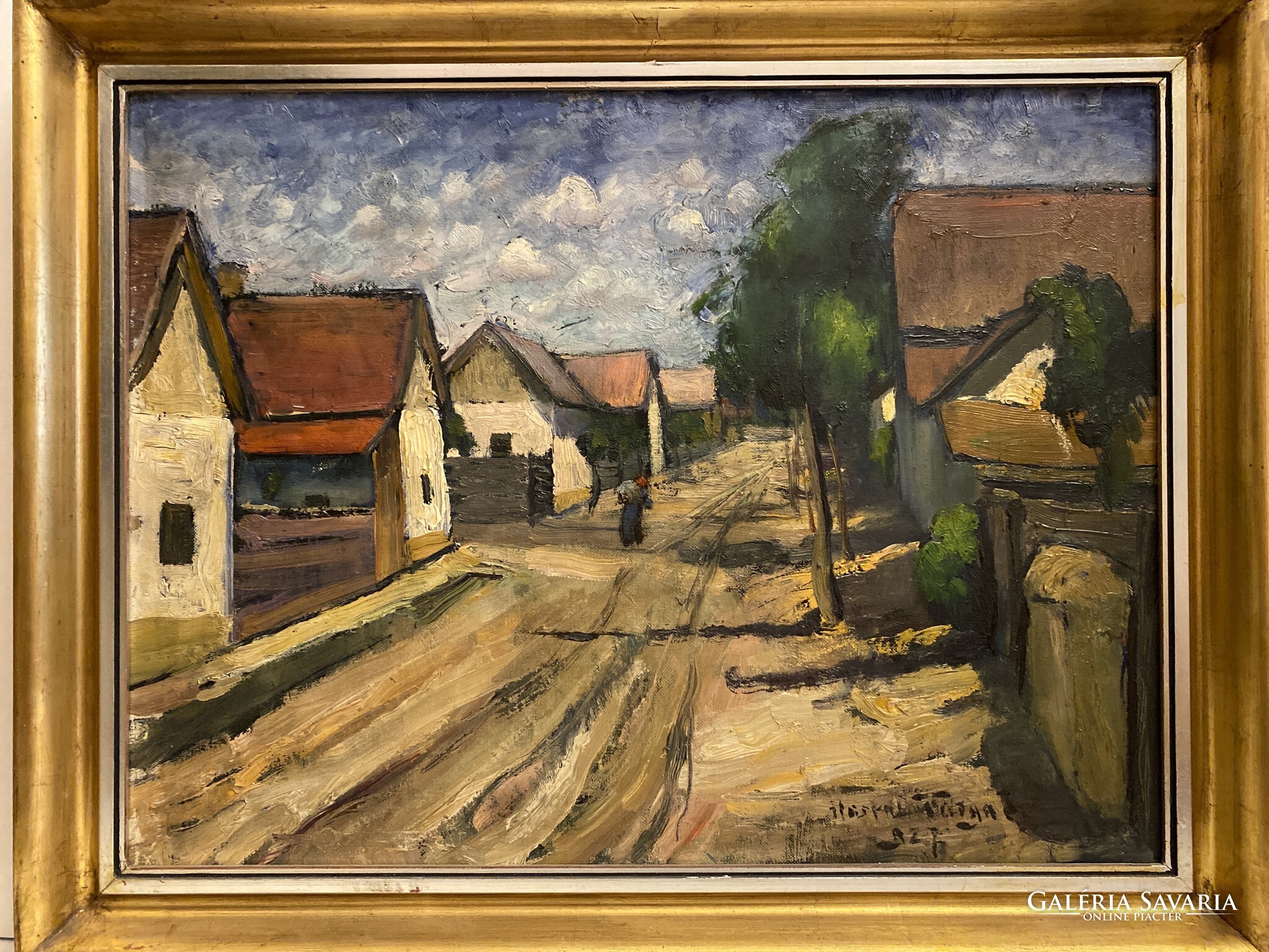 Ilosvai Varga István - Falusi utcaképet ábrázoló olajfestménye , szép élénk színekkel . Nehezen olvasható de talán 927 es datálással . Mérete: 67 X 51 cm . Keretezett mérete : 78 X 61,5 cm .