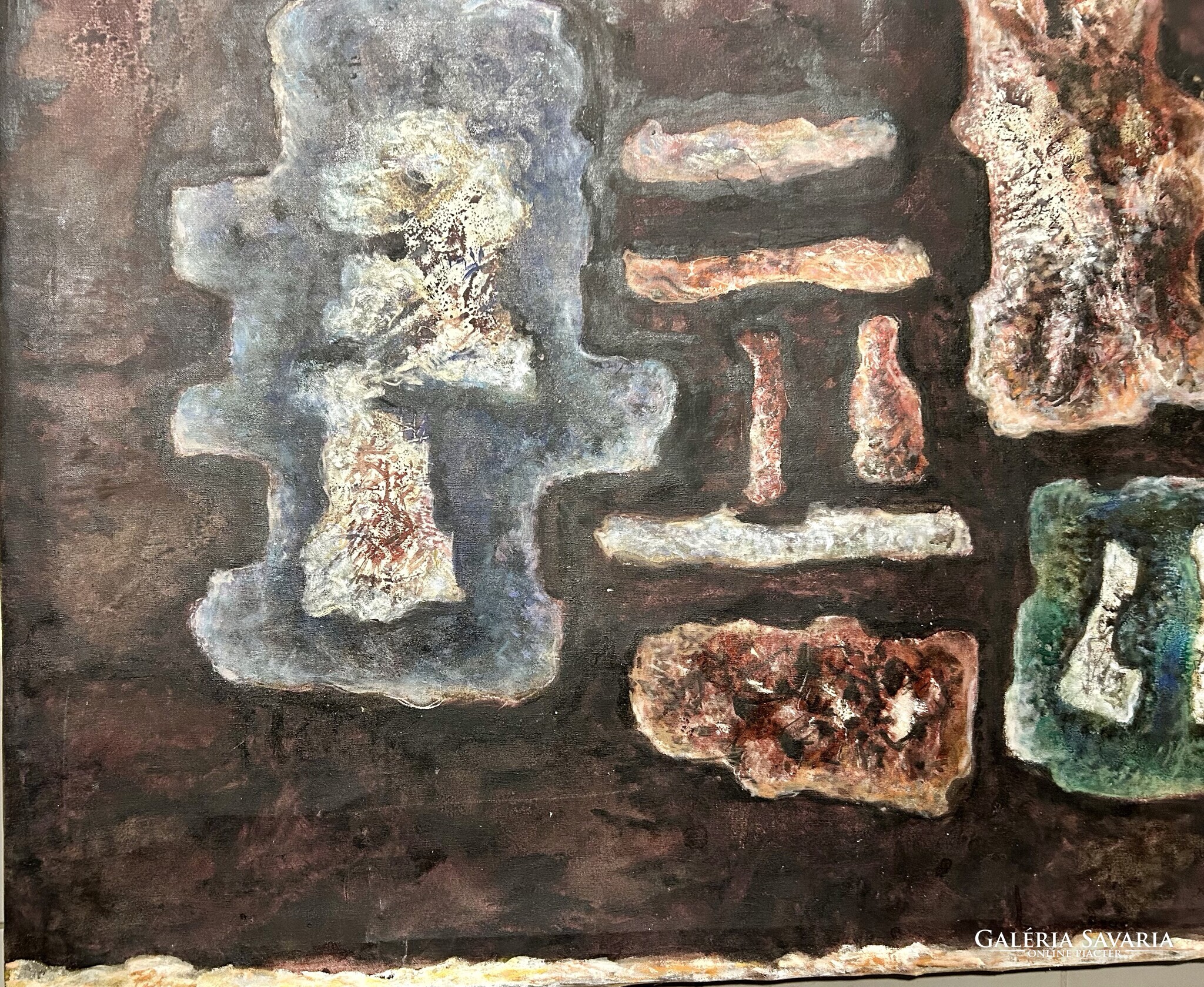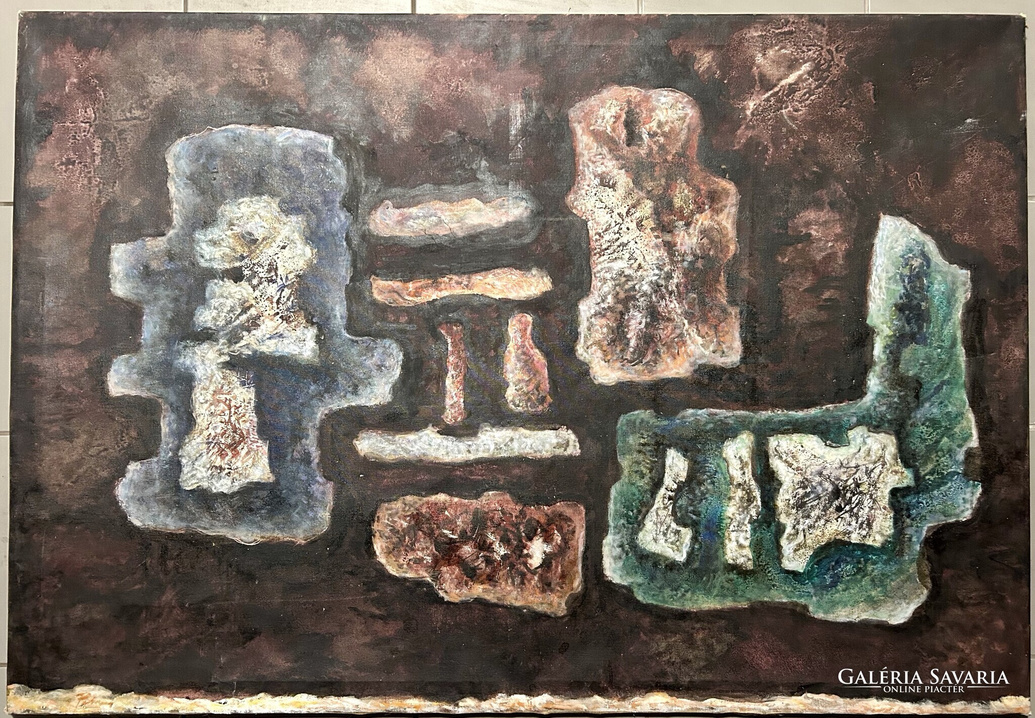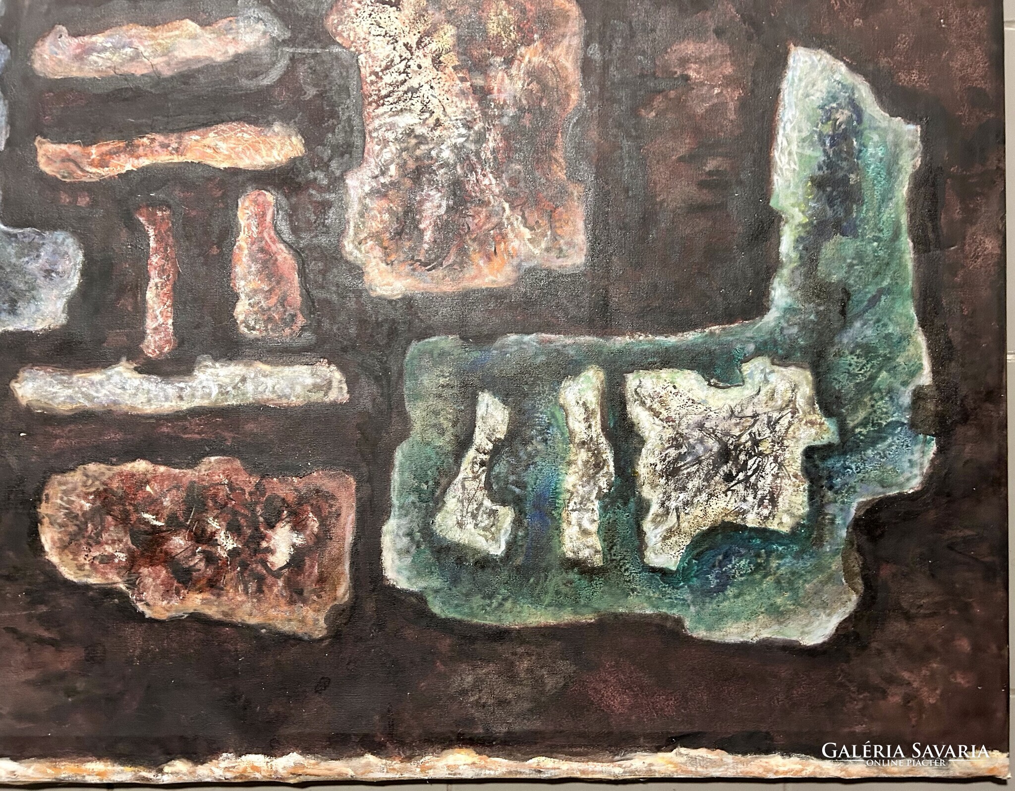 Nagy méretű, földszínekkel megfestett alkotás, keret nincs.