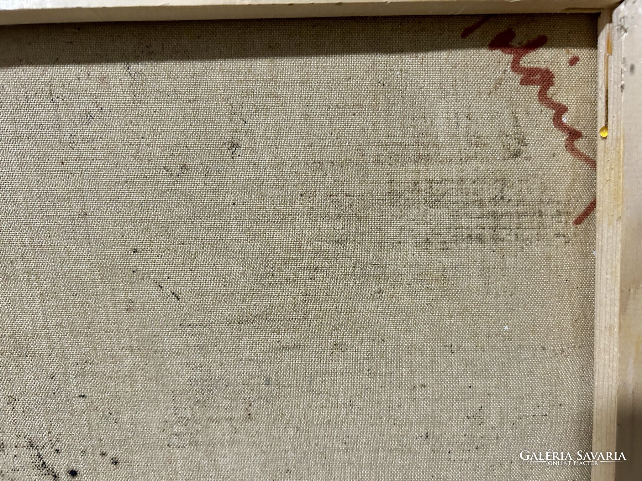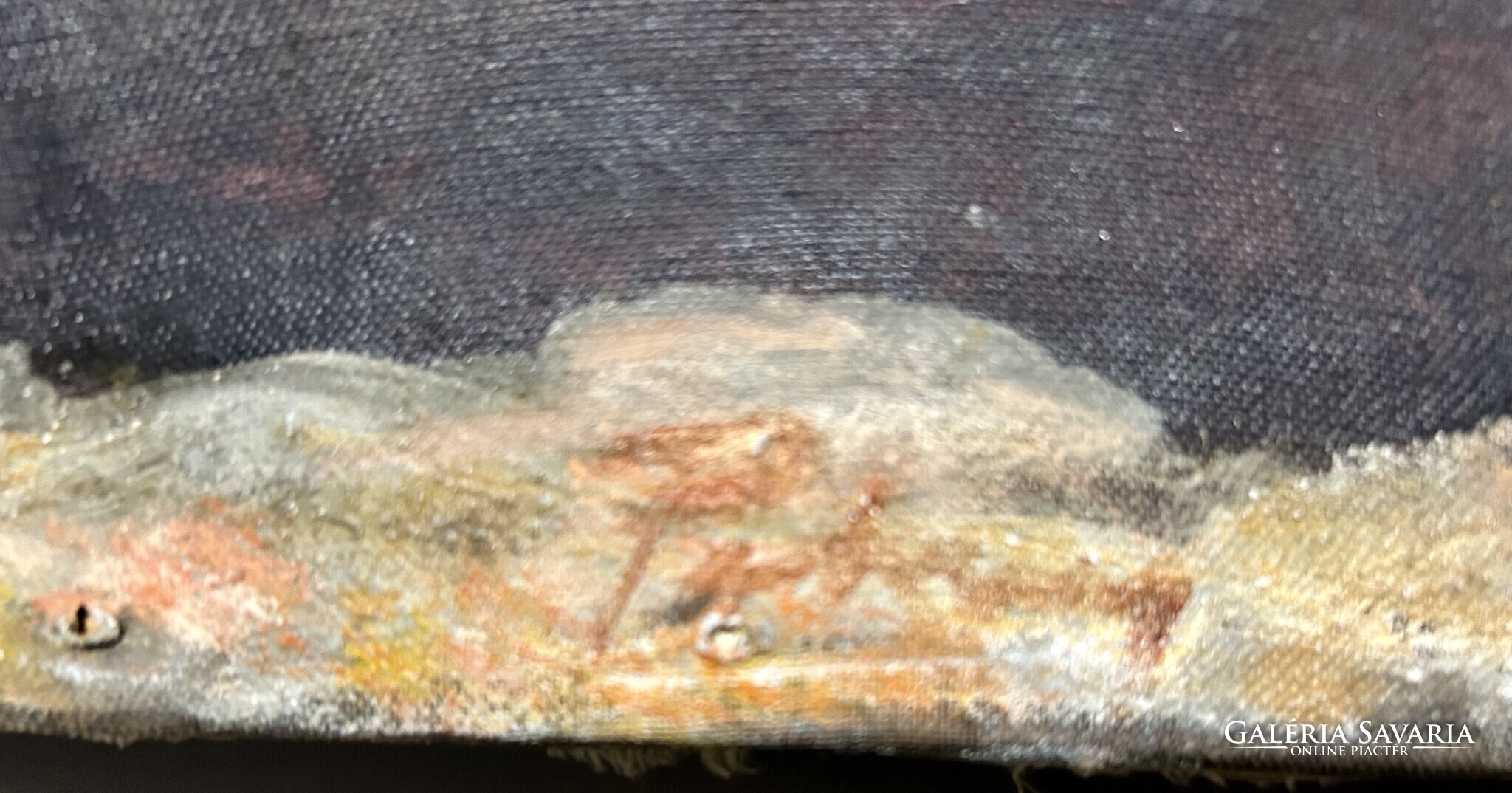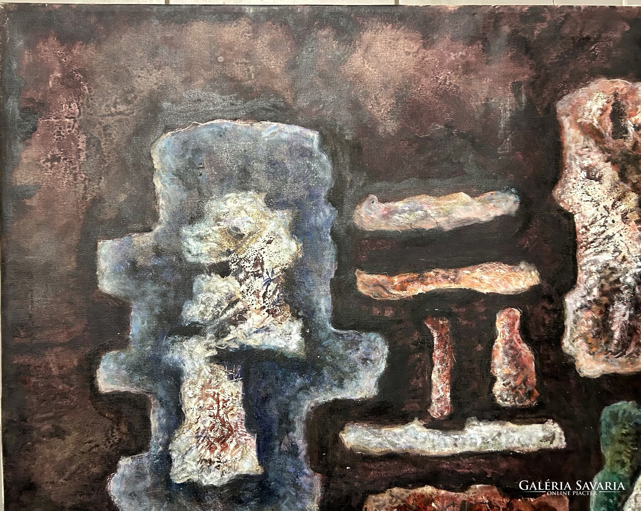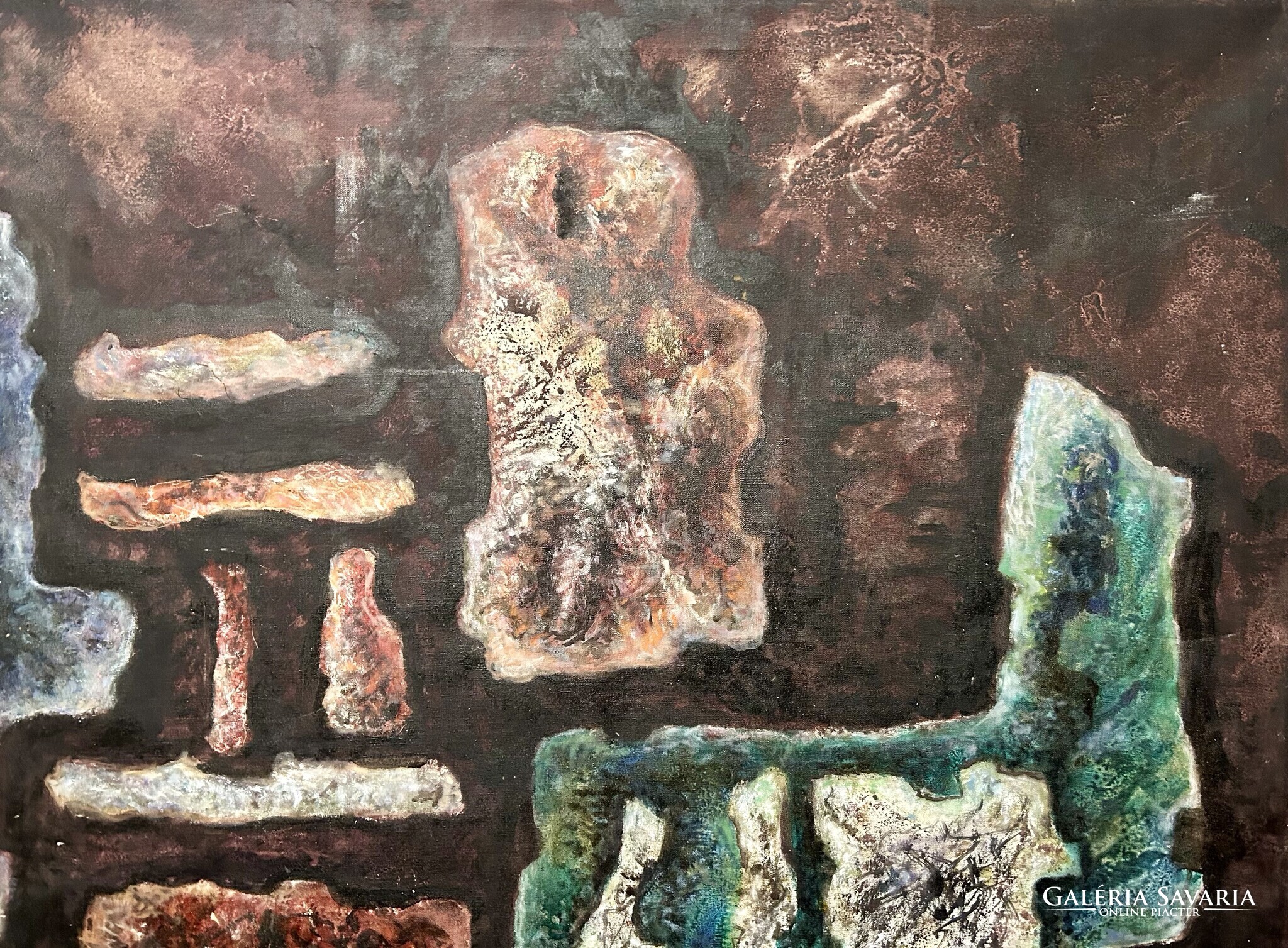 Nagy méretű, földszínekkel megfestett alkotás, keret nincs.