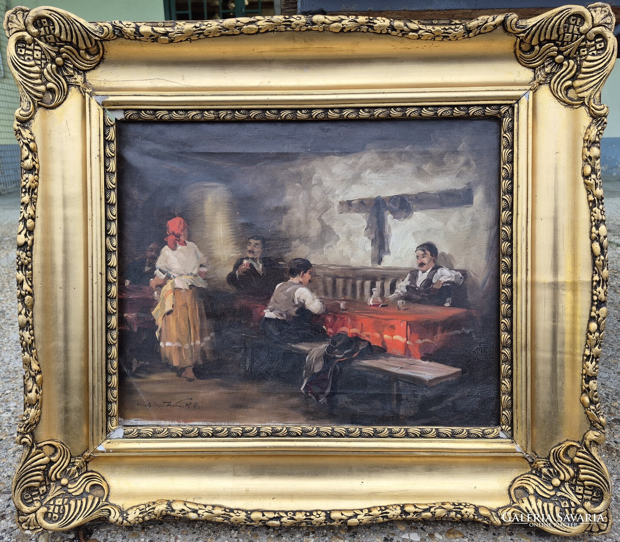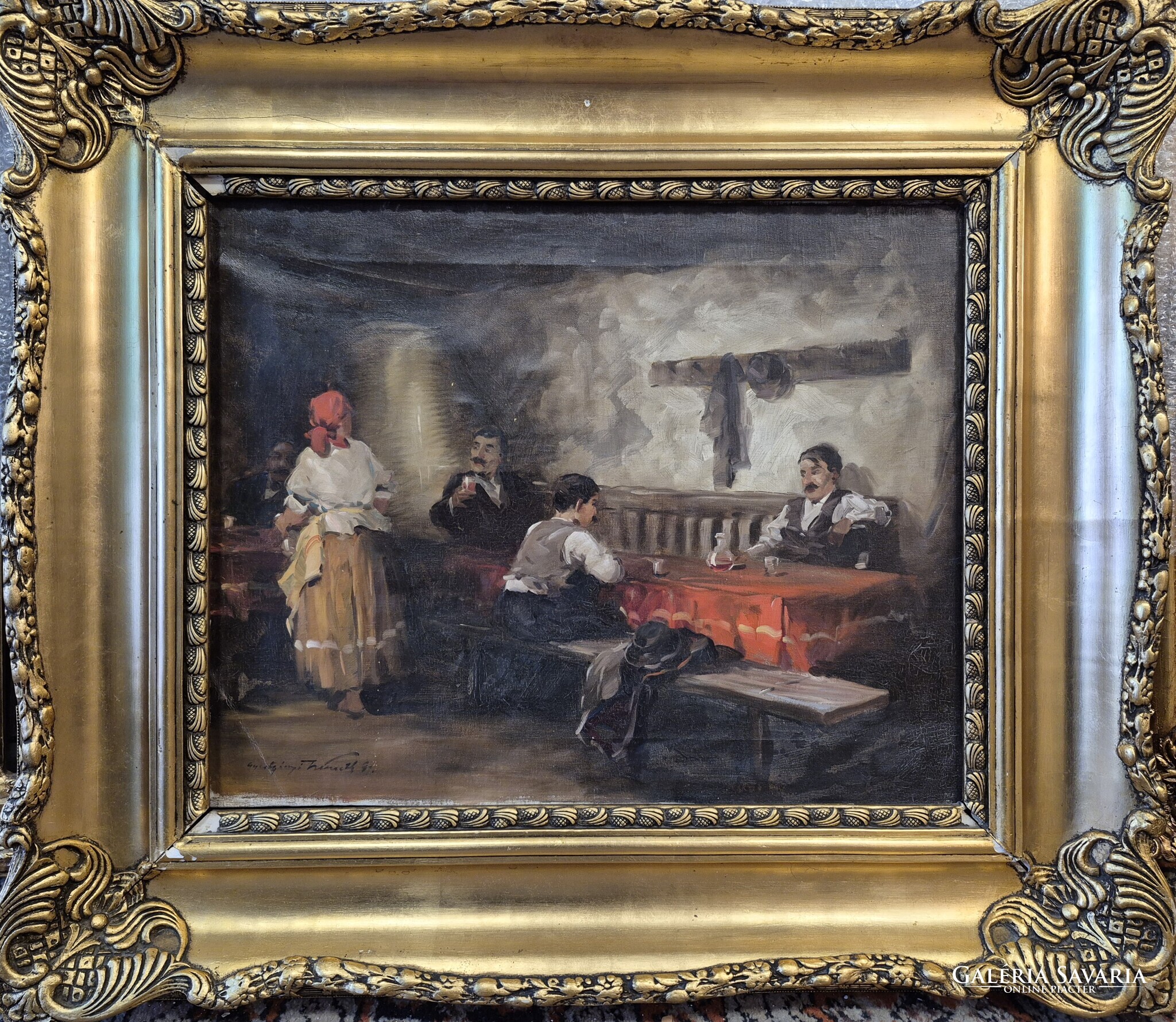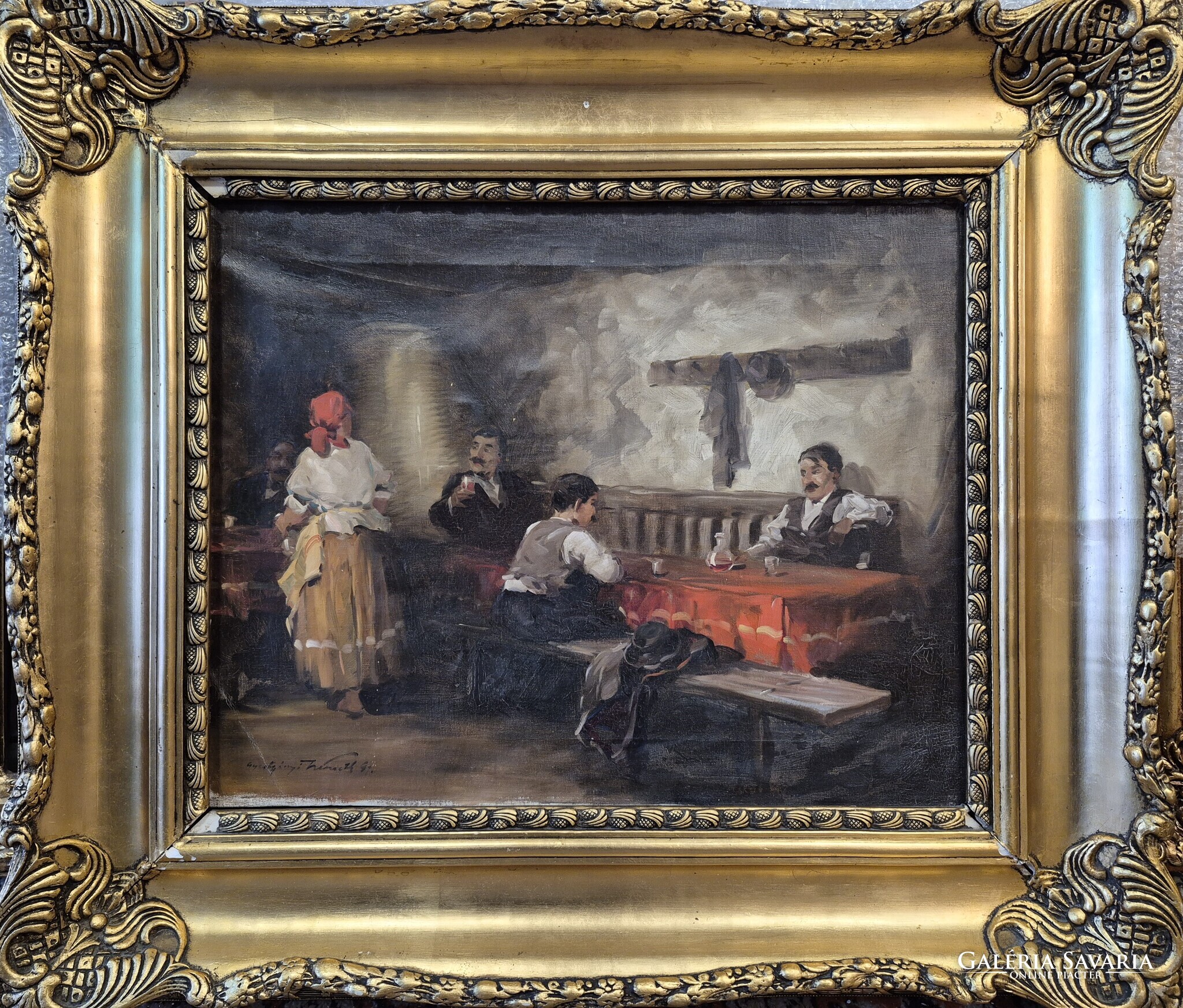 Gyertyáni Németh Gyula / Kocsmai jelenet, 40x50 cm, olaj-vászon, blondel keretben. A keret enyhén hibás, fotók szerint. A képhez számlát adok, eredetiségére garanciát vállalok.