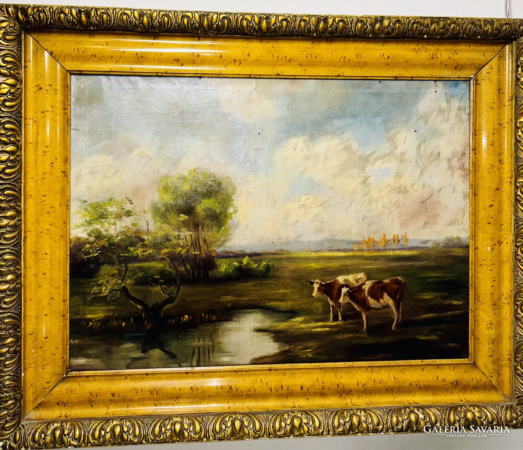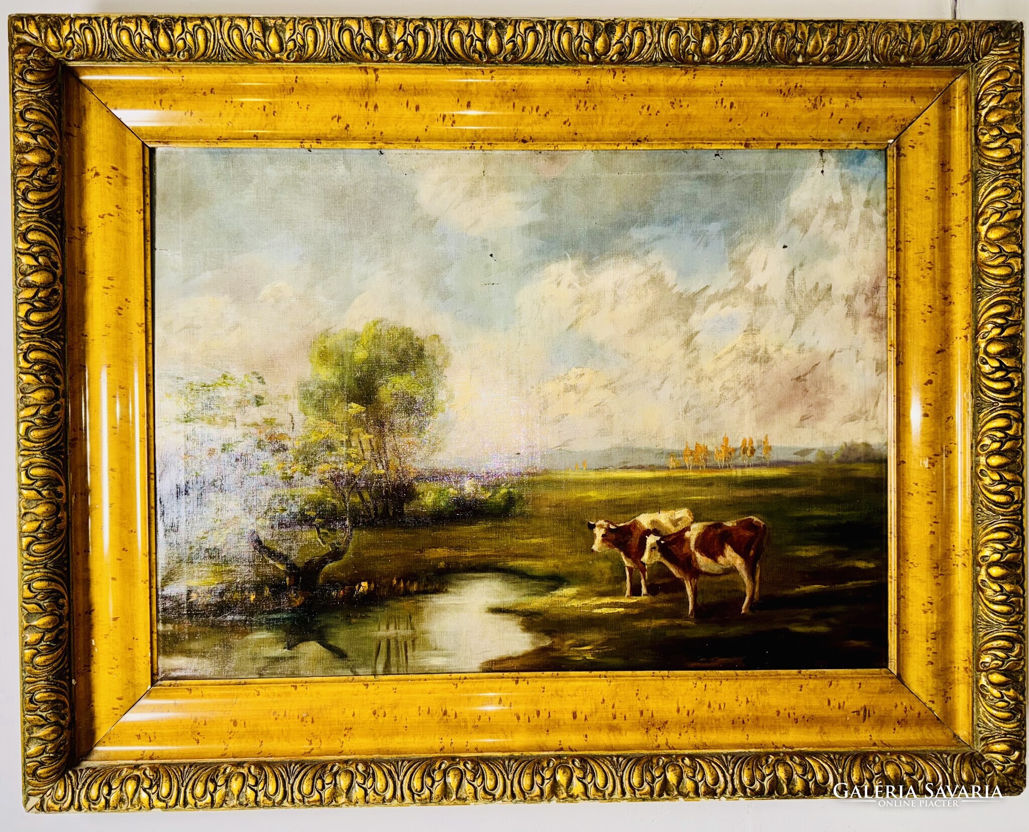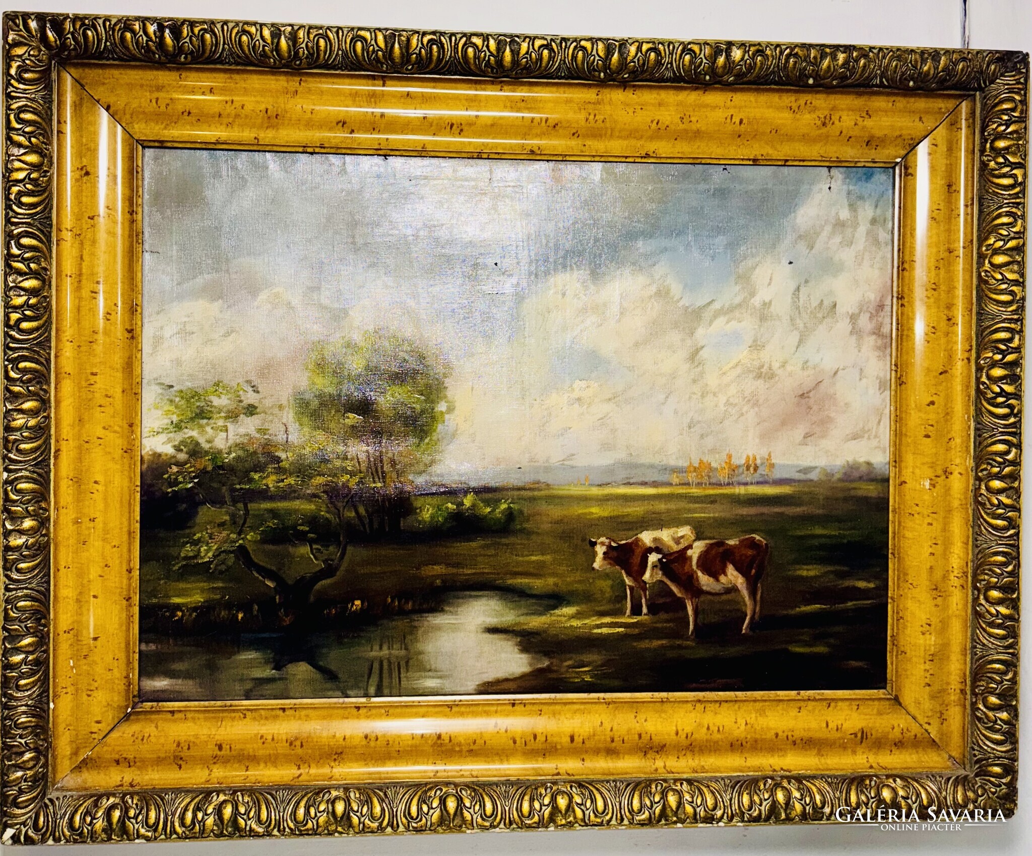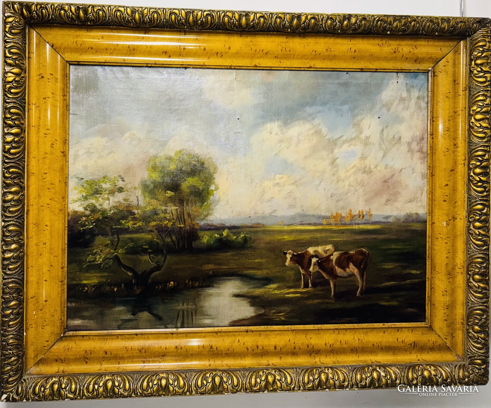 A festmény egy nyugodt, időtlen tájat tár elénk, ahol a késő délutáni napfény aranyló fénye lágyan simítja végig a zöld mezőt és a lassan sötétedő ég alját. A kép előterében két tehén áll békésen a vízparton, tükröződésük finoman fodrozódik a tó felszínén. A bal oldalon egy jellegzetesen magyaros kis fa hajlik a víz fölé, mögötte pedig puha ecsetvonásokkal festett, gomolygó felhők emelkednek. Az egész alkotás csendes harmóniát sugároz, mintha egy elveszett, régi vidék emlékét őrizné — azt a pillanatot, amikor a természet még teljes összhangban lélegzett az ember nélkül.