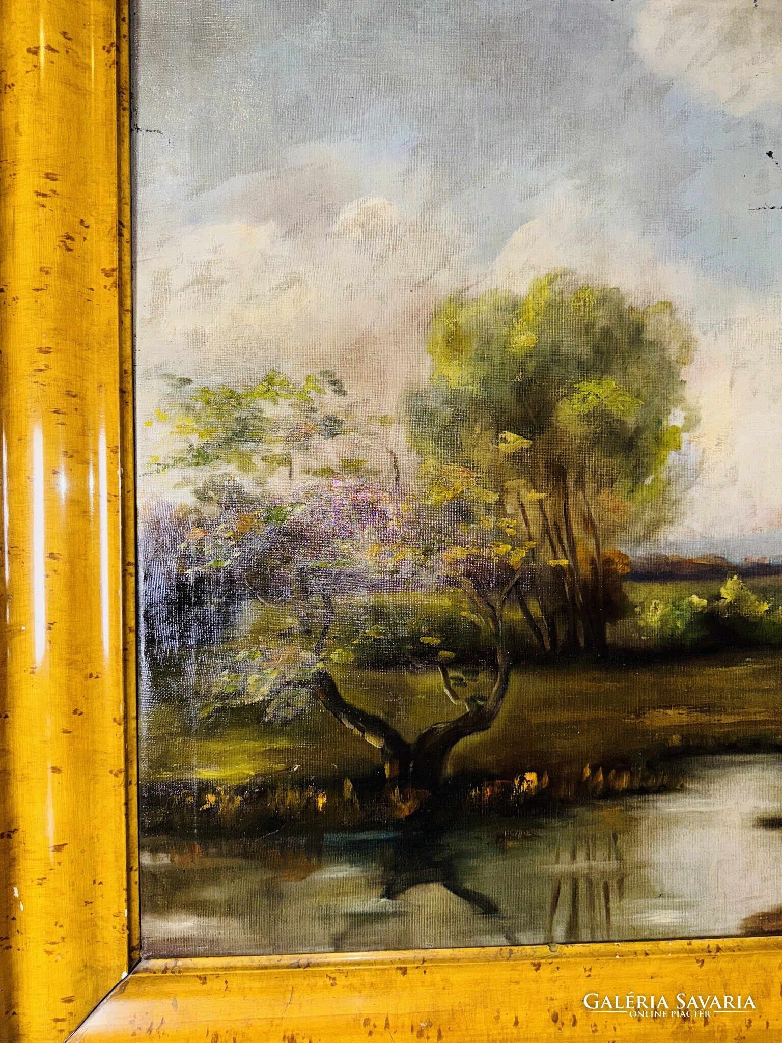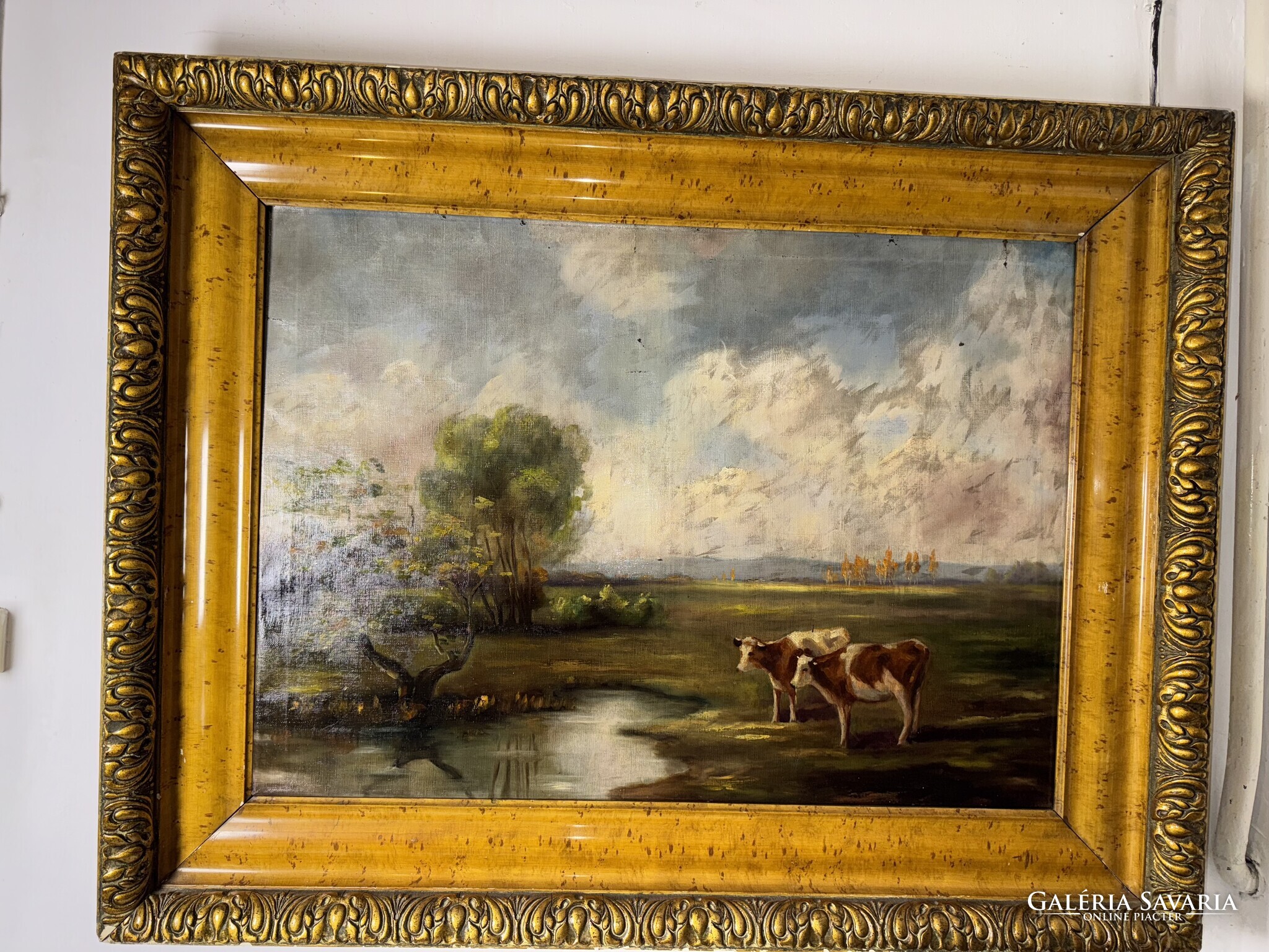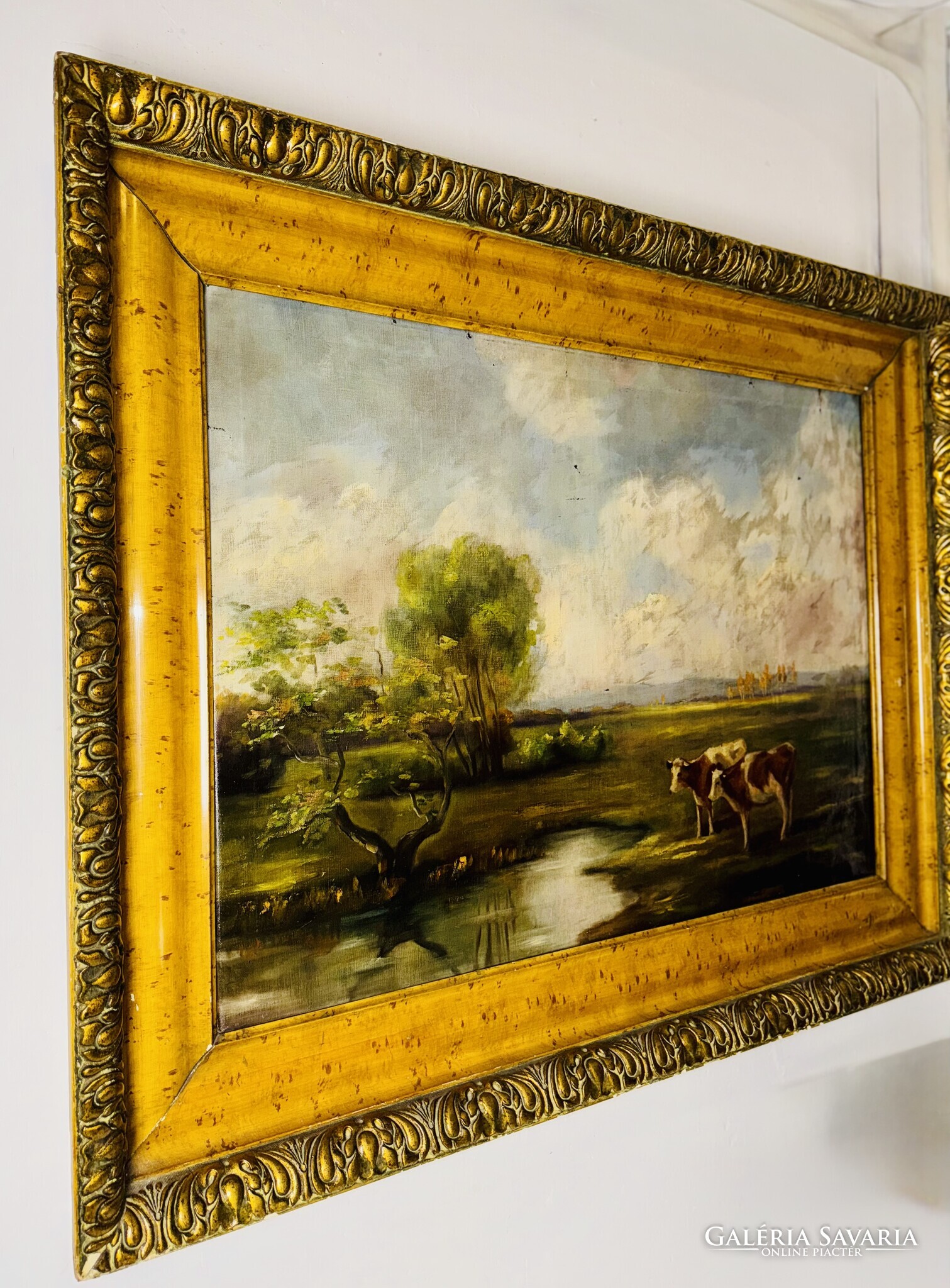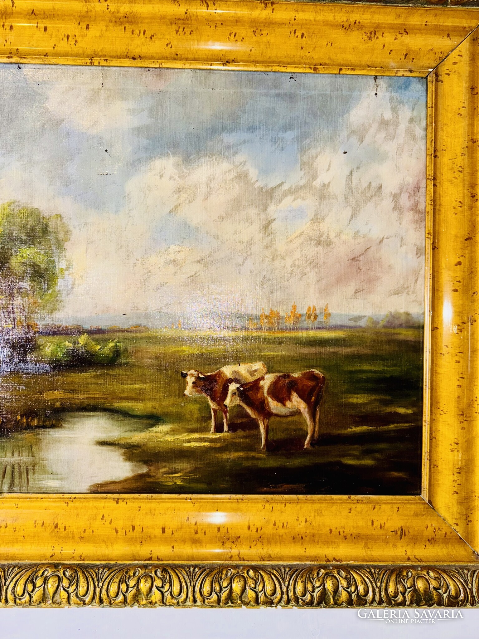 A festmény egy nyugodt, időtlen tájat tár elénk, ahol a késő délutáni napfény aranyló fénye lágyan simítja végig a zöld mezőt és a lassan sötétedő ég alját. A kép előterében két tehén áll békésen a vízparton, tükröződésük finoman fodrozódik a tó felszínén. A bal oldalon egy jellegzetesen magyaros kis fa hajlik a víz fölé, mögötte pedig puha ecsetvonásokkal festett, gomolygó felhők emelkednek. Az egész alkotás csendes harmóniát sugároz, mintha egy elveszett, régi vidék emlékét őrizné — azt a pillanatot, amikor a természet még teljes összhangban lélegzett az ember nélkül.