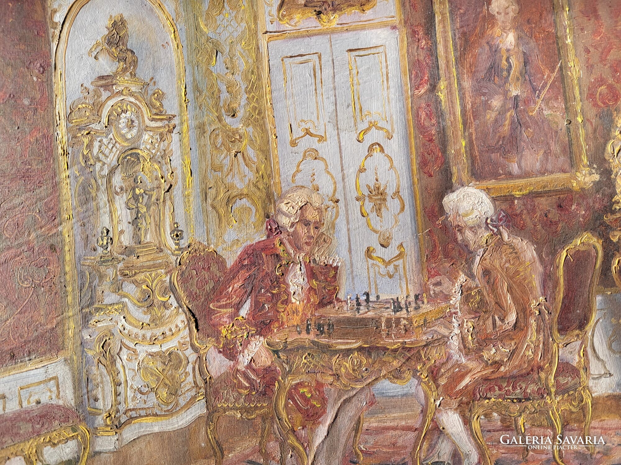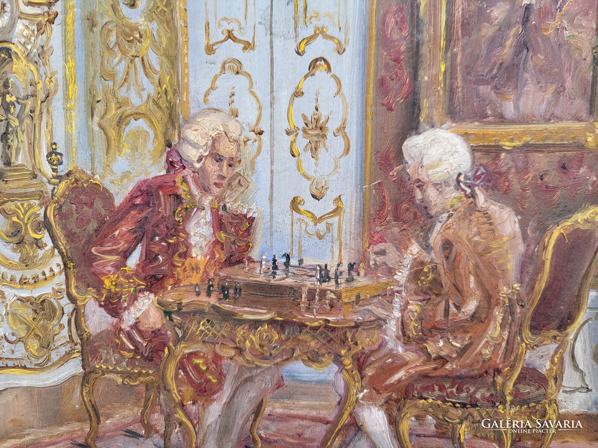 A kép egy 18. századi hangulatú szalonban játszódó sakkjátszma jelenetet mutat be, részletgazdag bútorokkal, figurális szereplőkkel és aranyozott dekorációval.
