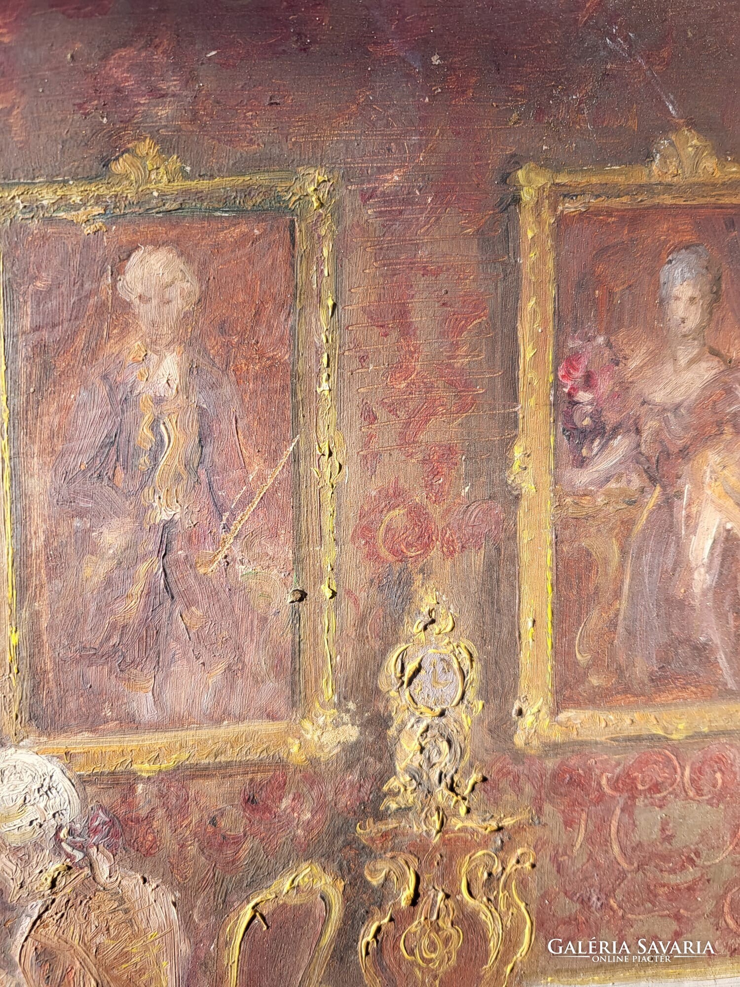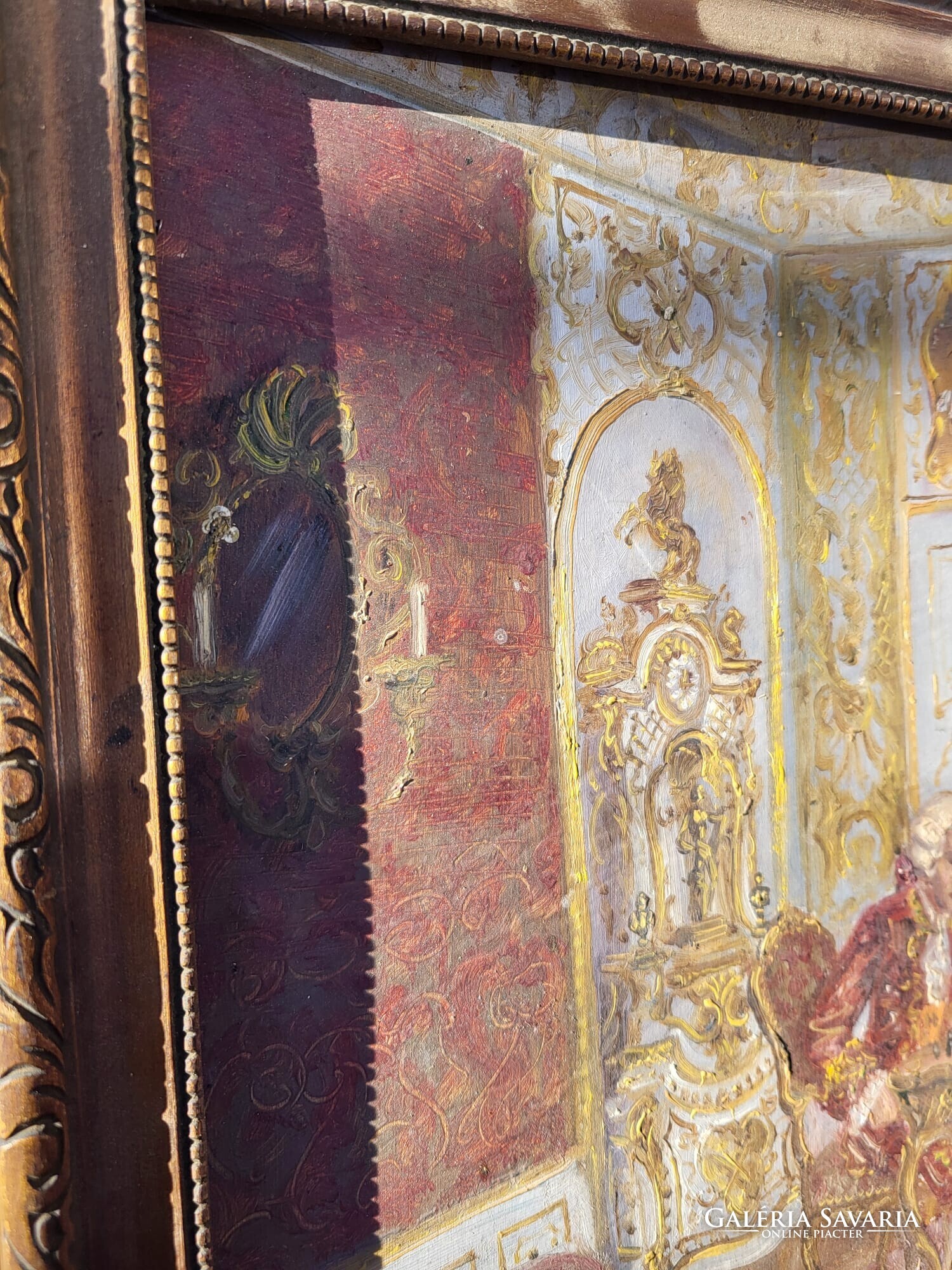 Eladó egy rokokó stílusú enteriőrjelenetet ábrázoló olajfestmény, gazdagon díszített, korhű hatású fa keretben.