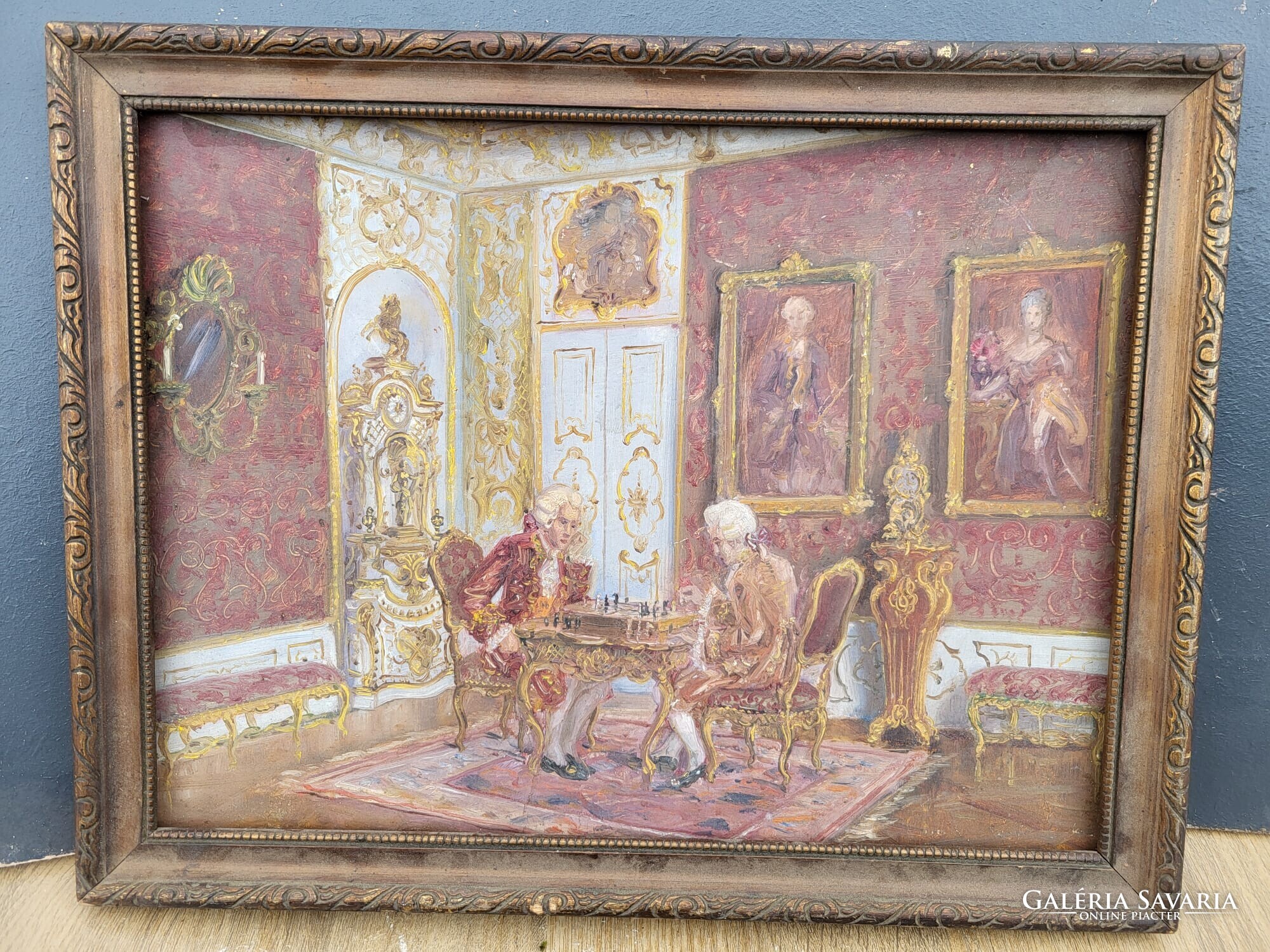 Rokokó stílusú olajfestmény – sakkjátszma jelenet, díszkeretben (45×35 cm)