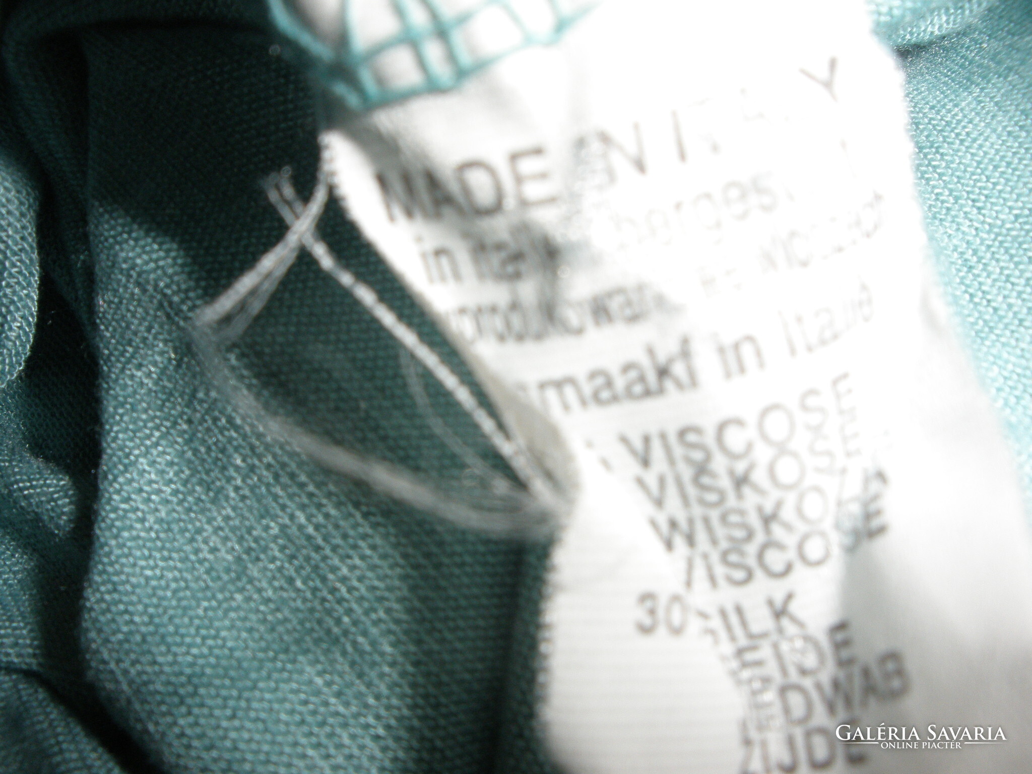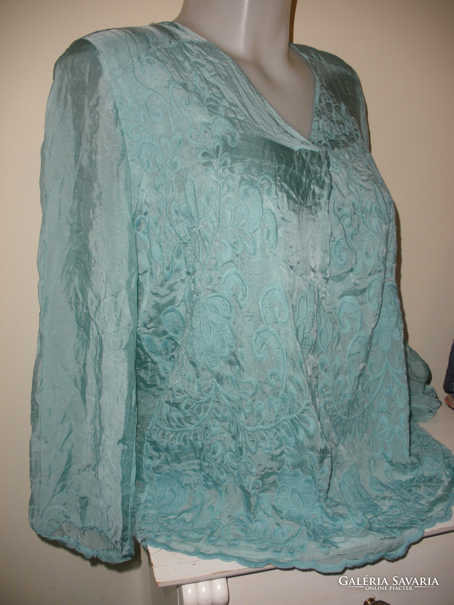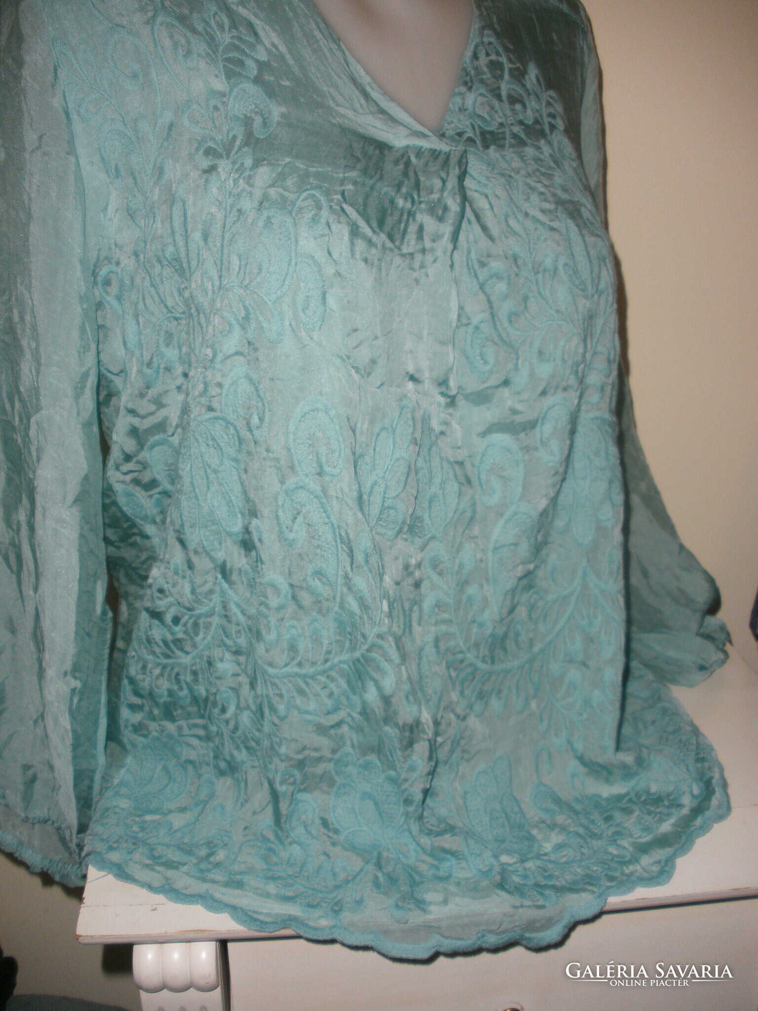 Alá van bélelve, olasz selyemtartalmú elején hímzéssel, alul slingelt kék? zöld? kékeszöld? felső. Hossza 68 cm, mell 104 cm.
