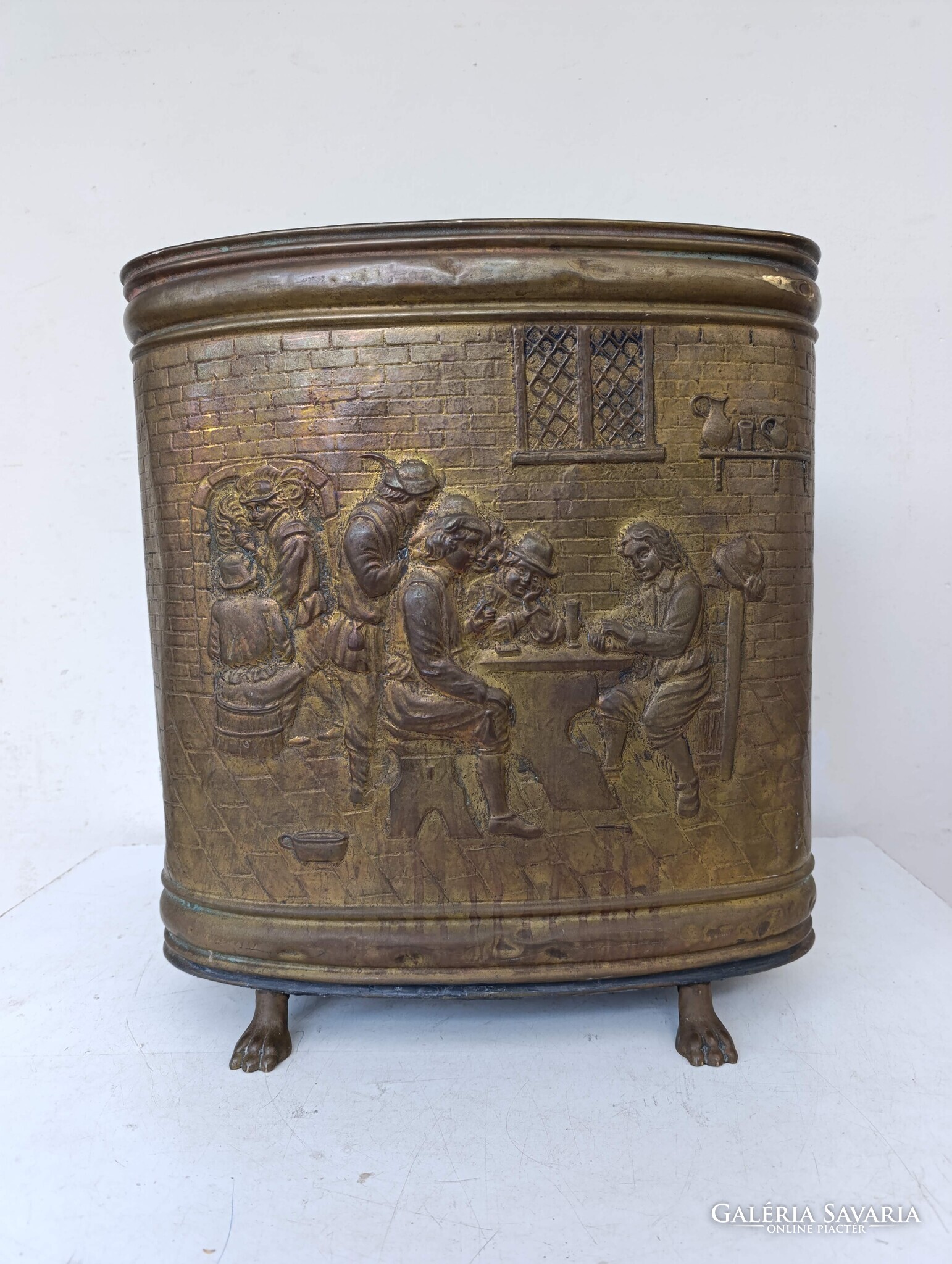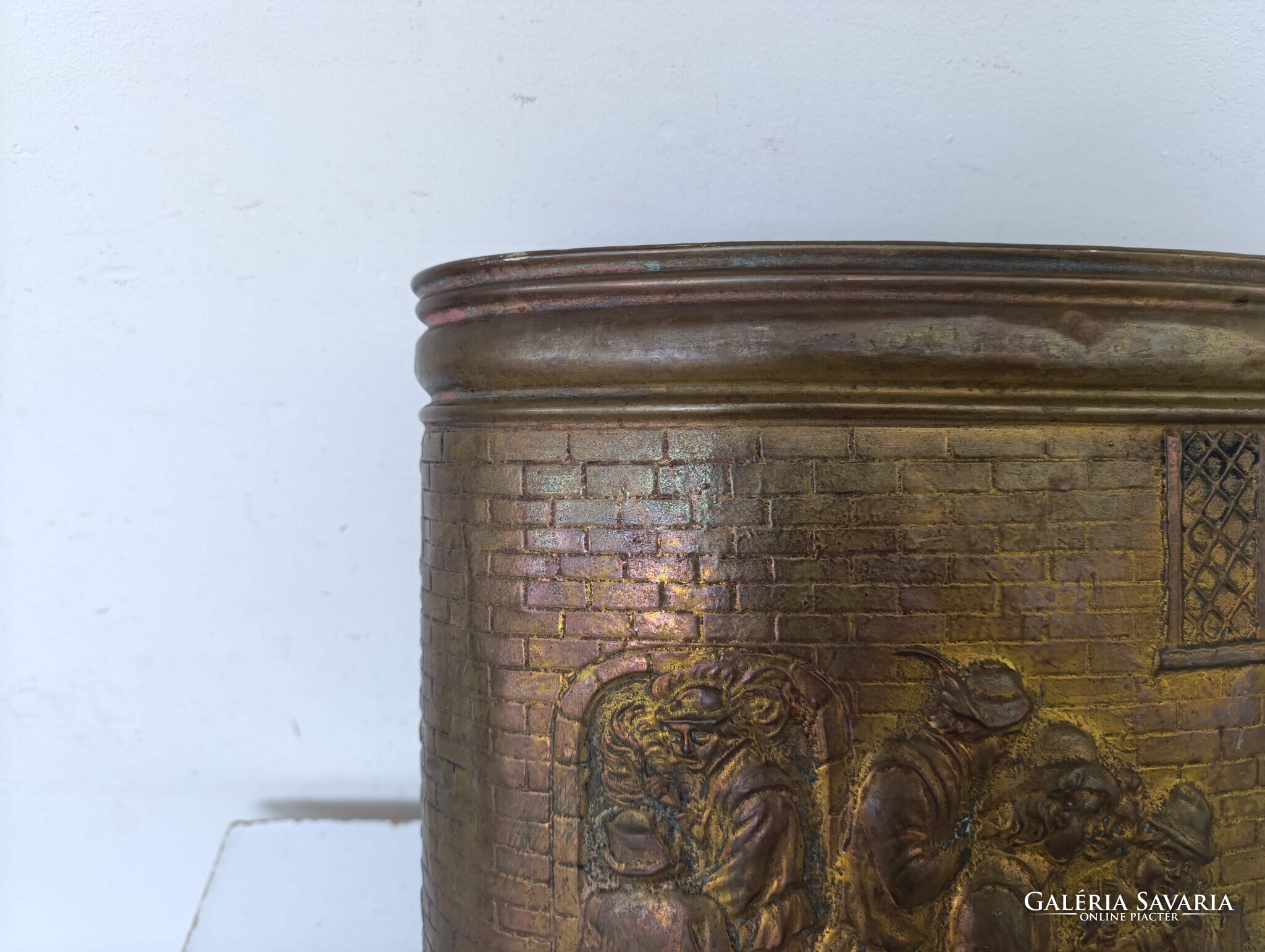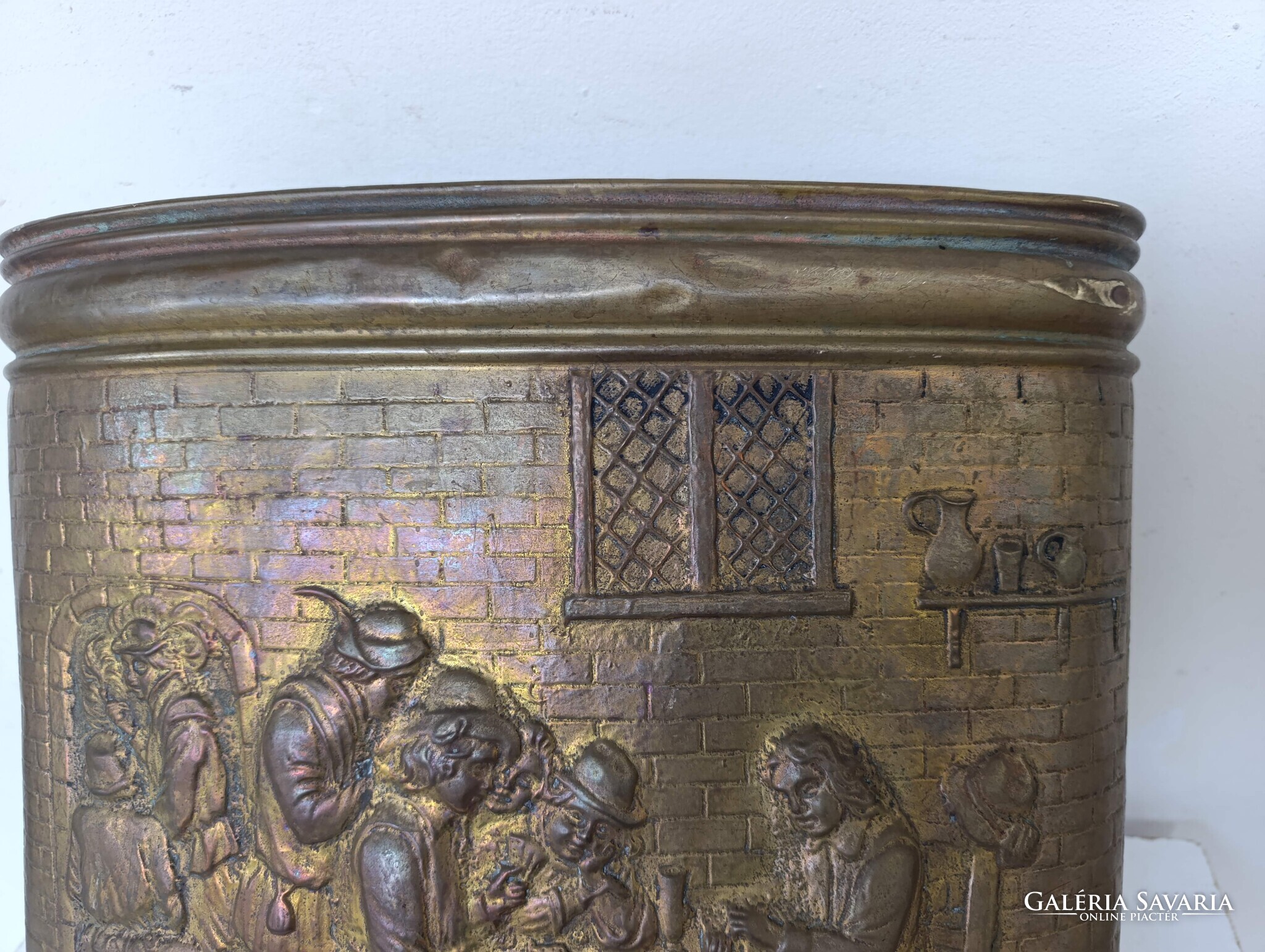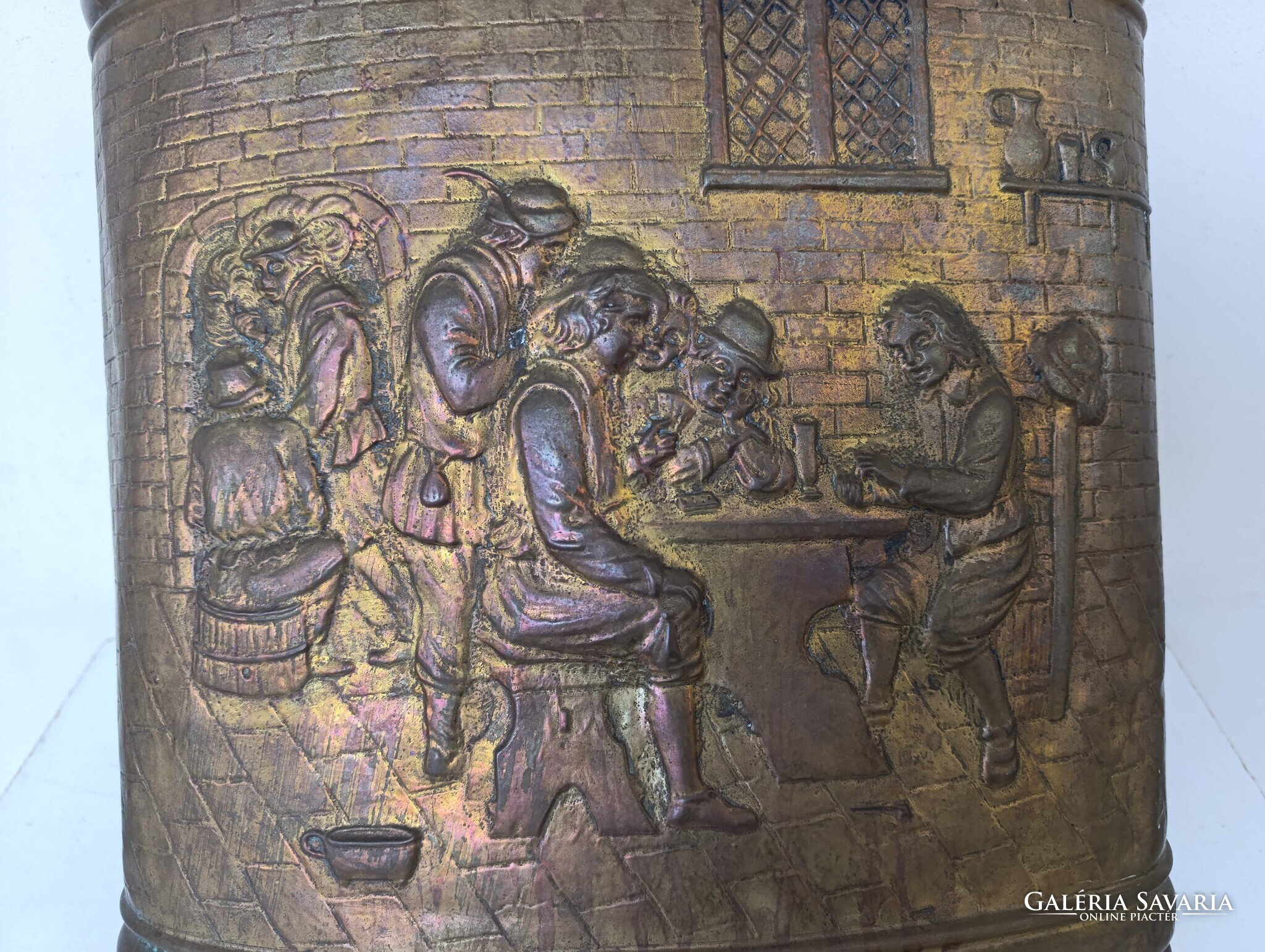 Antik domborított sárgaréz esernyőtartó, mulatozó társaság motívummal, oroszlánlábakkal.