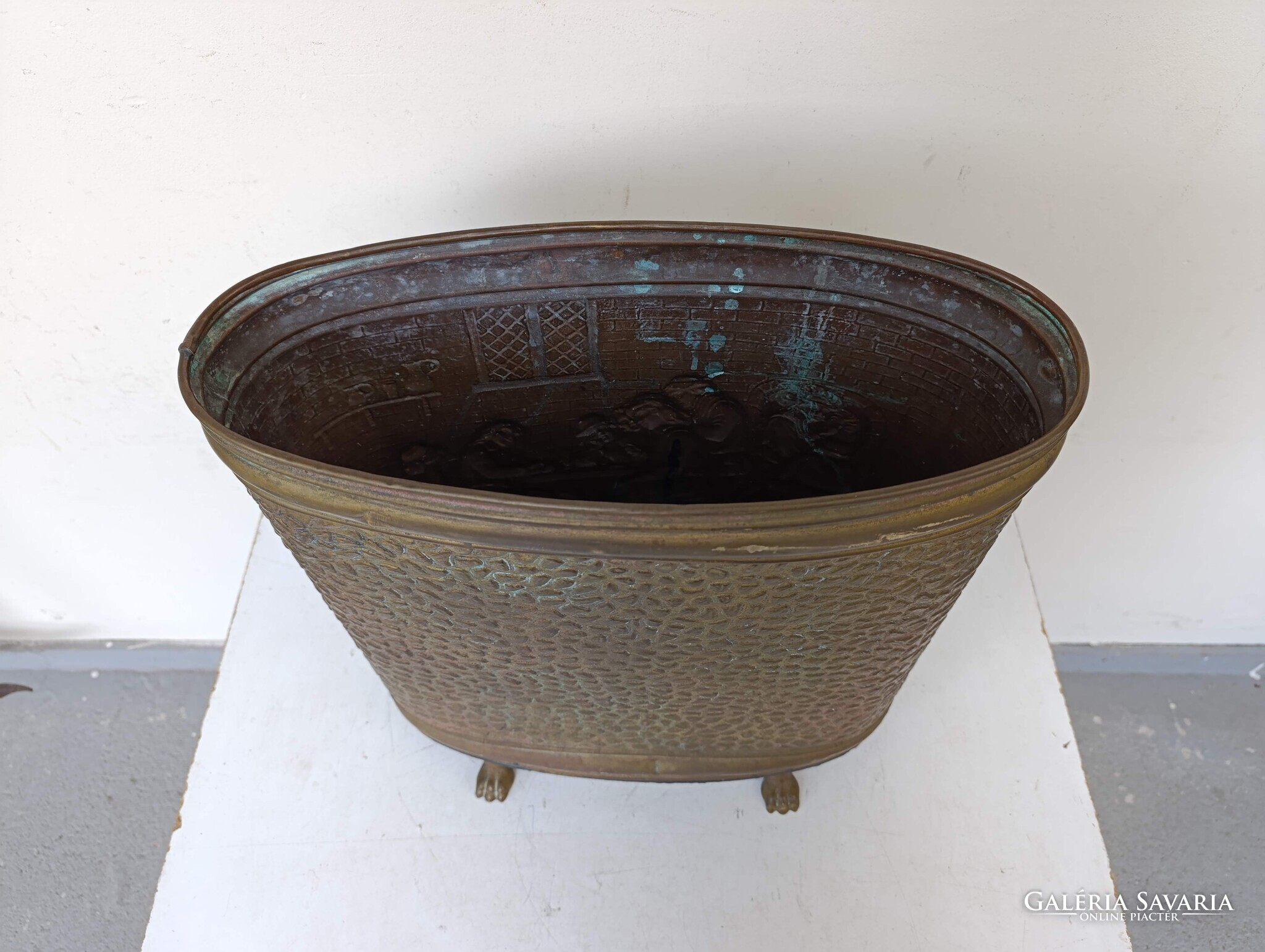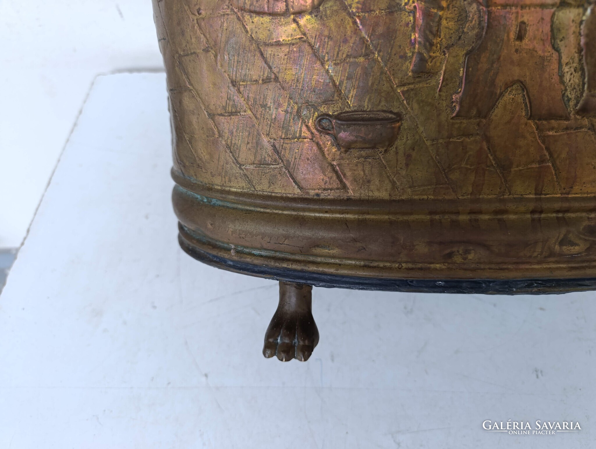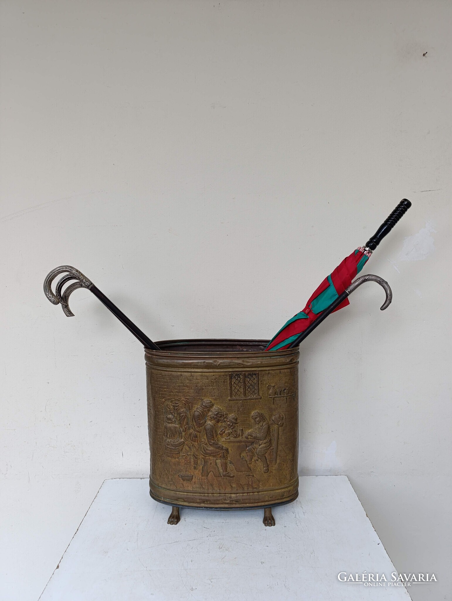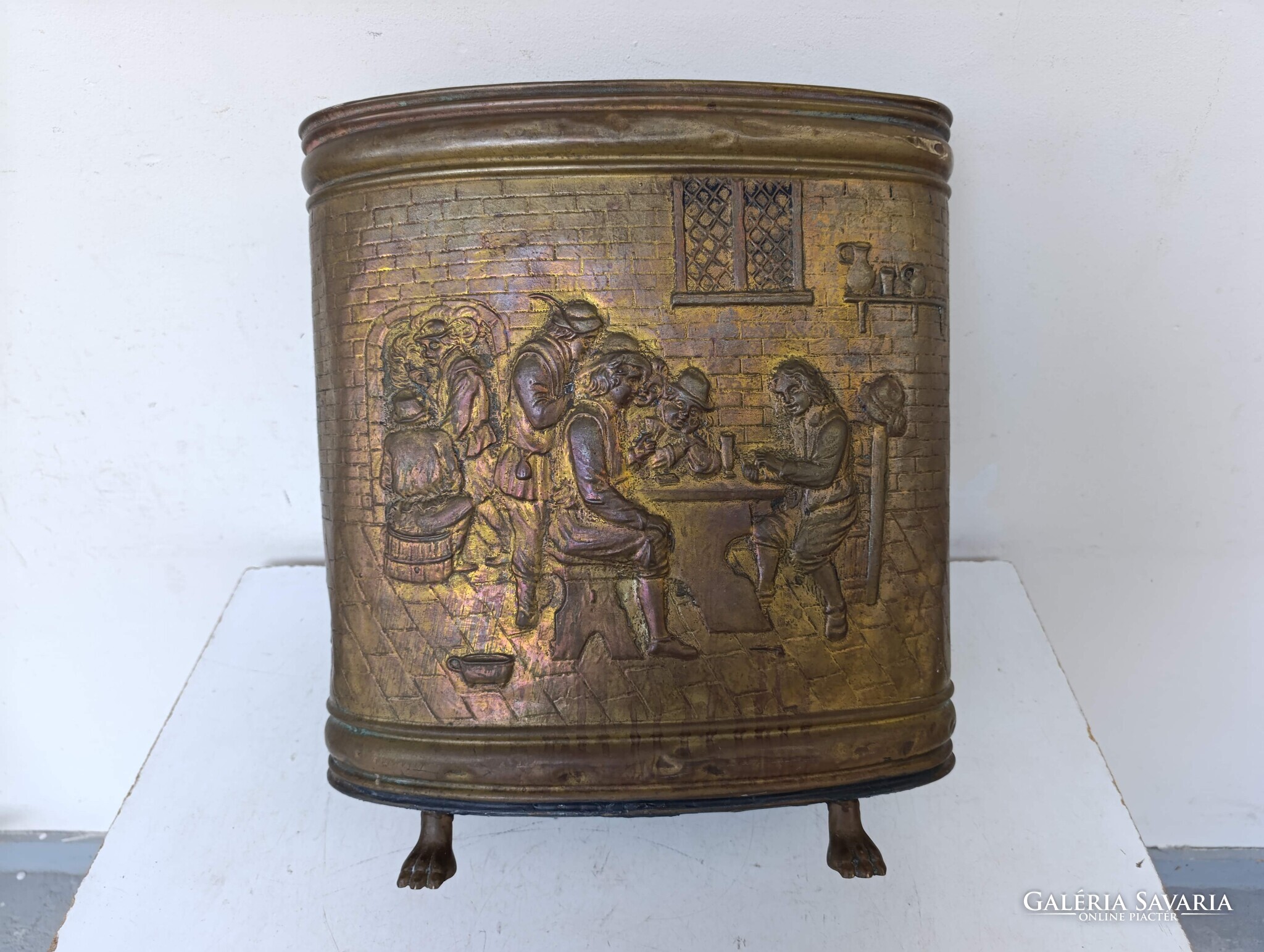 Antik domborított sárgaréz esernyőtartó, mulatozó társaság motívummal, oroszlánlábakkal.