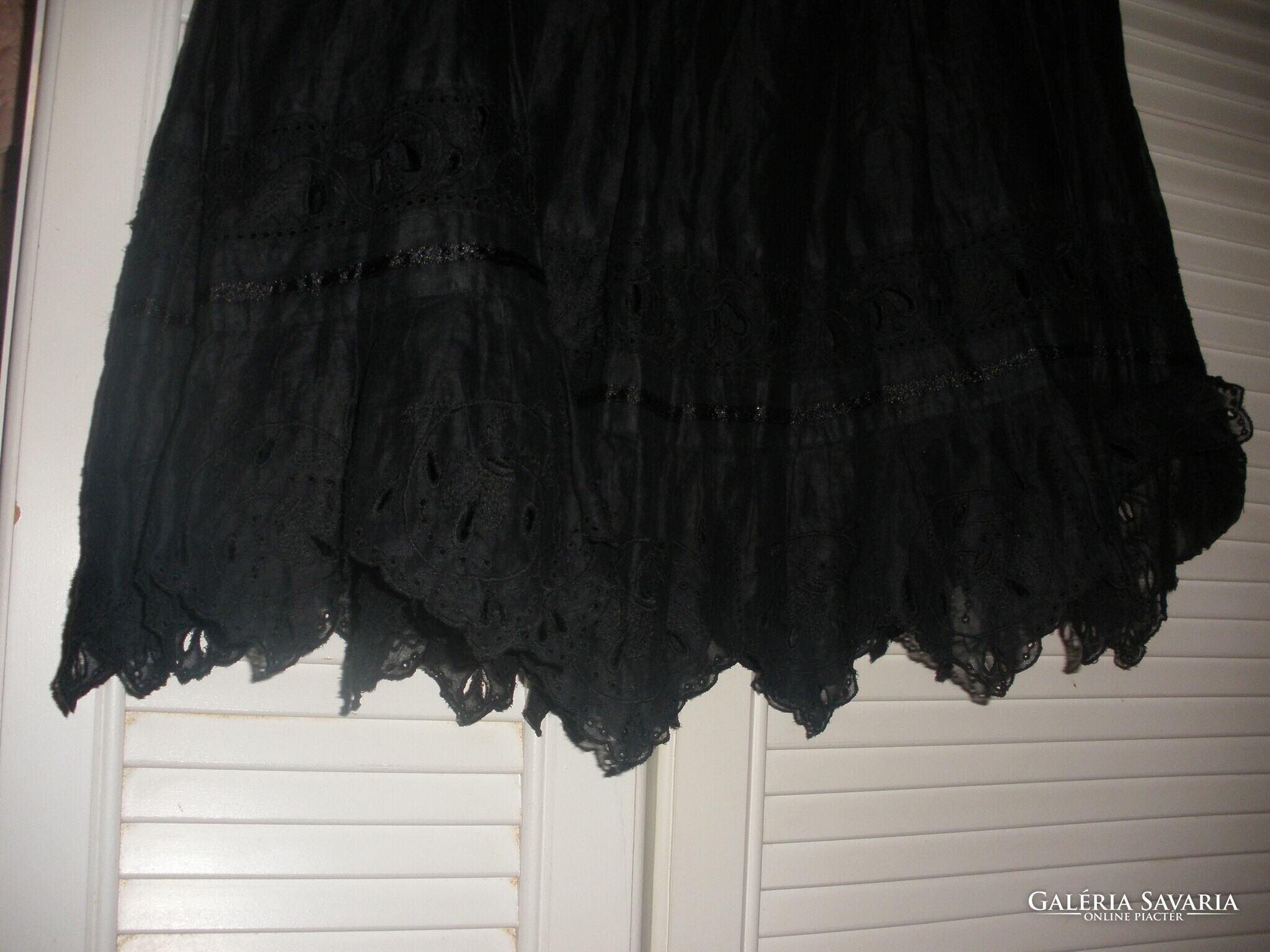 Fekete, vékony béléssel, alján áttört mintával. 62 cm a hossza derék rugalmas, gumírozott 88 cm, de még enged..