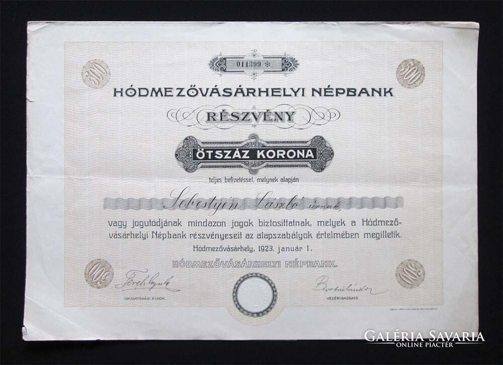 Hódmezővásárhelyi Népbank Részvénytársaság részvény 500 korona 1923