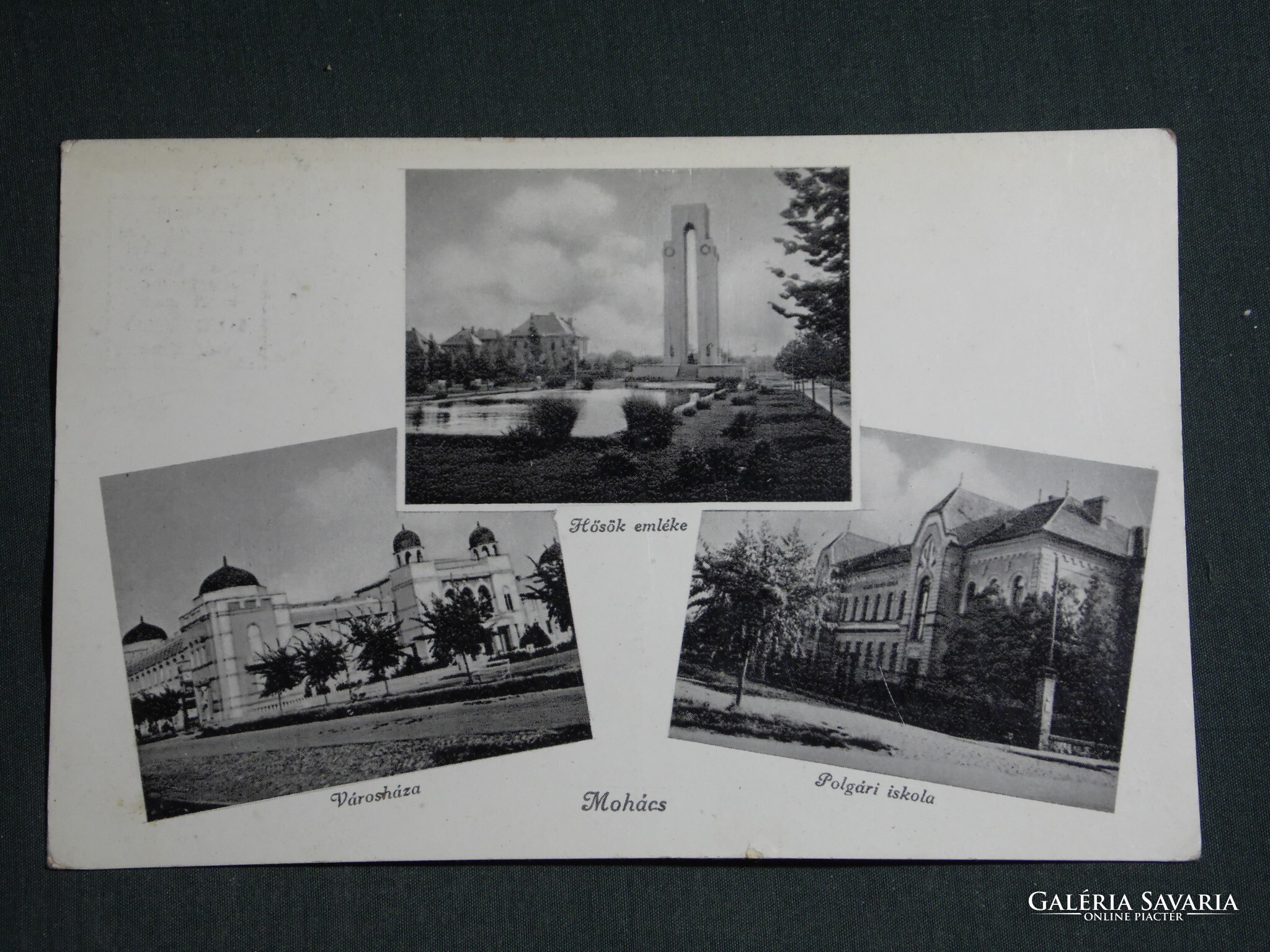 Képeslap,Mohács,mozaik,városháza,emlékmű,iskola,Gárdony Fenyvesi kiadás Bp.,1939-