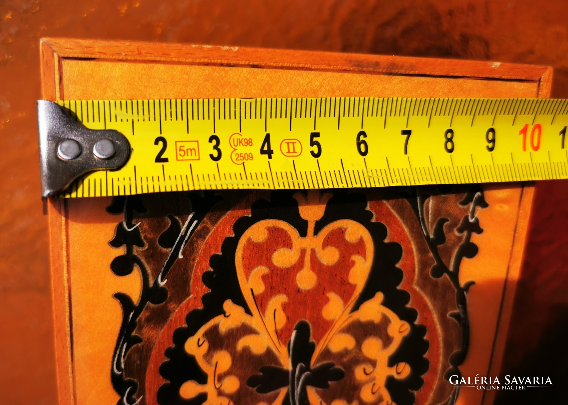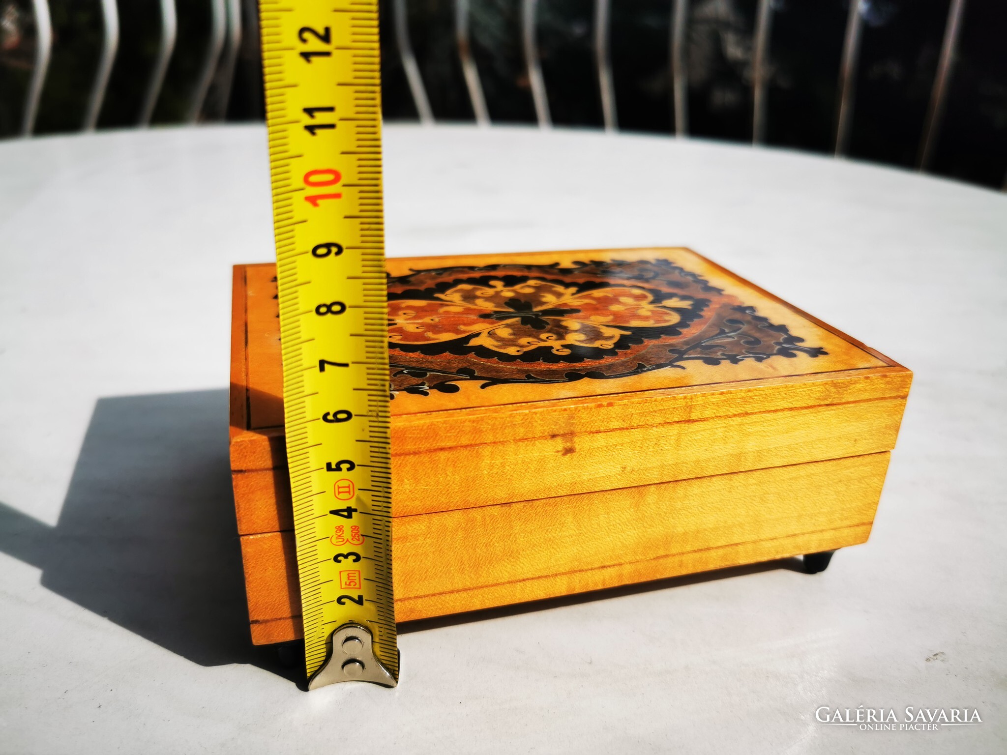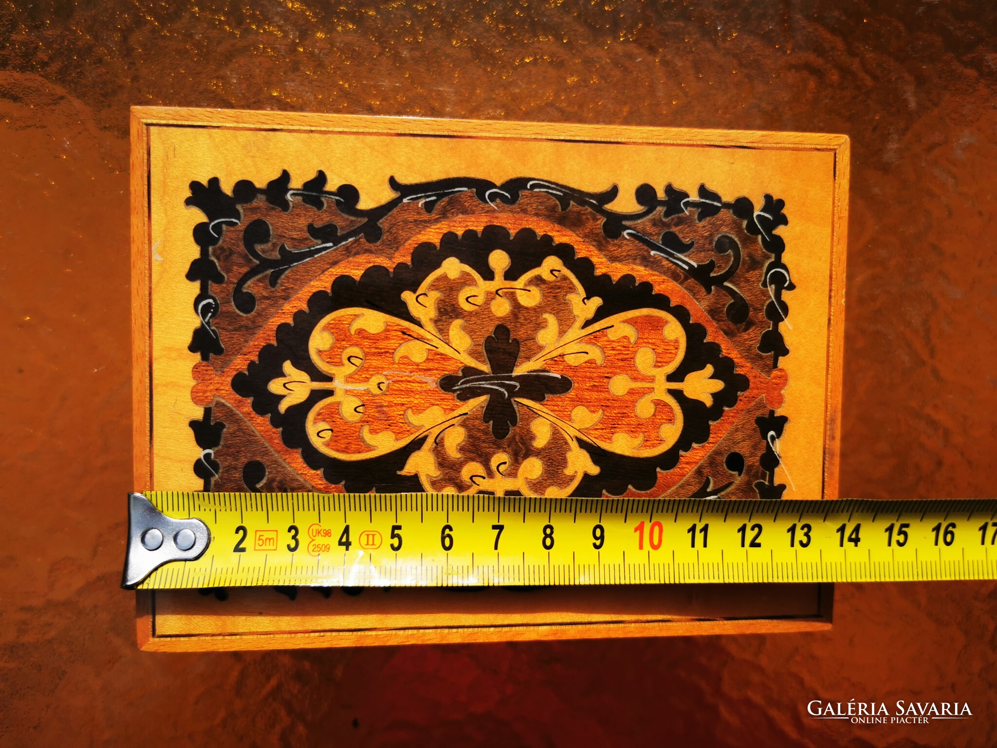 Régi intarziás svájci zenélő fa doboz, 10x14 cm,