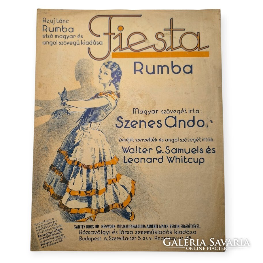 English: Rare Hungarian sheet music of the rumba Fiesta, with lyrics by Andor Szenes and music by Walter G. Samuels & Leonard Whitcup.