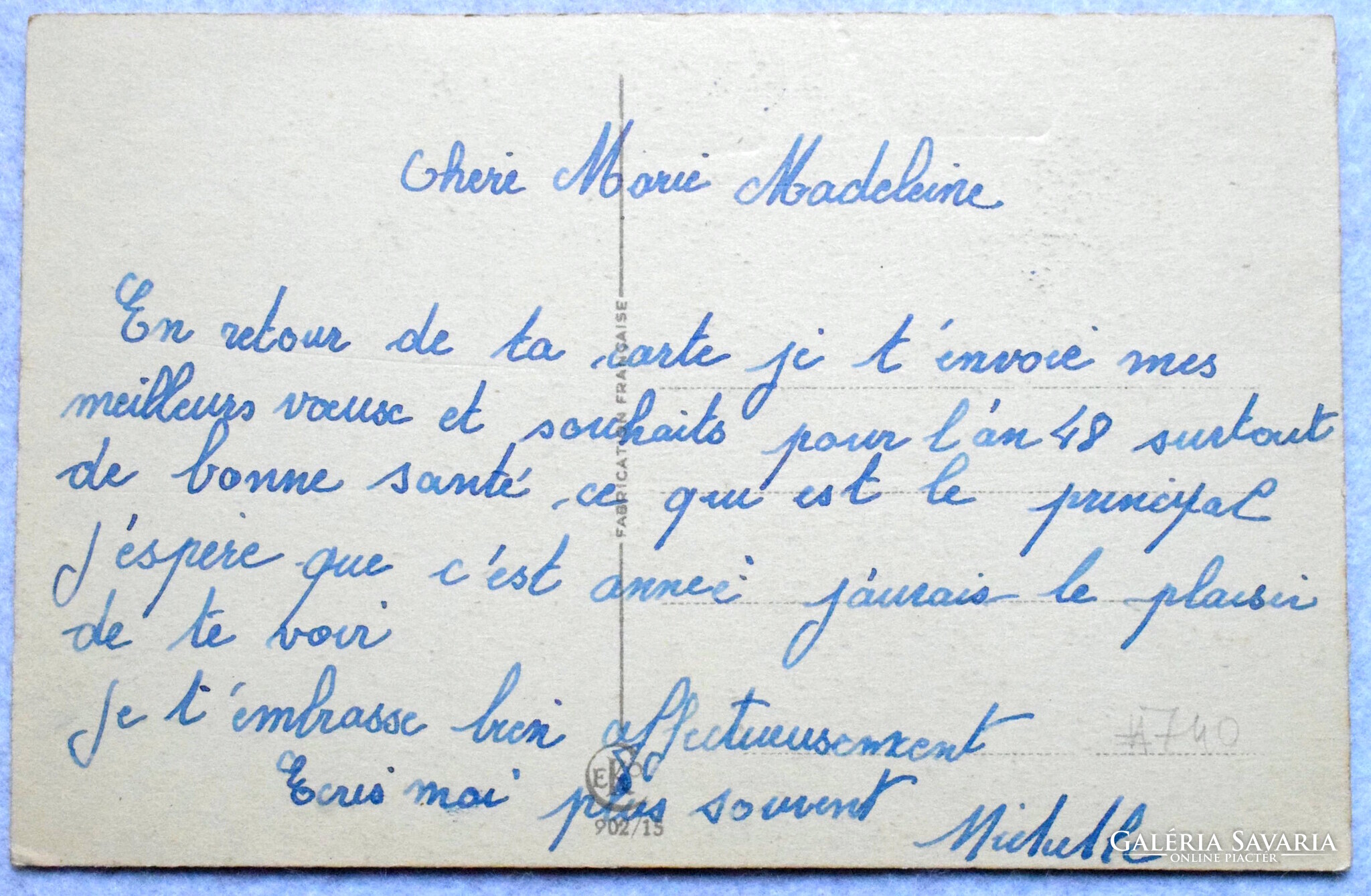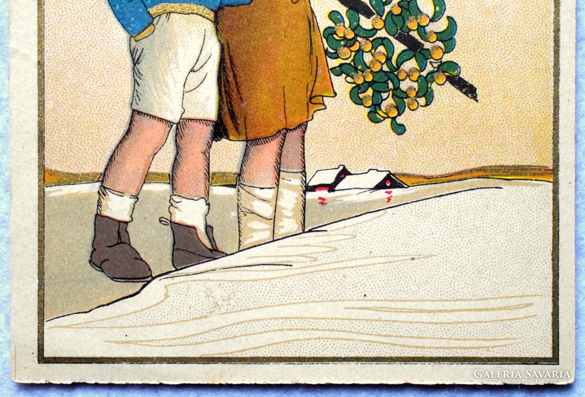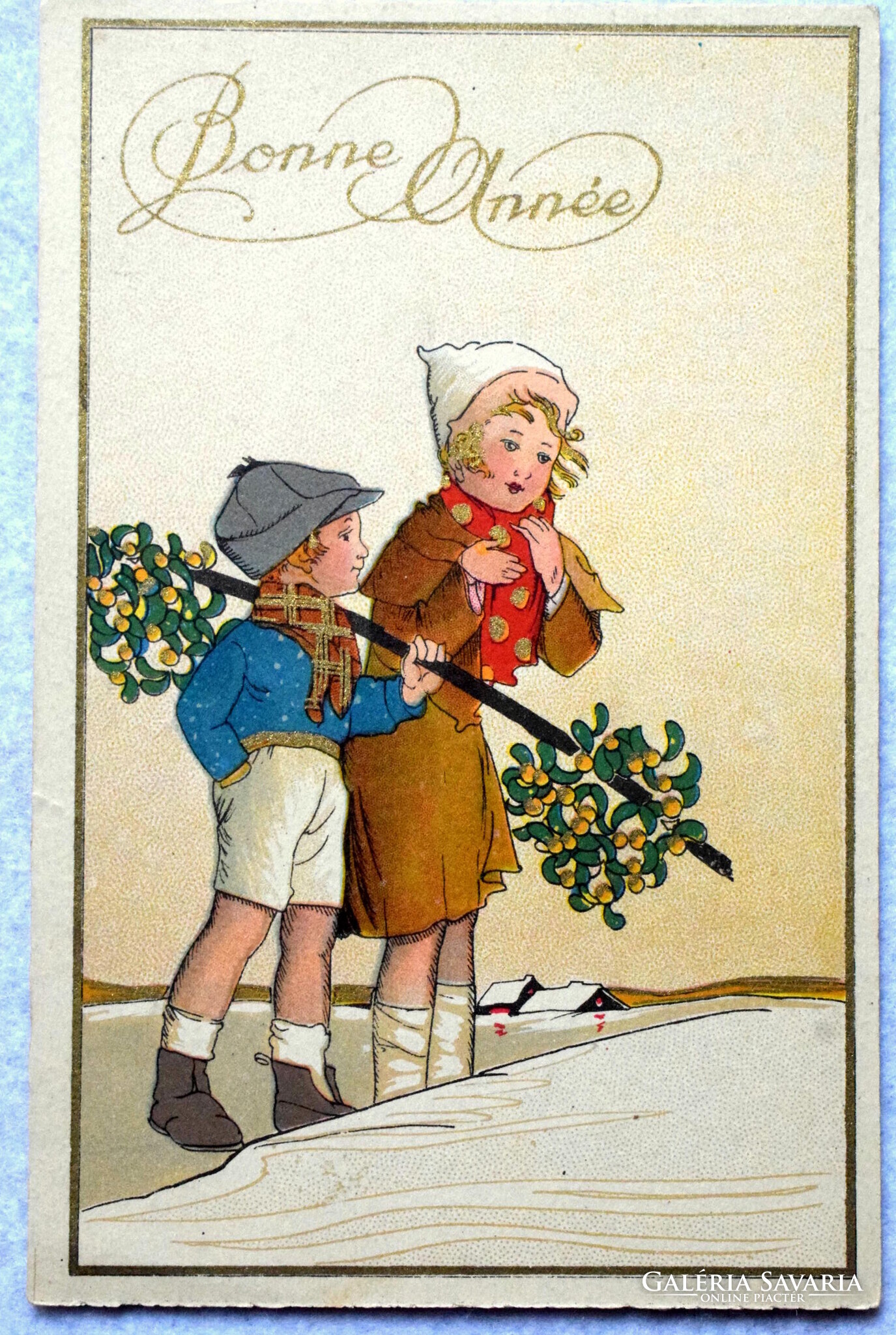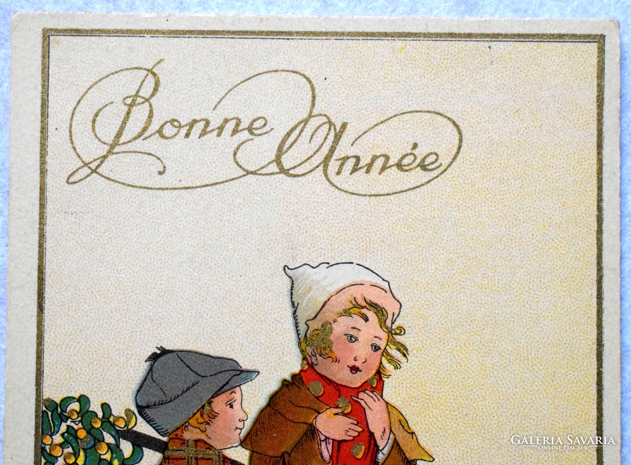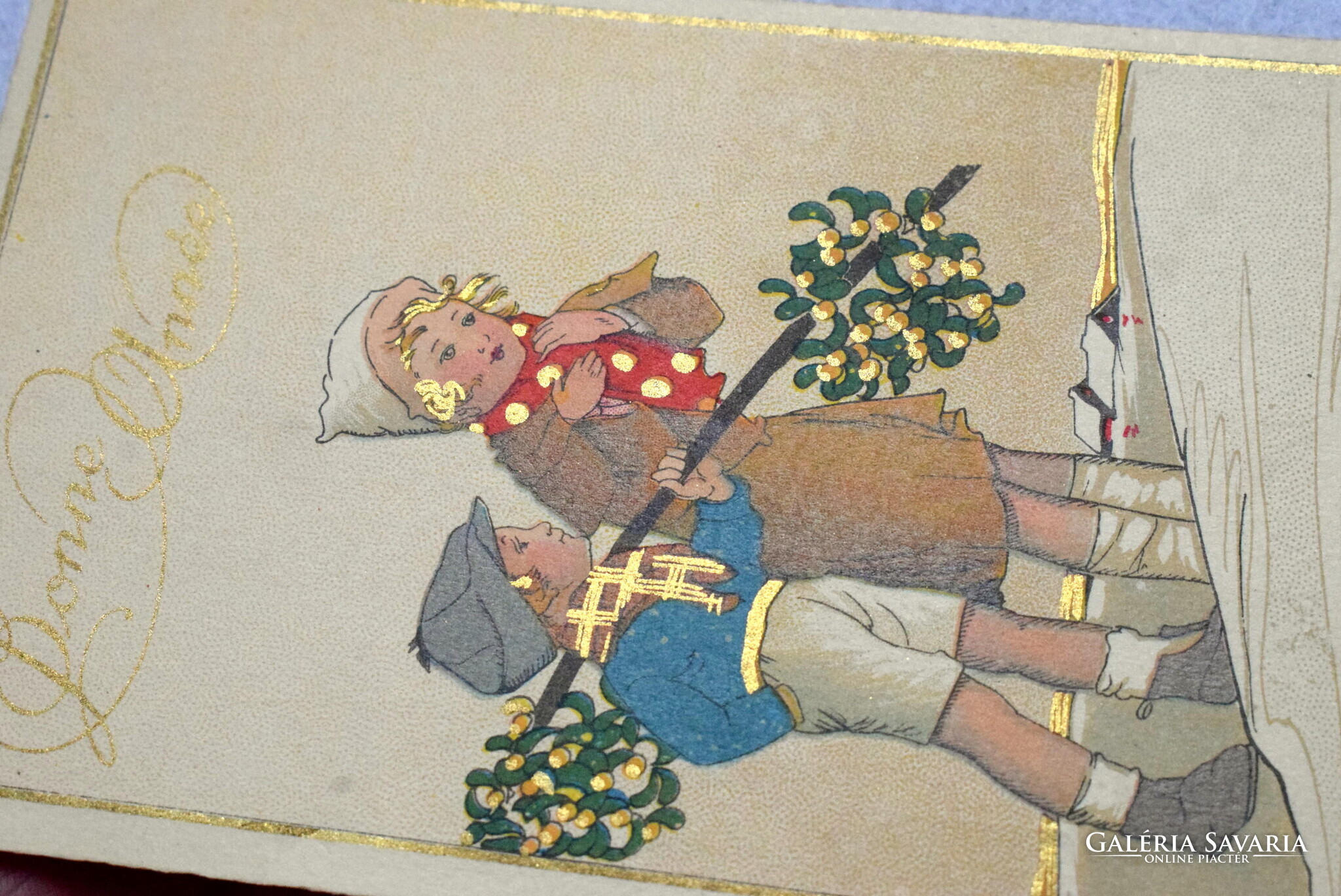 Art deco újévi üdvözlő litho képeslap - gyerekek , fagyöngy aranyszín felülnyomás