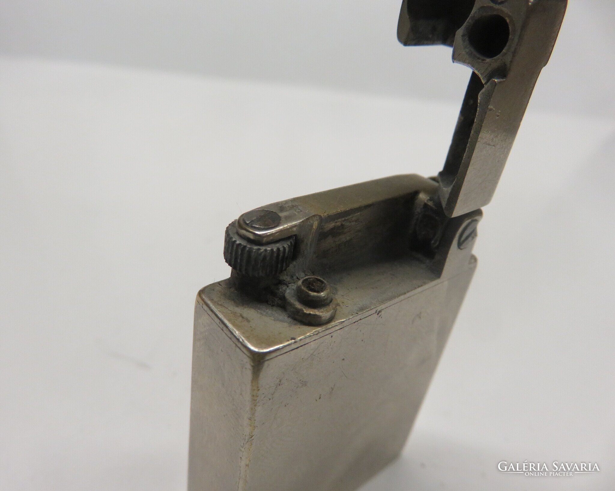 Régi Magyar nikkelezett Gamma benzines öngyújtó.Bal felső sarkában Bíró Mihály Kalapácsos Munkás plakátjának másolata.Szikrát ad.A képeken látható,korához képest szép állapotban.Mérete:5x3,5x1 cm