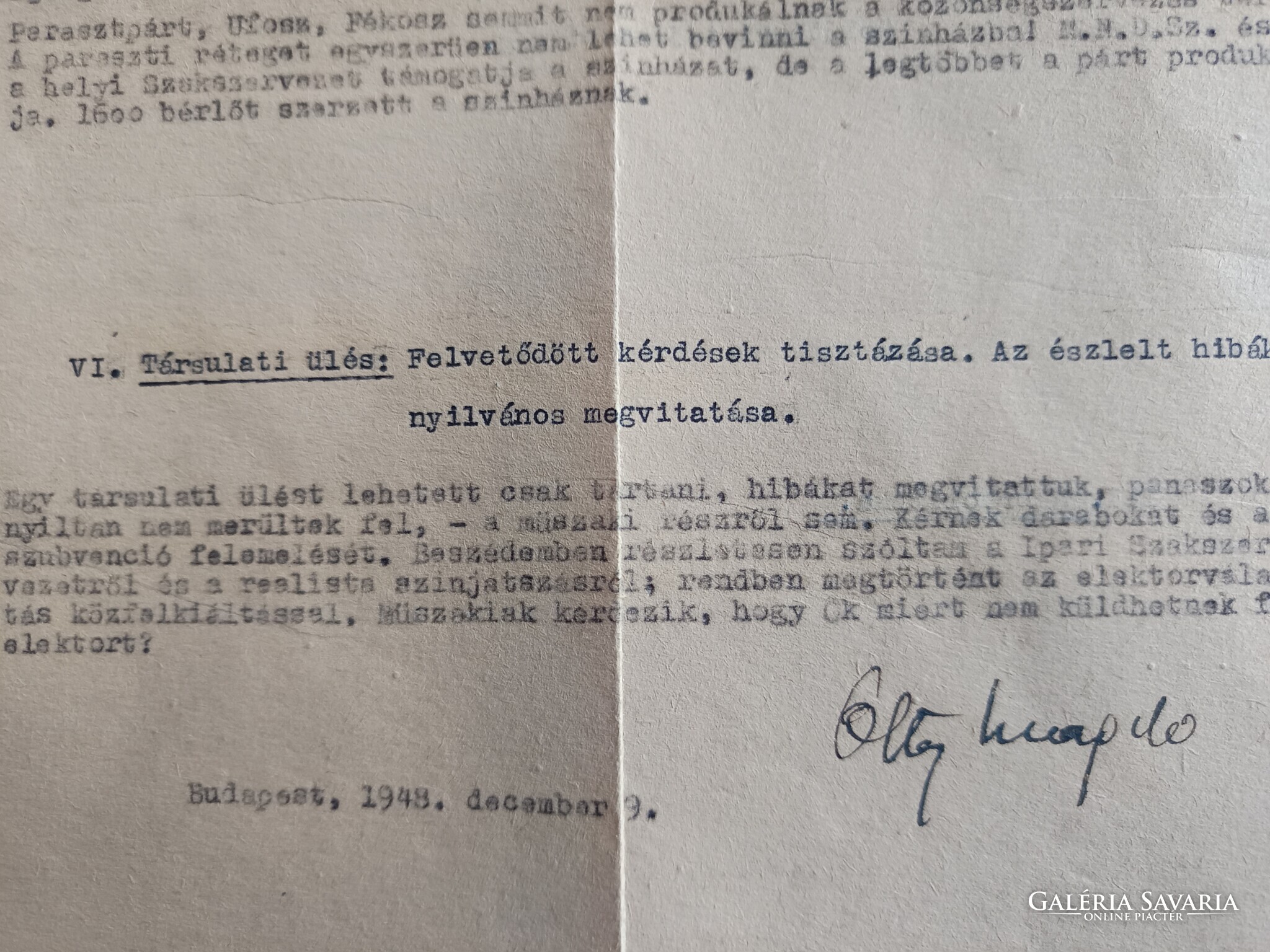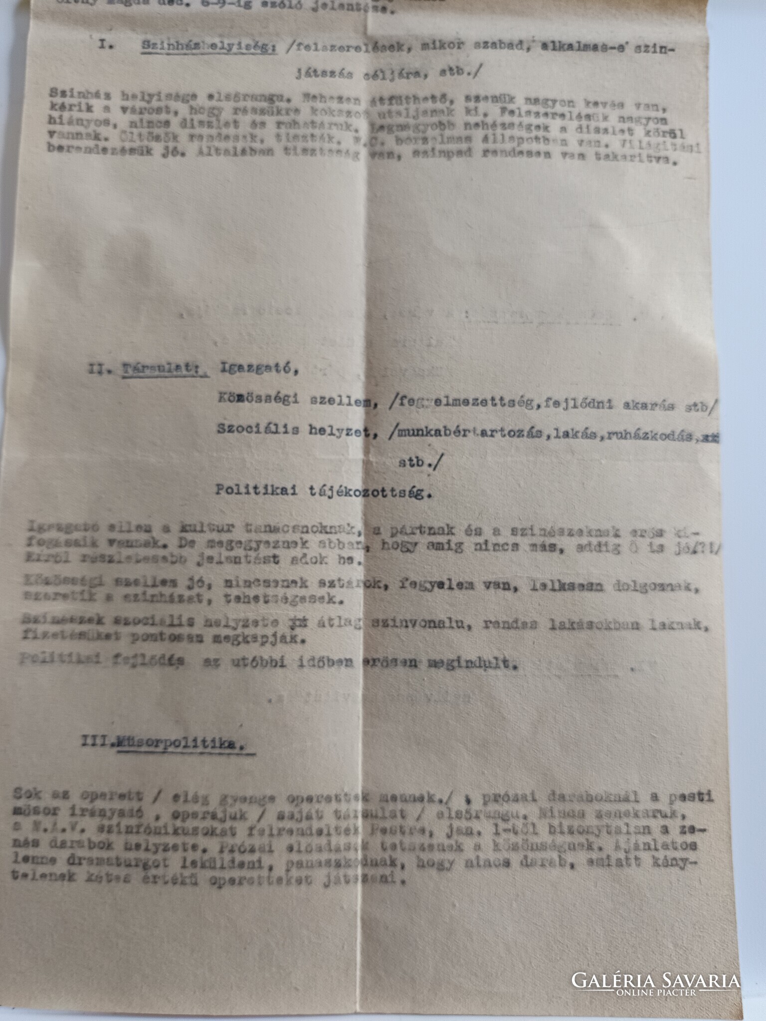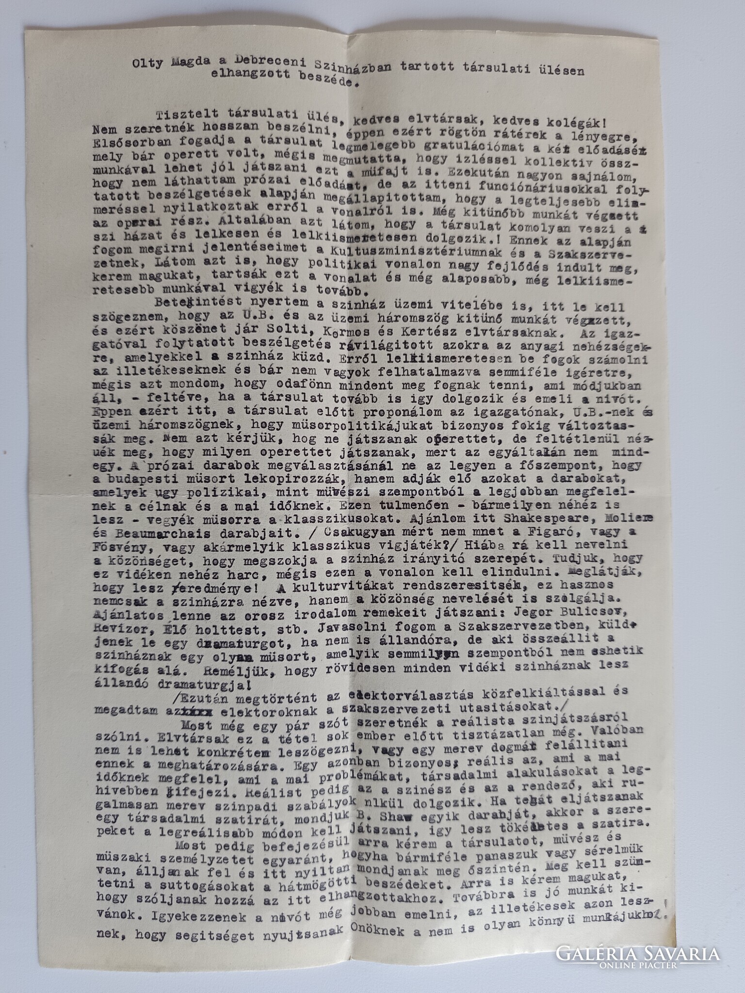 Olthy Magdolna jelentése a Sereghy Andor vezette debreceni Csokonai színházról. Eredeti aláírt dokumentumok!