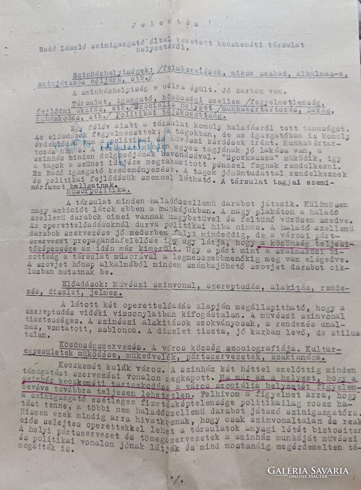 Vidéki színházak államosítása -Radó László kecskeméti társulata bizalmas jelentés 1949..