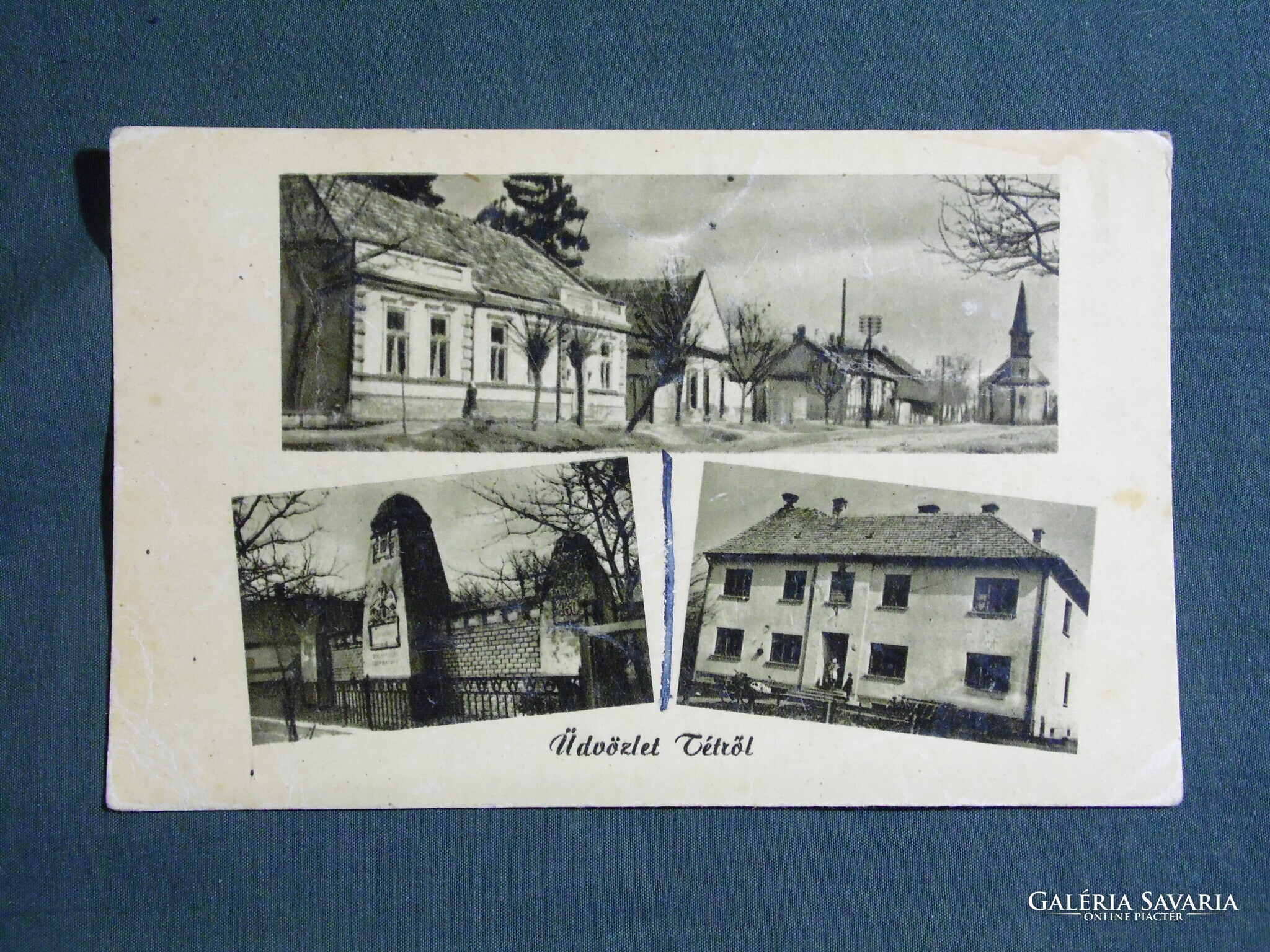 Képeslap,Tét,községháza,emlékmű,utca,templom látkép,részlet,1950-