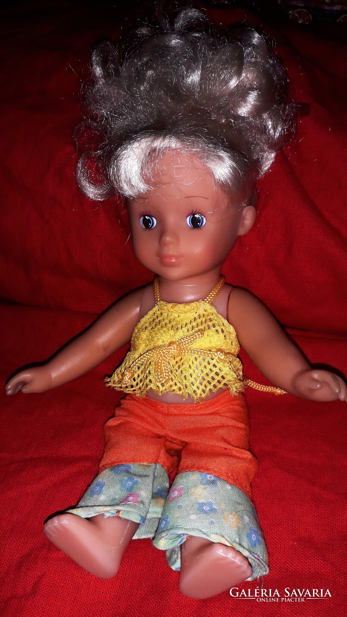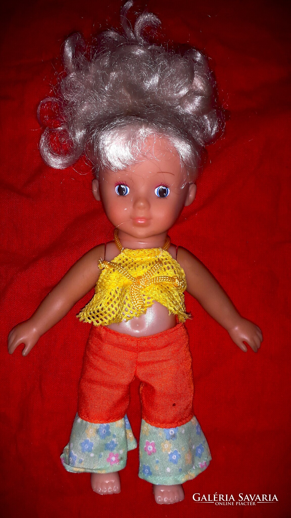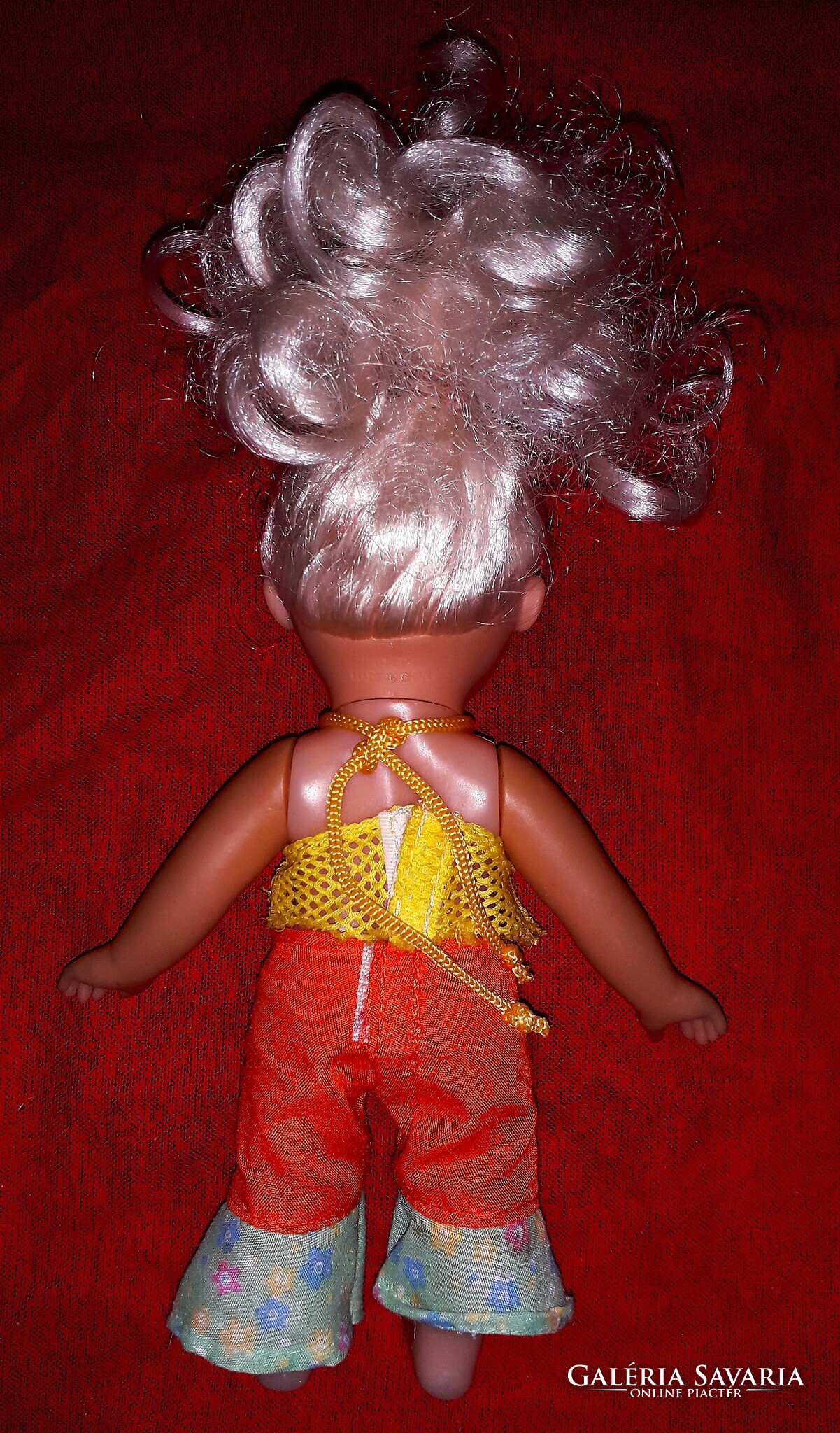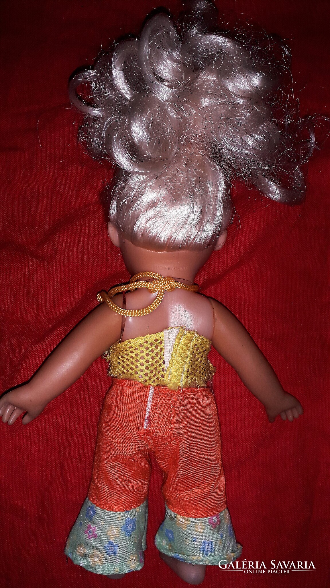 Régi német ültethető plasztik játék hajas baba modern ruházatban szép állapot 24 cm a képek szerint