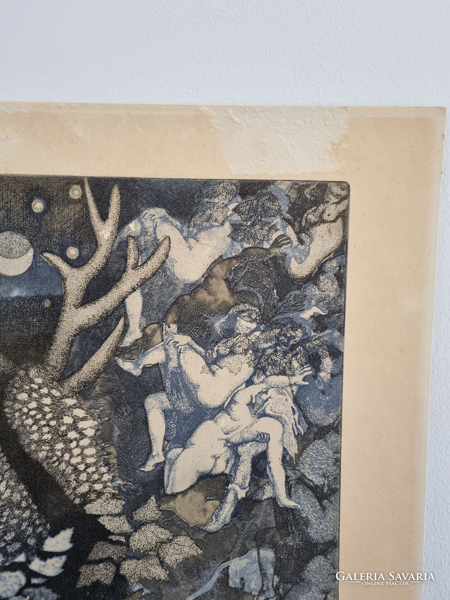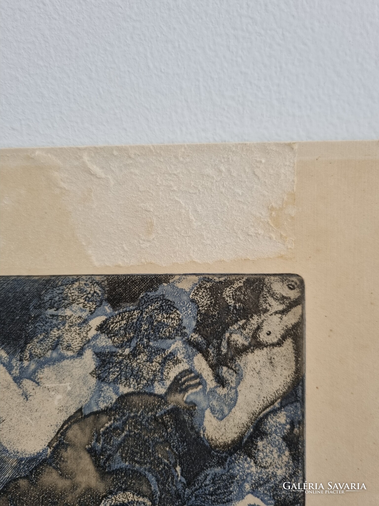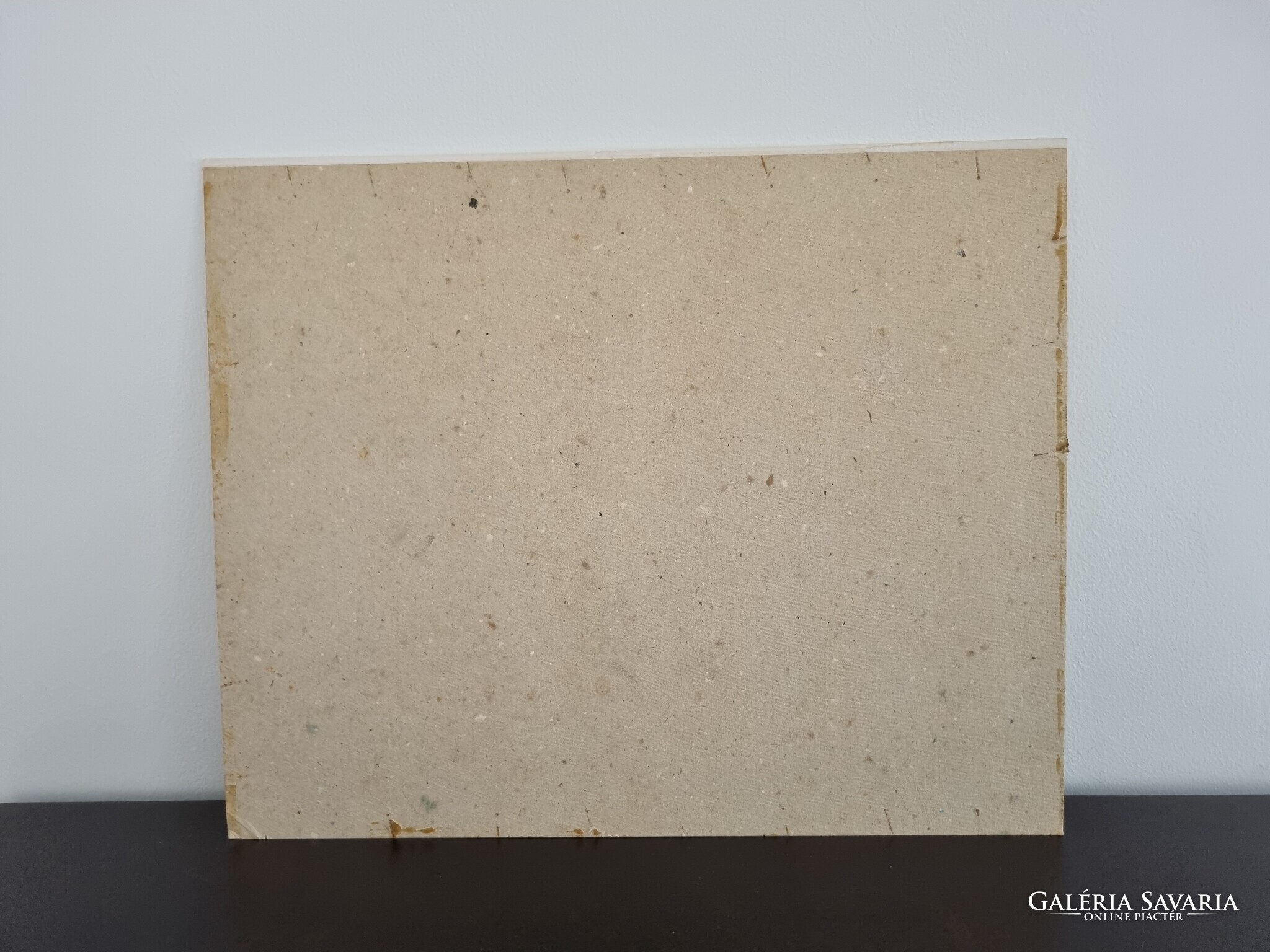Nagyon szép alkotás,maga a nyomat sértetlen, viszont a karton dúc feletti felületét egy öntapadós ragasztócsík felsértette.Sajnos így volt rögzítve a régi paszpartuhoz az alkotás.Újrakeretezve ez a hiba orvosolható .Egyik sarka kissé gyűrődött, de alig észrevehető, a papír fakult. Nem mai darab...Kérem, a fentieket vegye figyelembe vásárláskor.