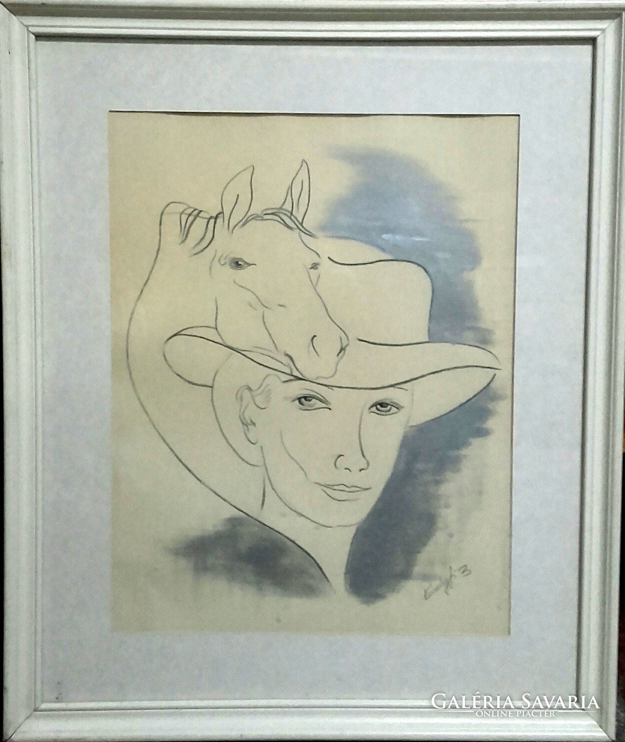 A ló és az ember kapcsolata, a női szépség, az állat szépsége, a méltóságos tekintetek inspirálta a képet. Akvarellkréta, és ezüstfesték.Üveg alatt nehéz fotózni.