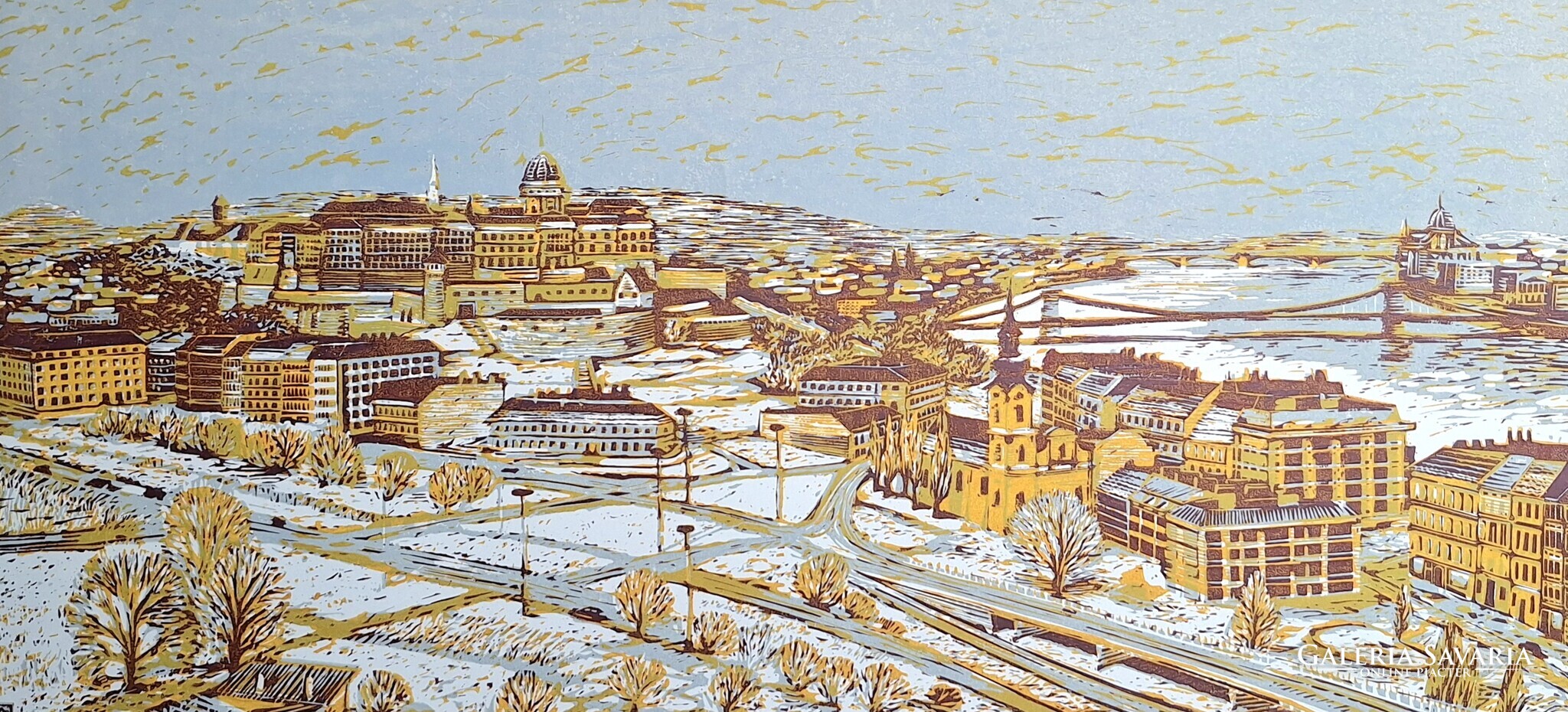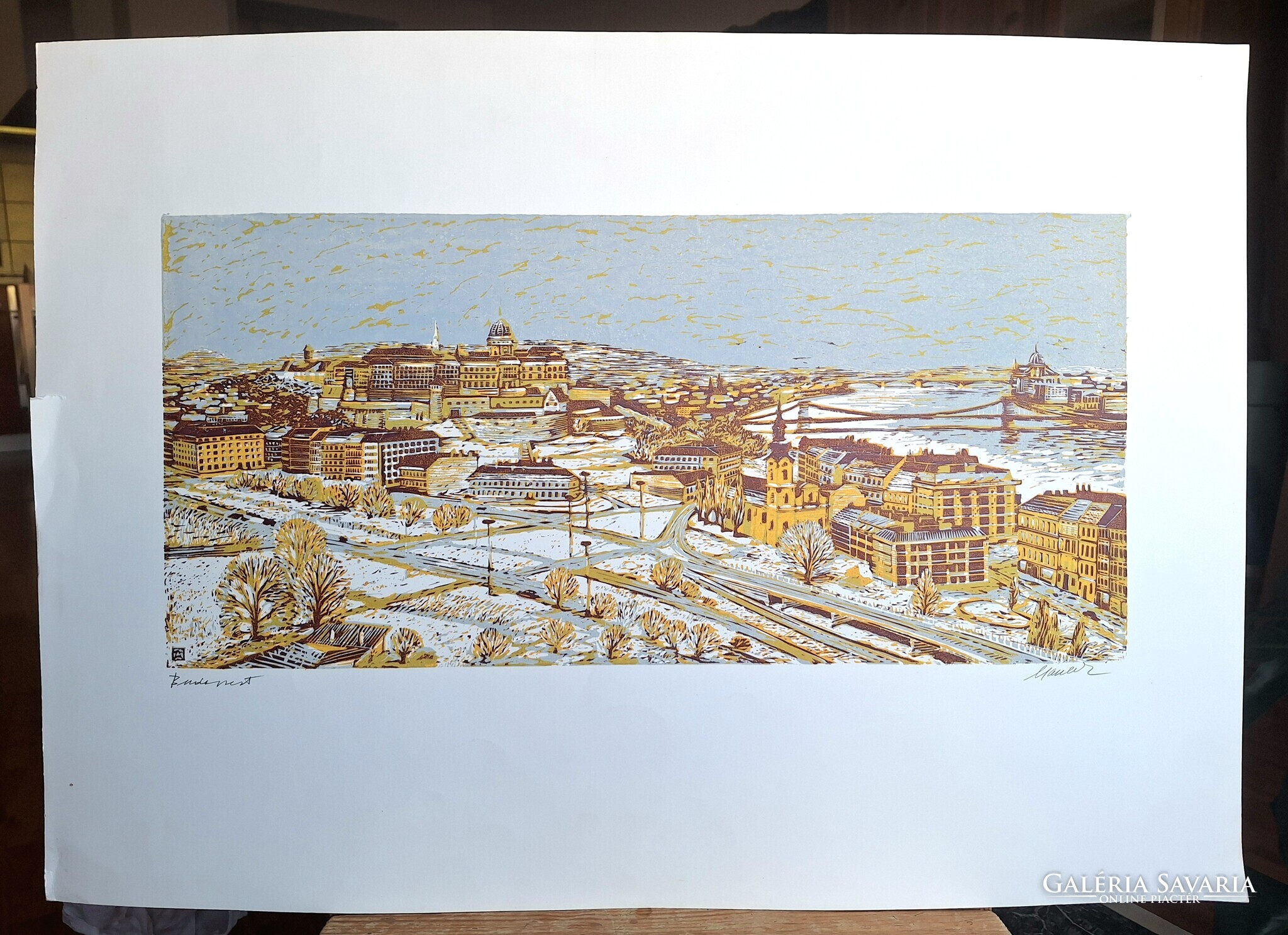 Csavlek András: Budapesti látkép (nagyméretű színes linómetszet) Budai Vár, Duna, Lánchíd