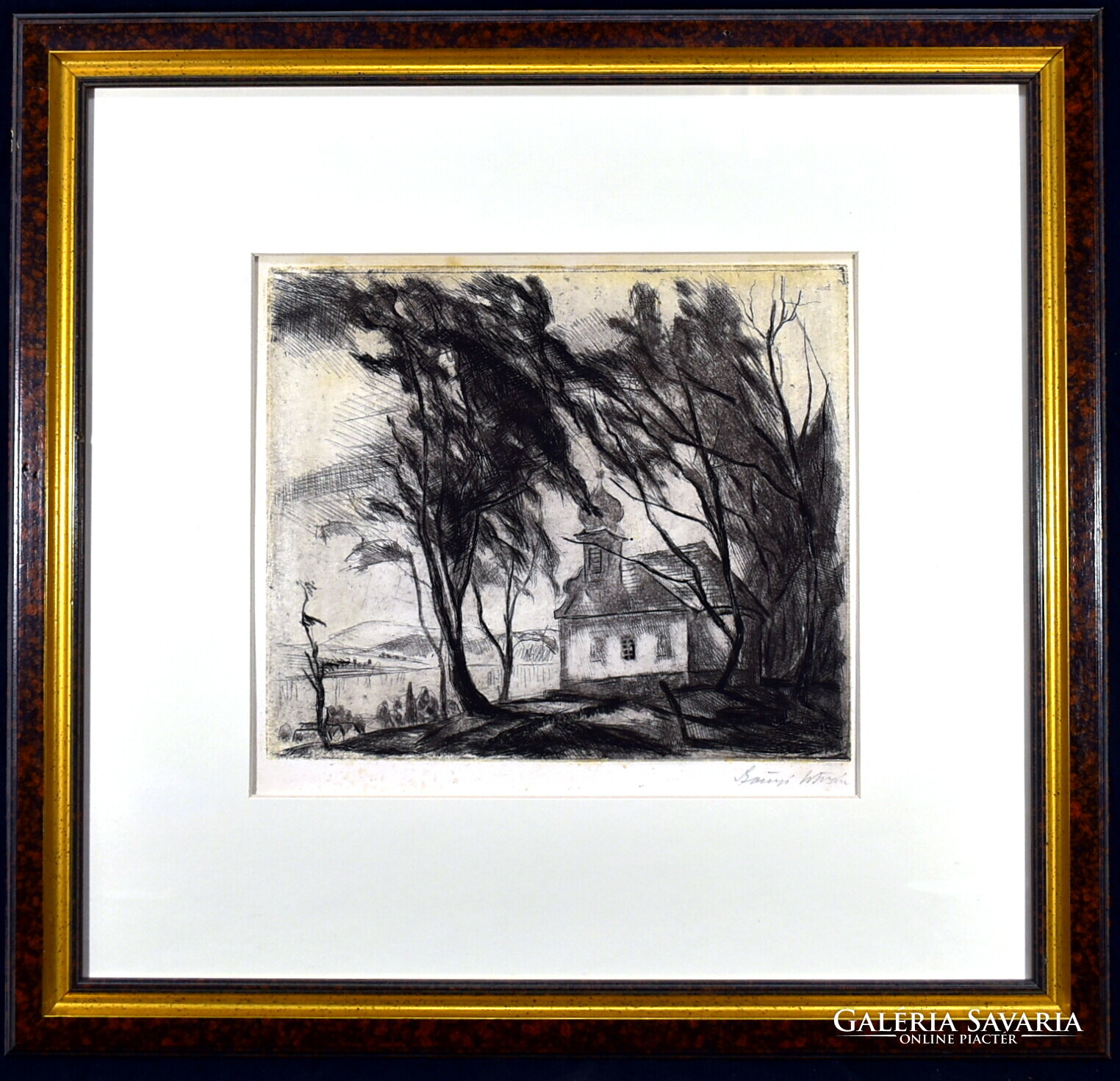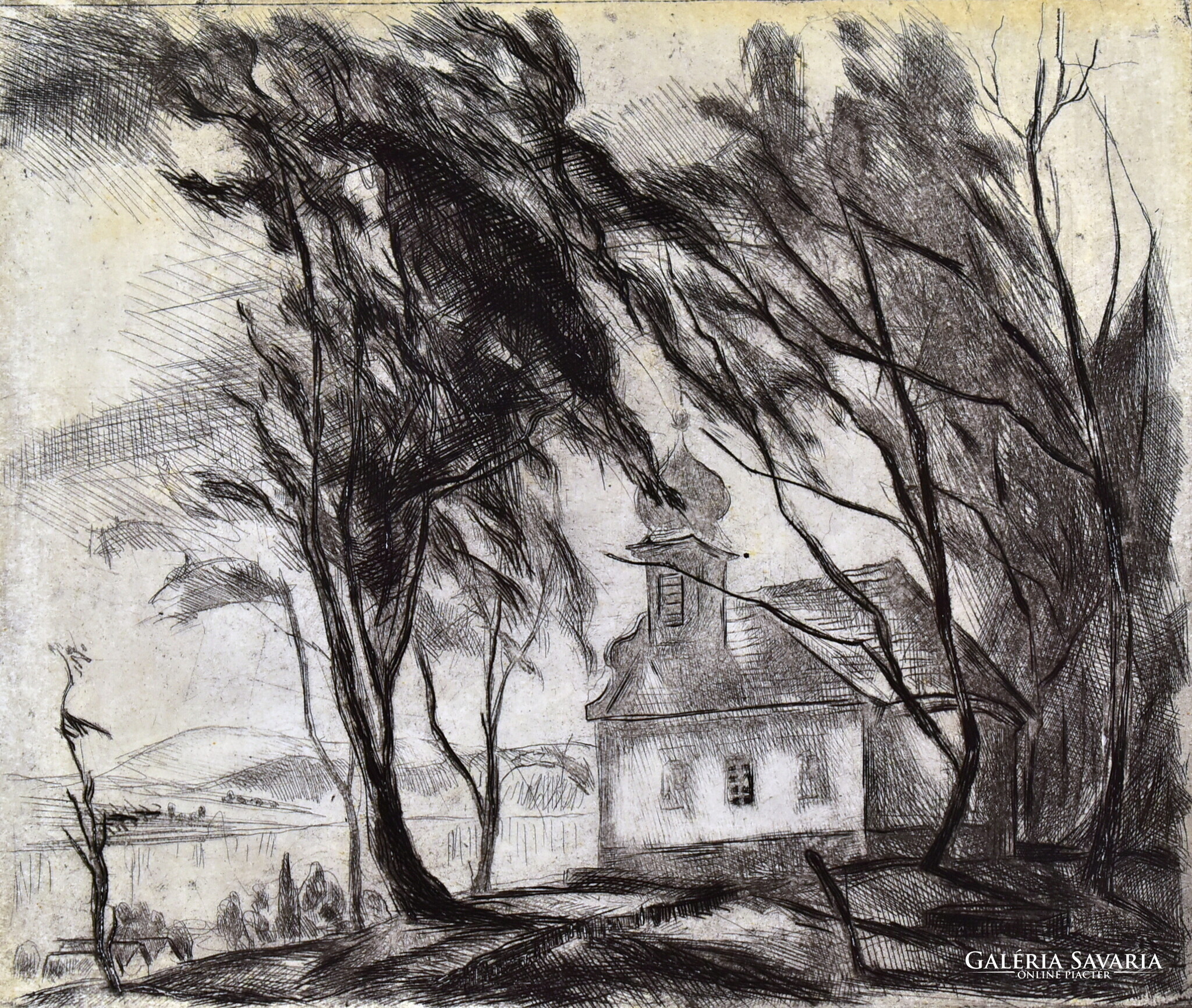 Rézkarc - papír , jelezve jobbra lent , kép m.: 20.5 x 24 cm Igényes modern keretezéssel : 43 x 45.5 cm Ikonikus zebegényi helyszín , ikonikus zebegényi festőtől !
