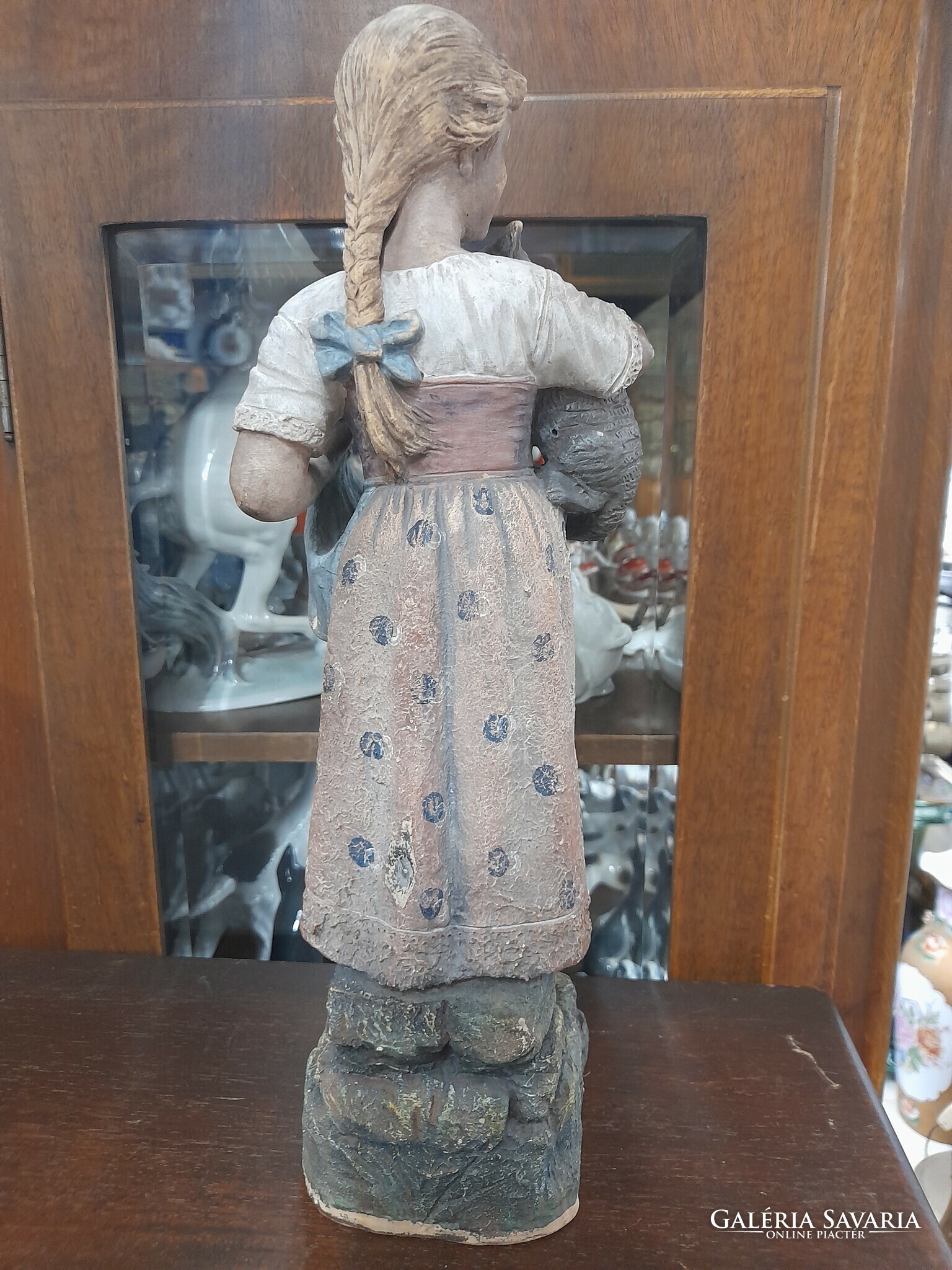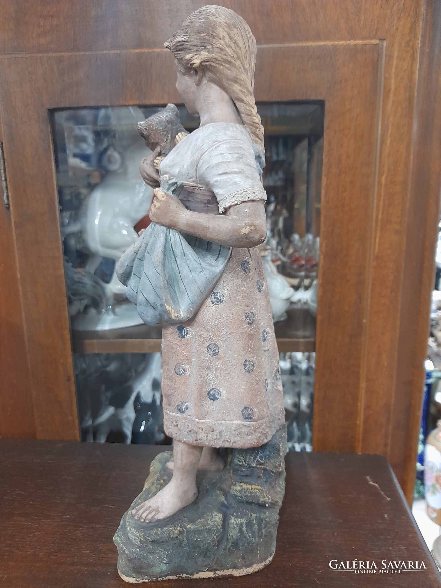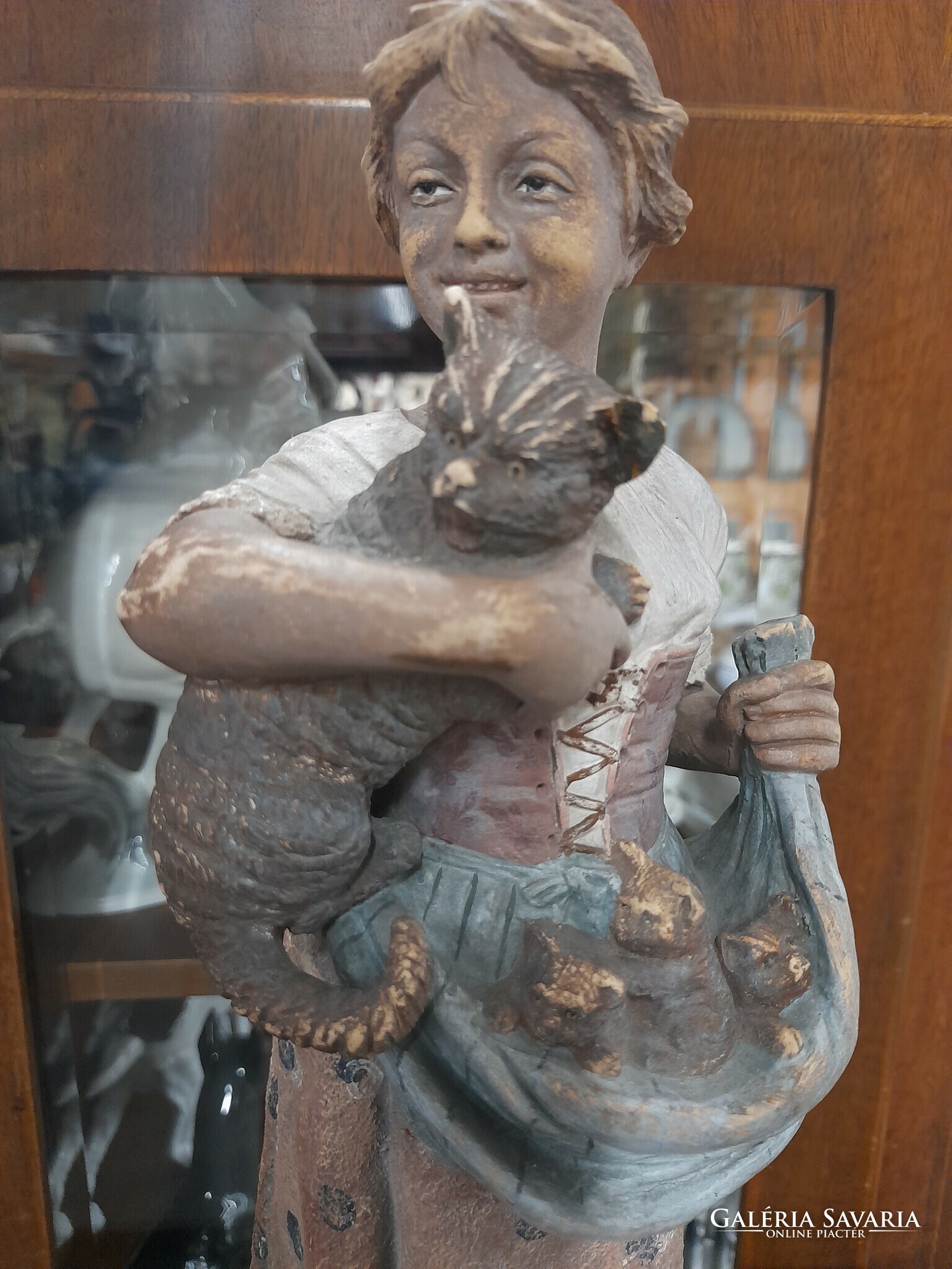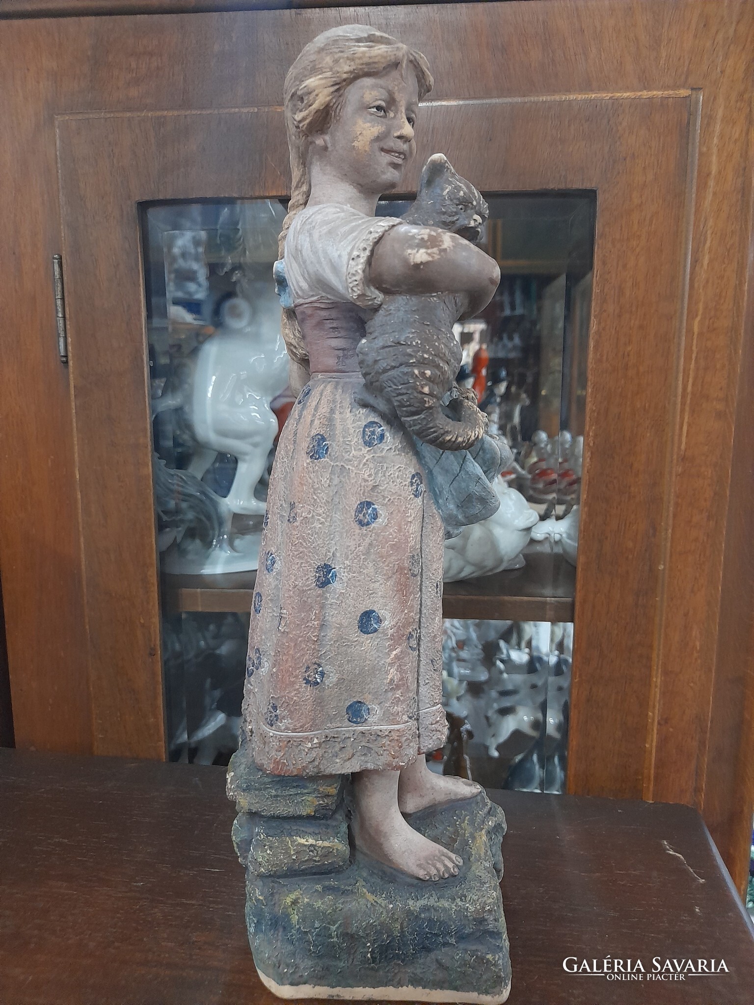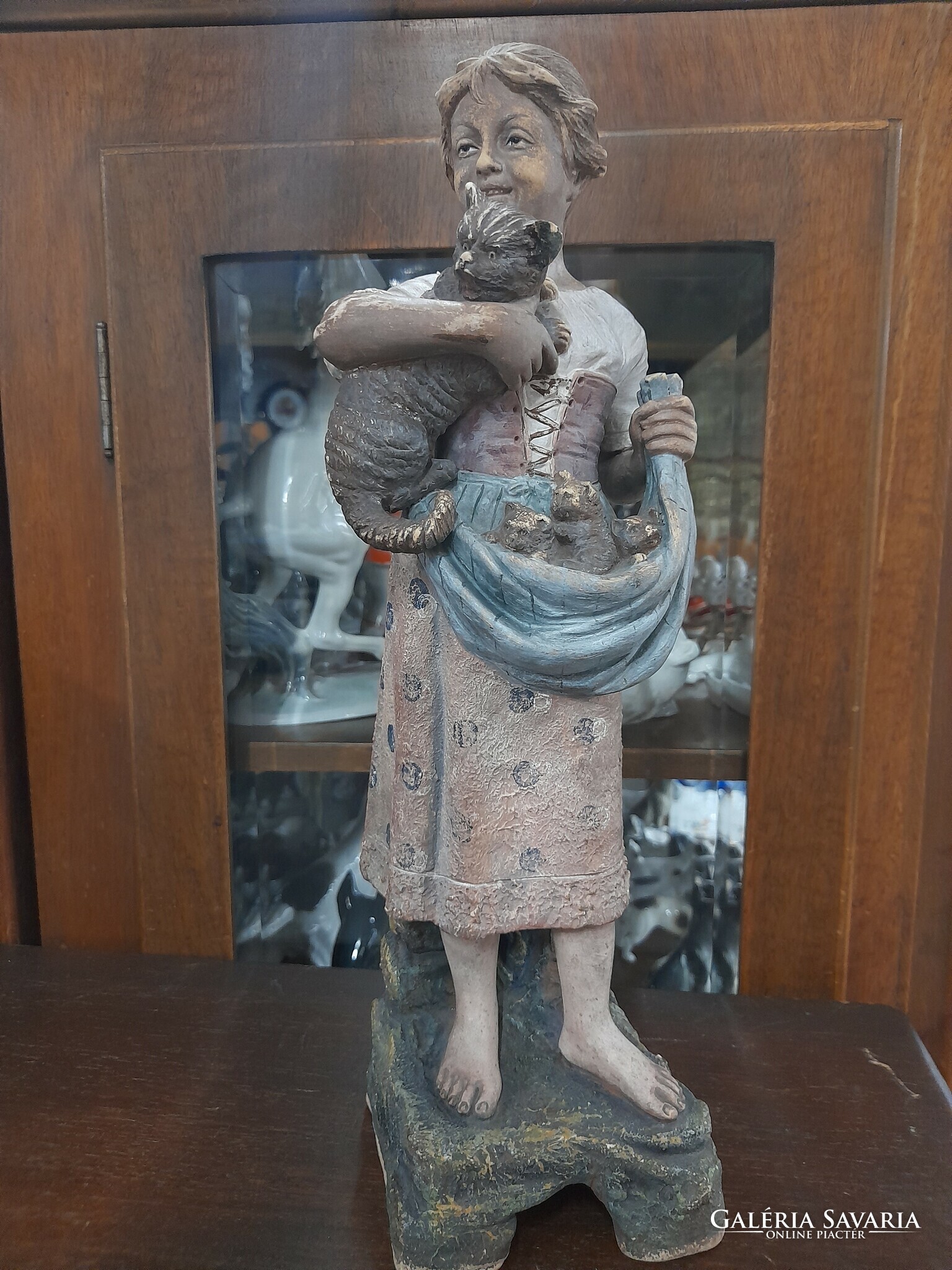 Eladó ritka Német Bernhard Bloch & Co 1895-1898,Eichwald macskás lány majolika terrakotta figura a képeken látható fellelt állapotban.Korából adódó felületi kopással.