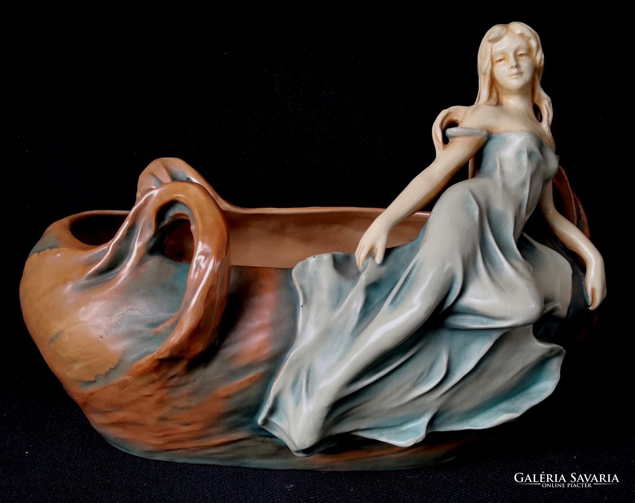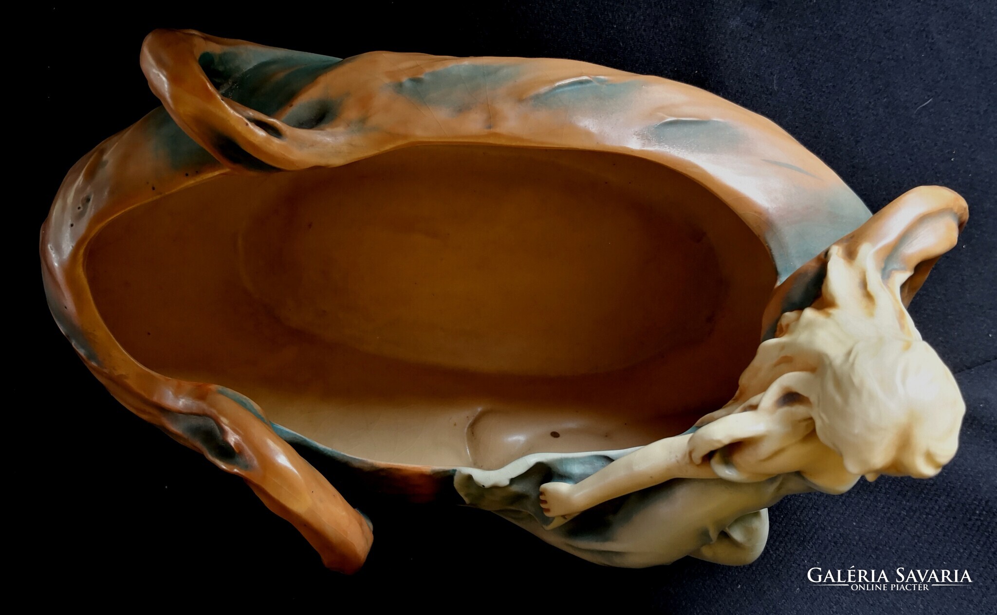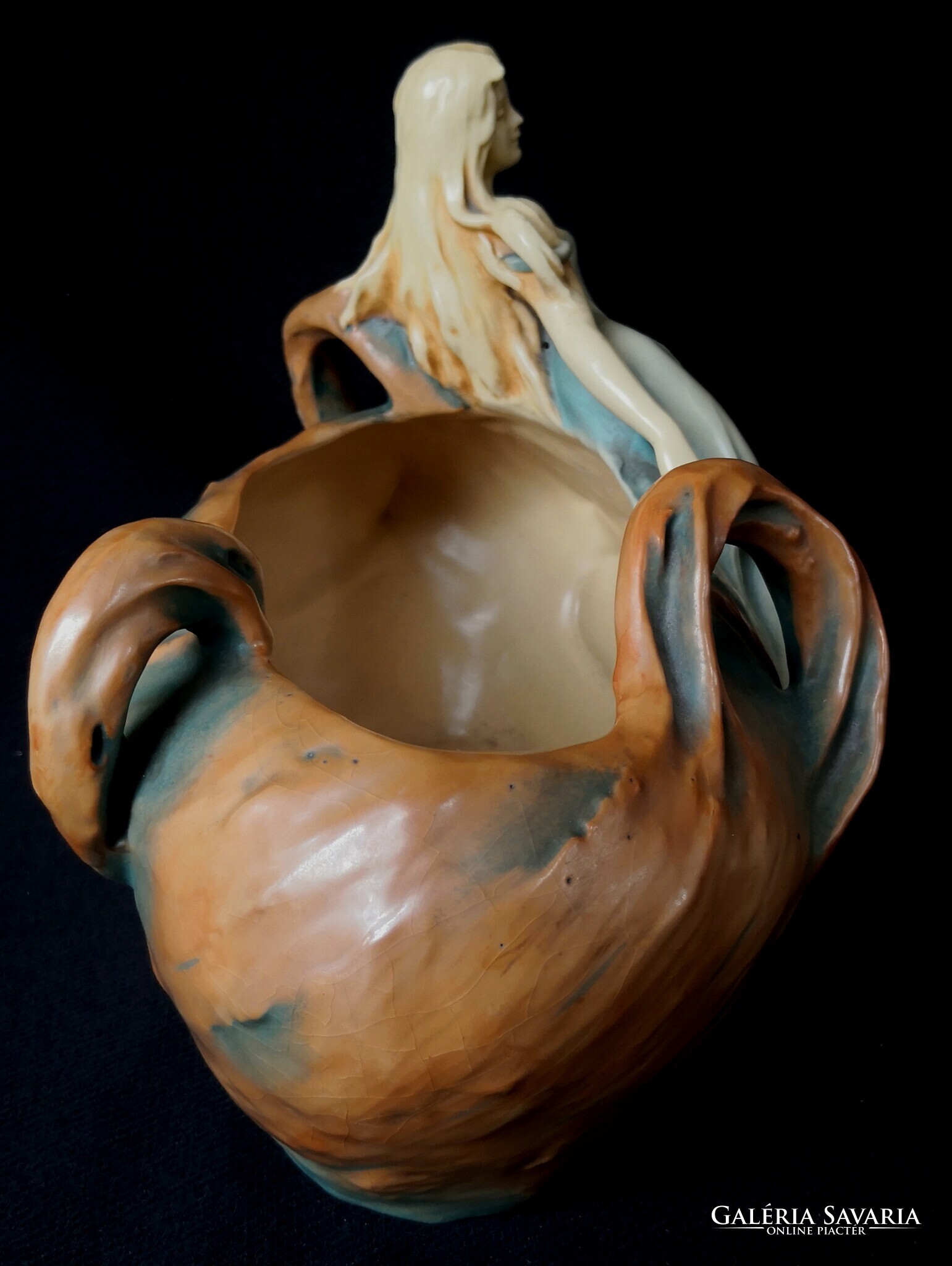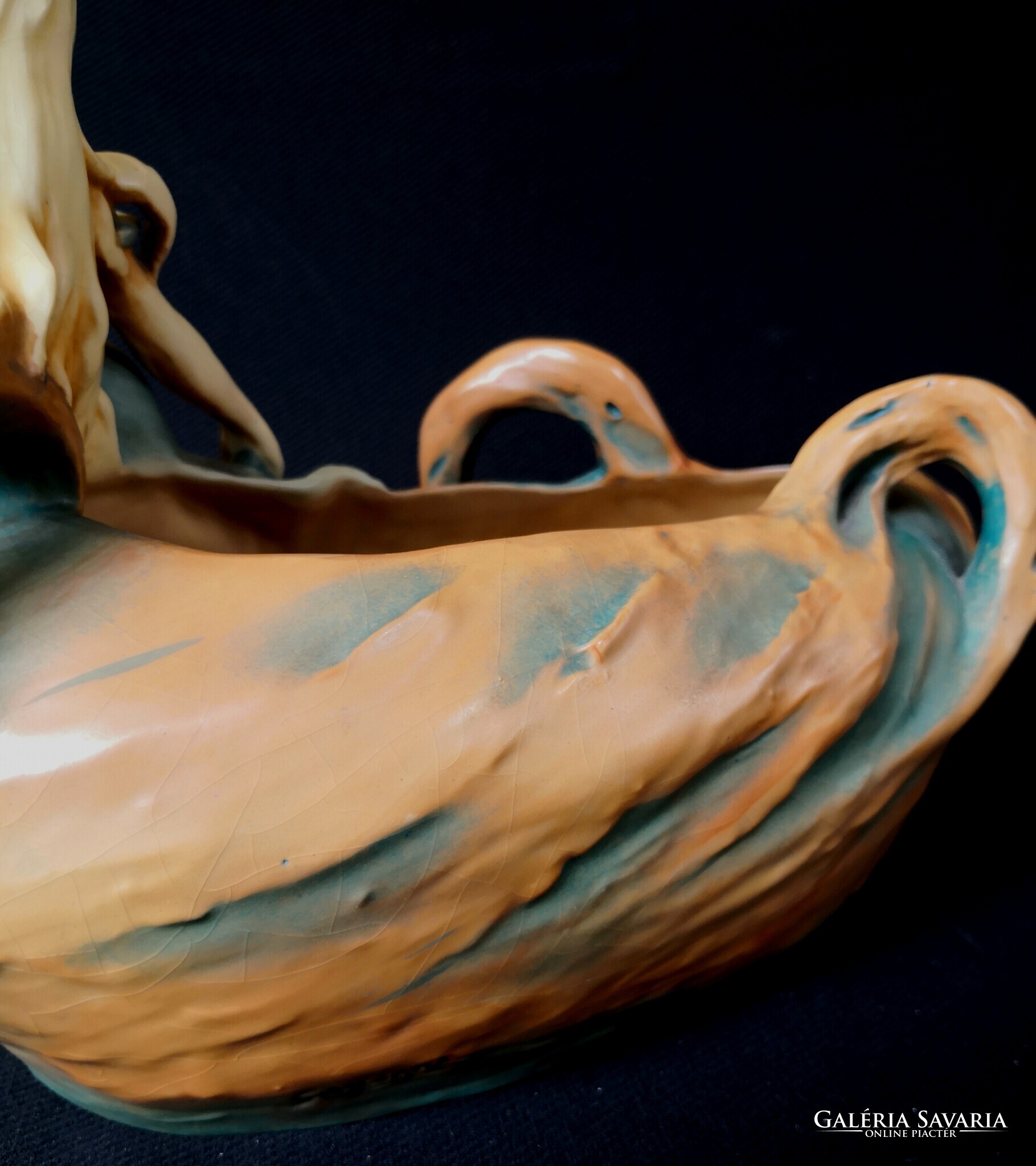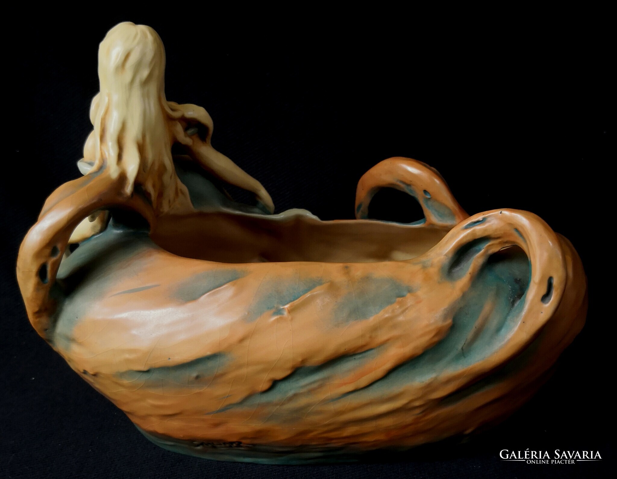Eladásra kínálom ezt a gyönyörű Bernard Bloch, szecessziós stílusjegyű osztrák alkotást, matt zöld mázzal. A kínáló ívelt, hullámos díszítéssel, egy csodaszép női alakkal díszített. Szép kidolgozás. Enyhe mázrepedés előfordul, törés, restaurálás nyomát nem találtam. Alján jelzés: B.B., 7162-es formaszámmal, valamint a tervező, SCHWARZ jelzéssel. Jelzése alapján 1890-1919 között készülhetett. Ritka és gyönyörű, gyűjteményes darab.