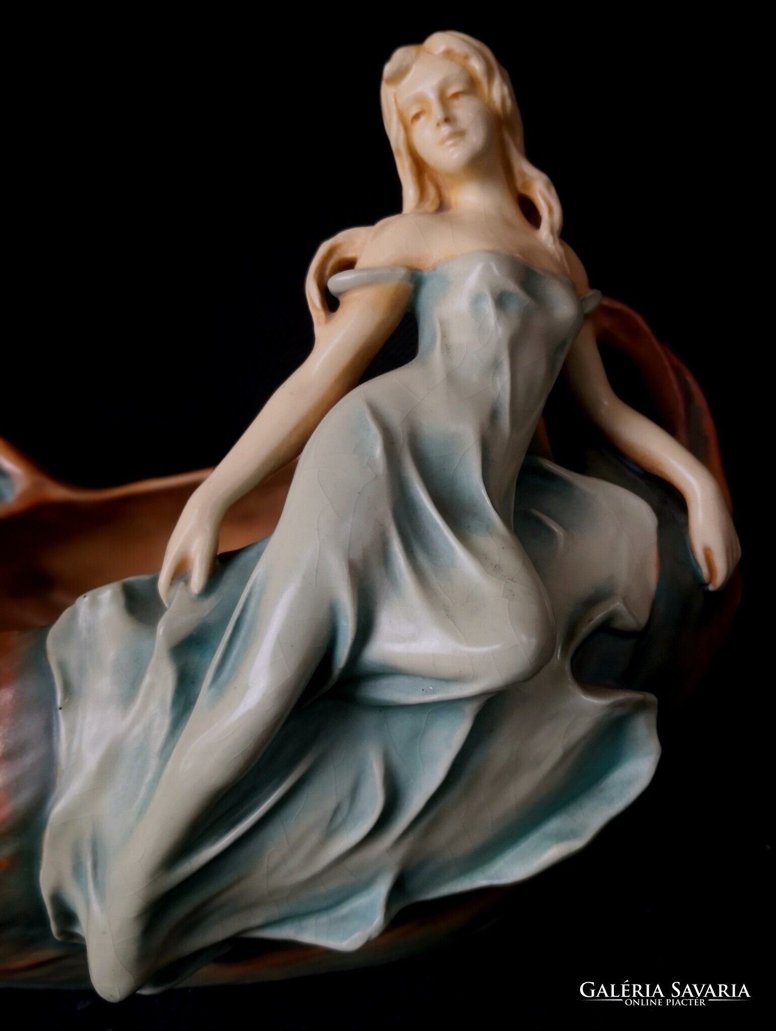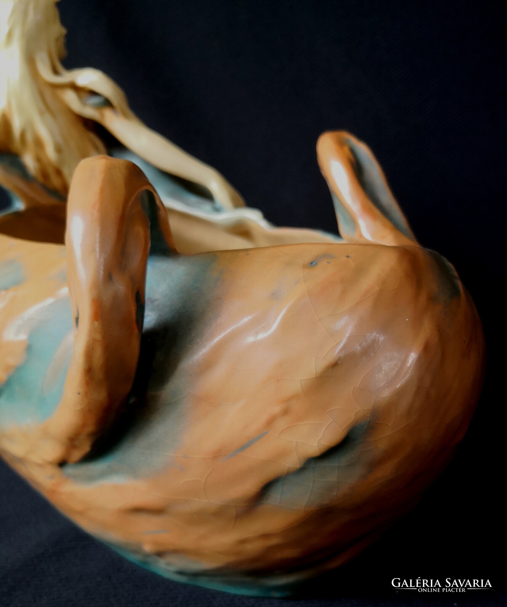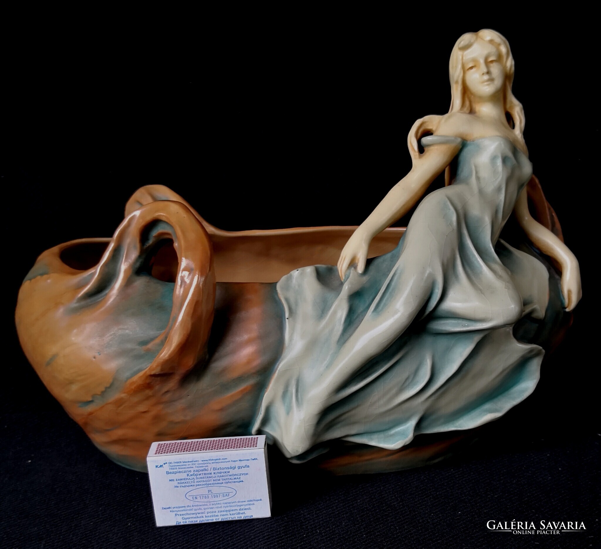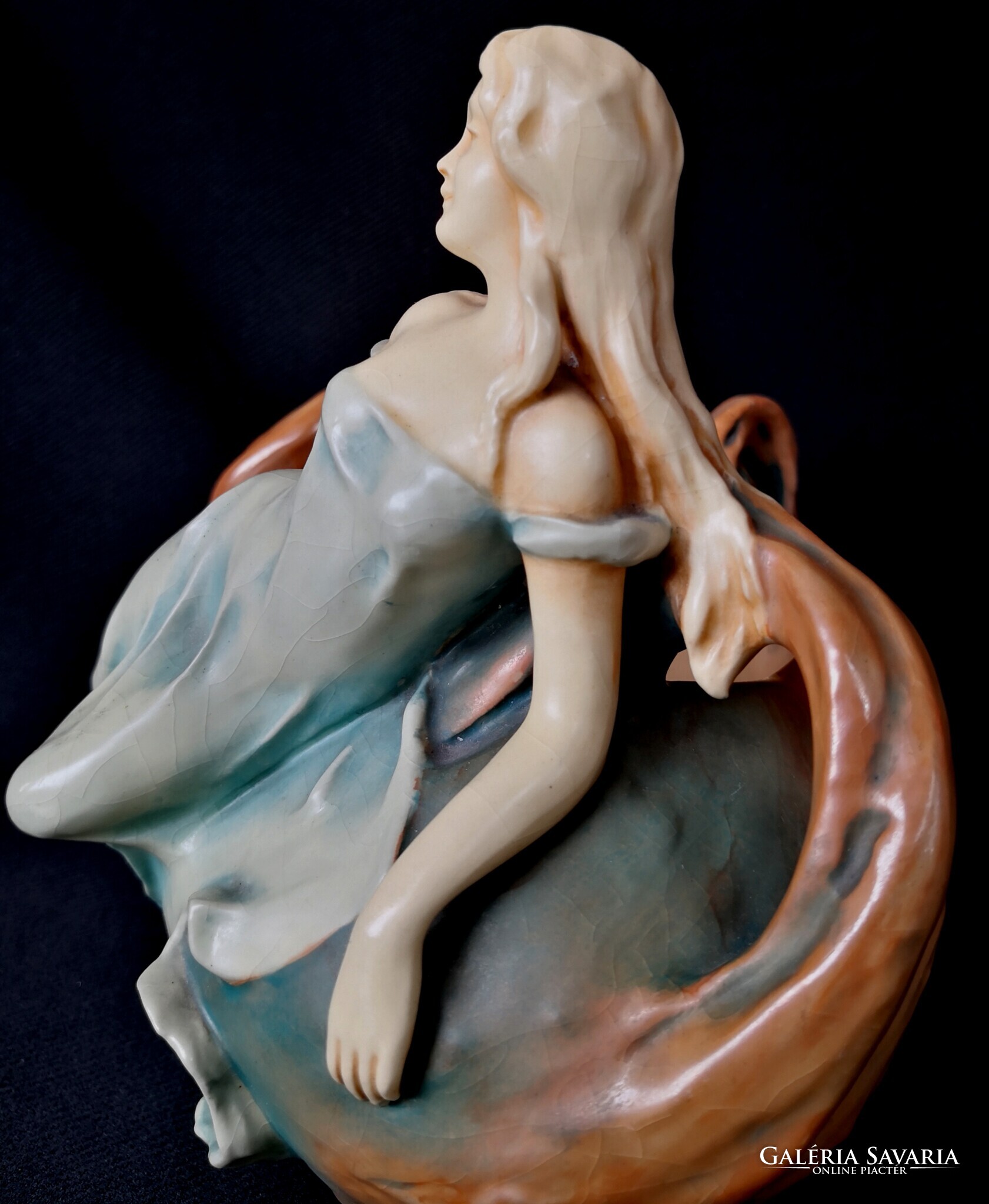 Eladásra kínálom ezt a gyönyörű Bernard Bloch, szecessziós stílusjegyű osztrák alkotást, matt zöld mázzal. A kínáló ívelt, hullámos díszítéssel, egy csodaszép női alakkal díszített. Szép kidolgozás. Enyhe mázrepedés előfordul, törés, restaurálás nyomát nem találtam. Alján jelzés: B.B., 7162-es formaszámmal, valamint a tervező, SCHWARZ jelzéssel. Jelzése alapján 1890-1919 között készülhetett. Ritka és gyönyörű, gyűjteményes darab.