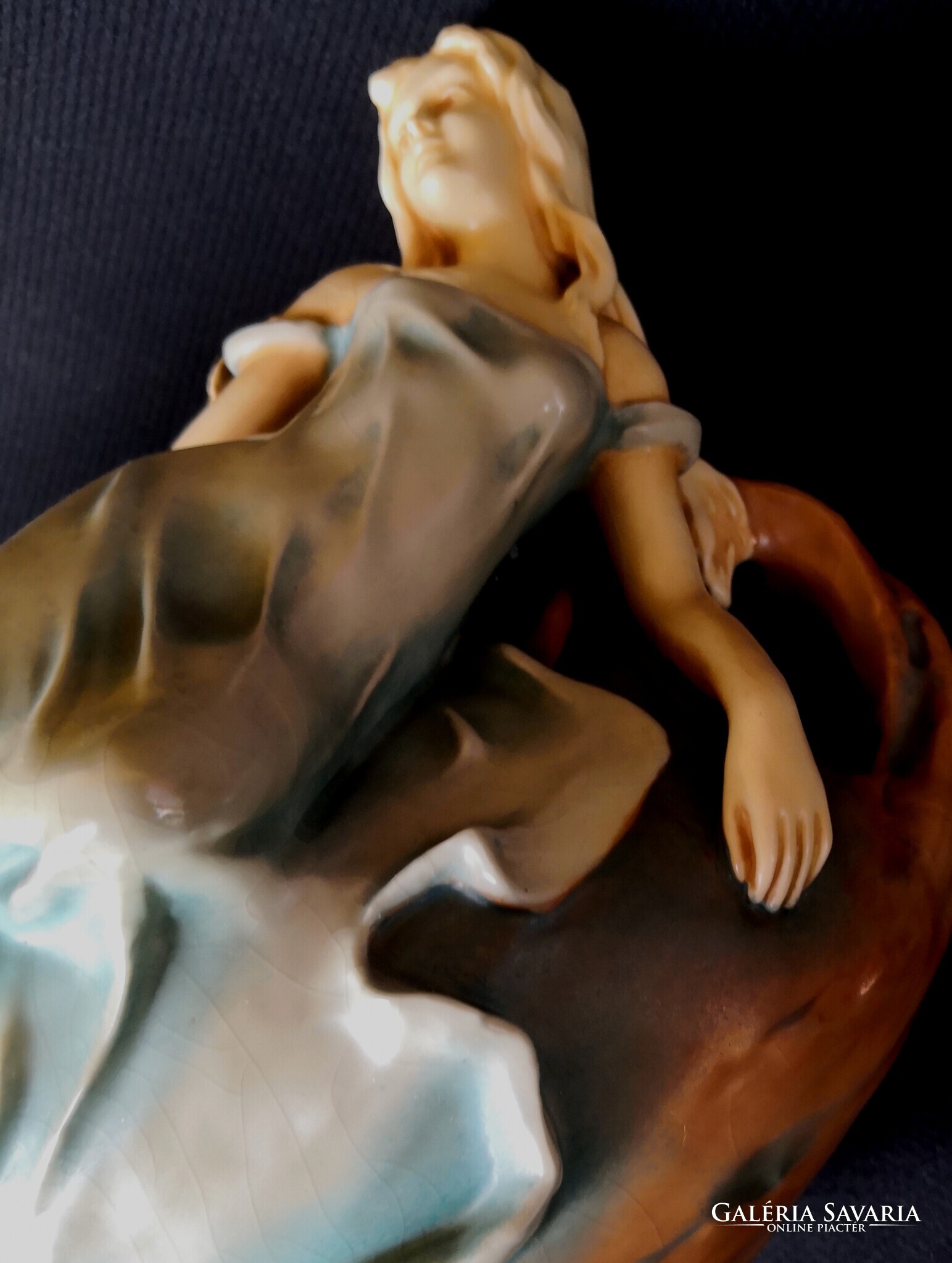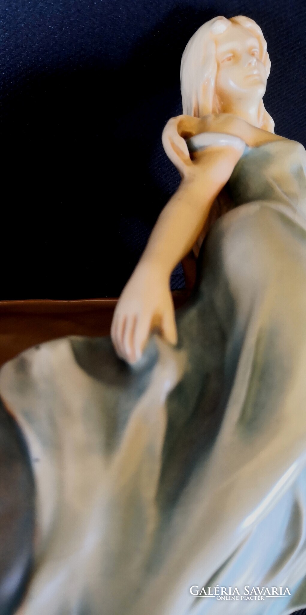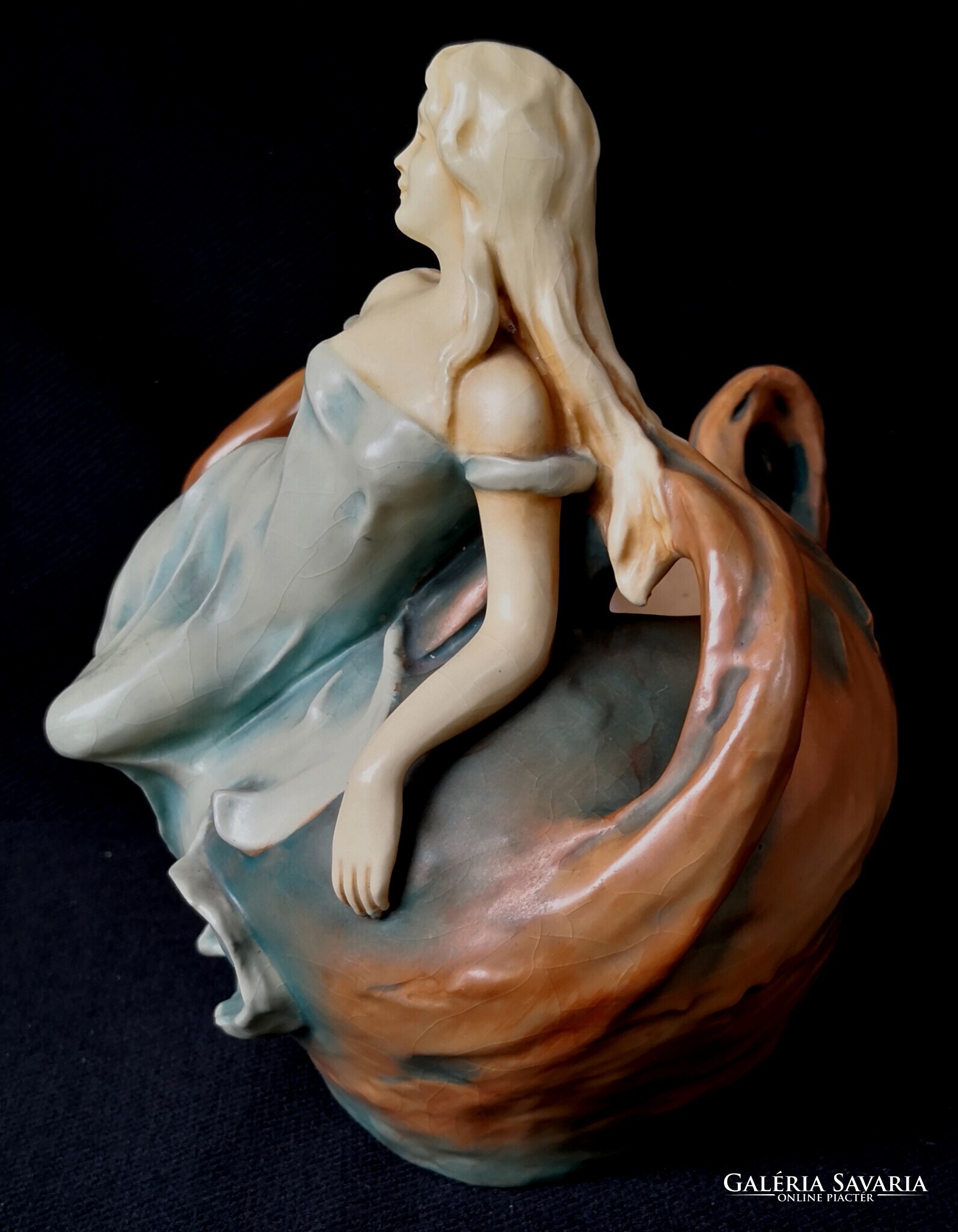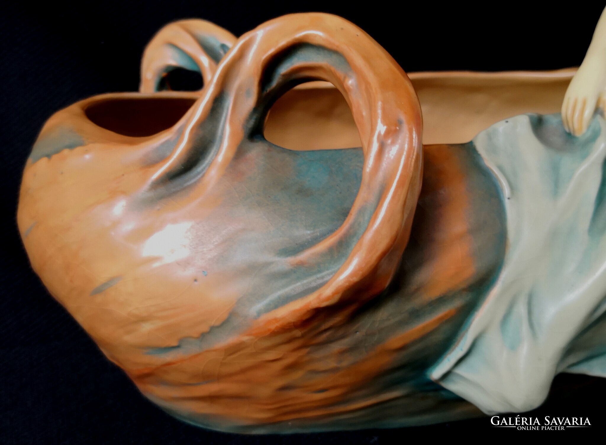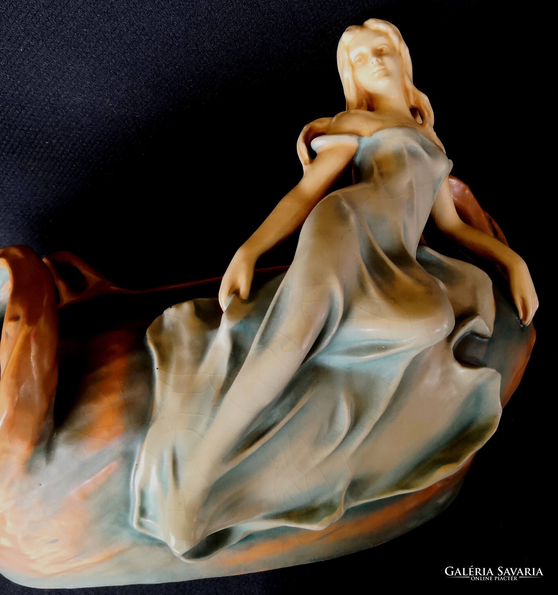 Eladásra kínálom ezt a gyönyörű Bernard Bloch, szecessziós stílusjegyű osztrák alkotást, matt zöld mázzal. A kínáló ívelt, hullámos díszítéssel, egy csodaszép női alakkal díszített. Szép kidolgozás. Enyhe mázrepedés előfordul, törés, restaurálás nyomát nem találtam. Alján jelzés: B.B., 7162-es formaszámmal, valamint a tervező, SCHWARZ jelzéssel. Jelzése alapján 1890-1919 között készülhetett. Ritka és gyönyörű, gyűjteményes darab.