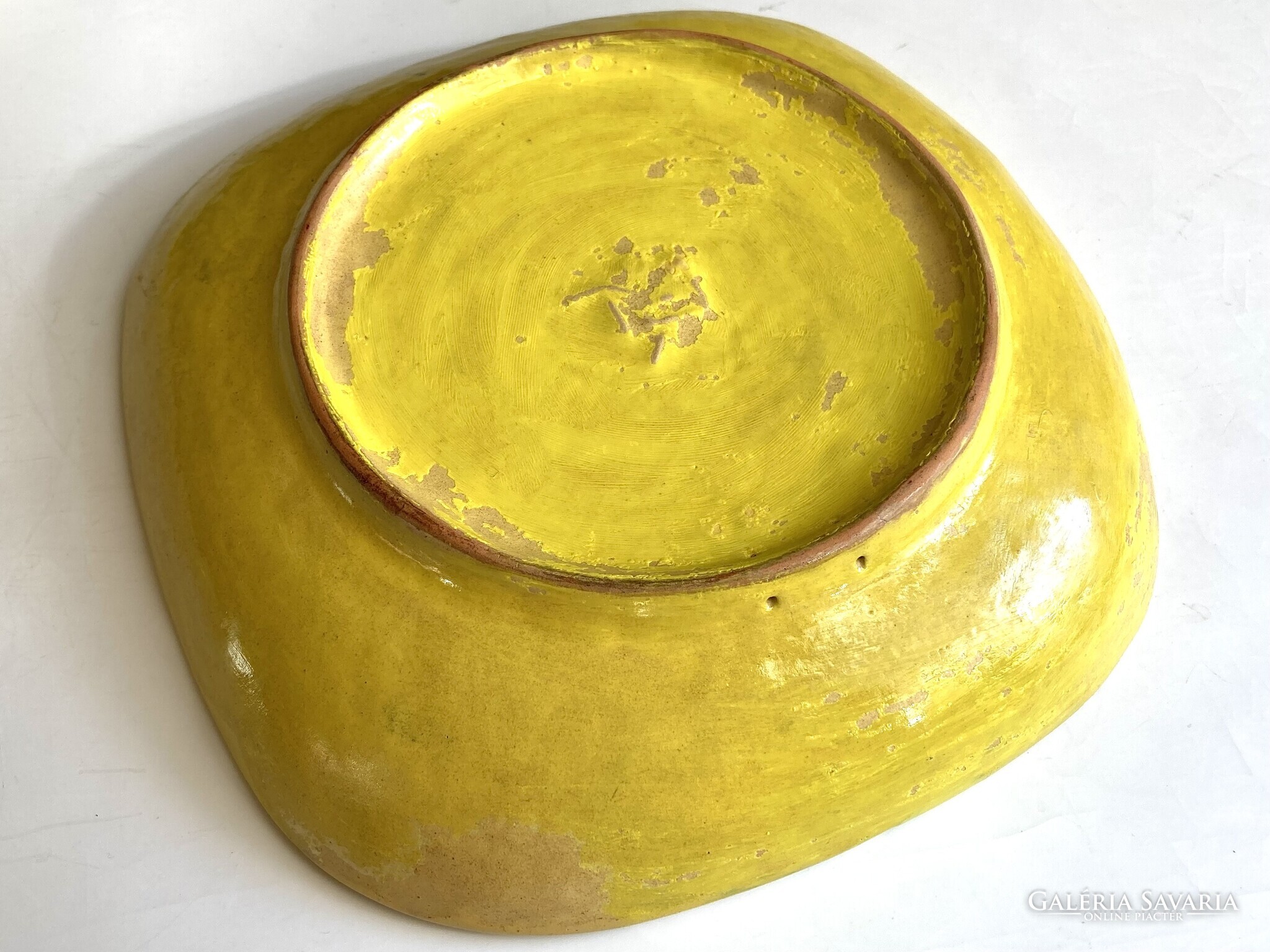 A tál hátoldalát feltételezhetően korábban átfestették, eredeti mustársárga színe az élénkebb sárga máz alatt látható. Könnyen restaurálható. A peremén van egy gombostűfejnyi mázhiány.