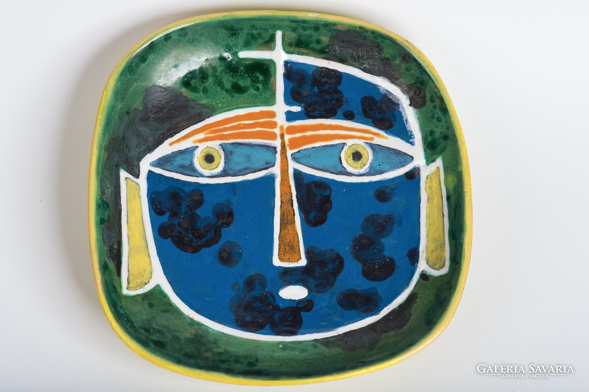 1965 körül készült, kézzel festett kerámia. Absztrakt figurális ábrázolás.