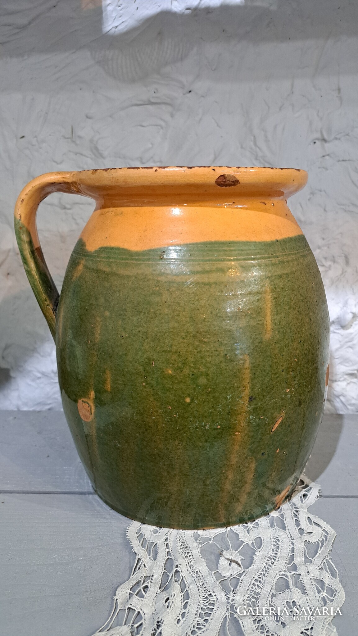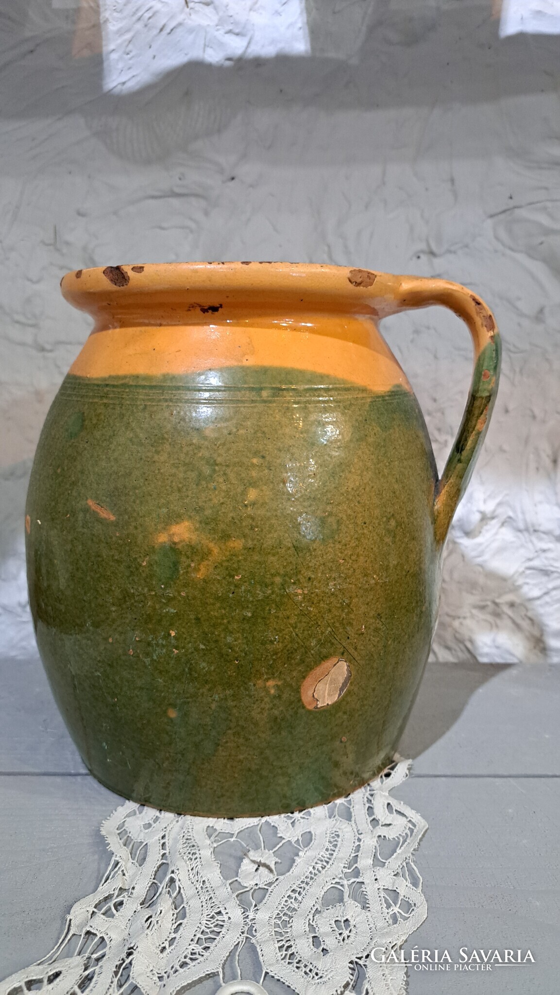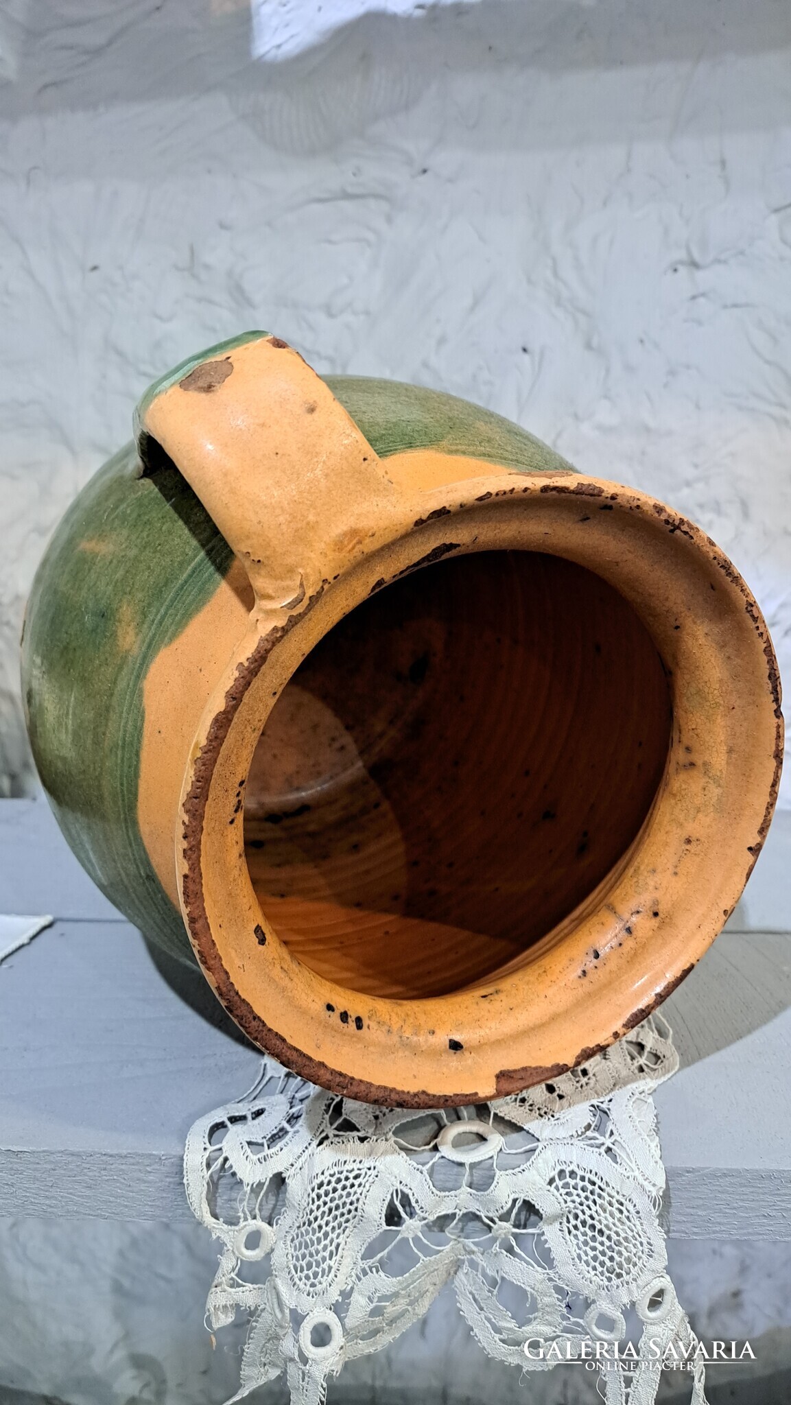 Nagyméretű zöld mázas köcsög, kerámia edény, apróbb lepattogzásokkal
